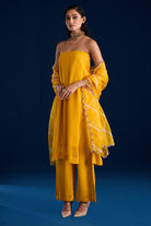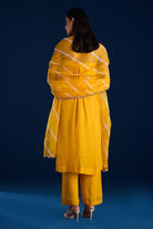 Induce a sense of style to your wardrobe with our georgette three piece co-ord set with hand tied and dyed Leheriya organza dupatta.Made in vegan georgette.