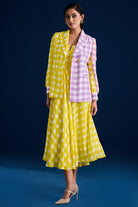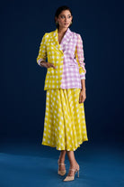Edgy yet easy-going feminine romantic essence for a breezy day look.Hand block printed by artisan in Jaipur, Rajasthan.Made in Vegan Crepe. The Blazer is double breasted with a notch collar with front buttoned closure.It has two front welt pockets and full sleeves with ribbed cuffs.The Dress has fit and flare style and wire support for a cinched fit.It has adjustable tie up straps to the neck to make the fit perfectly highlighted with hand made crochet flowers.It comes with bust cups, elasticated back and side seam zipper for that added comfort.