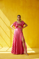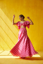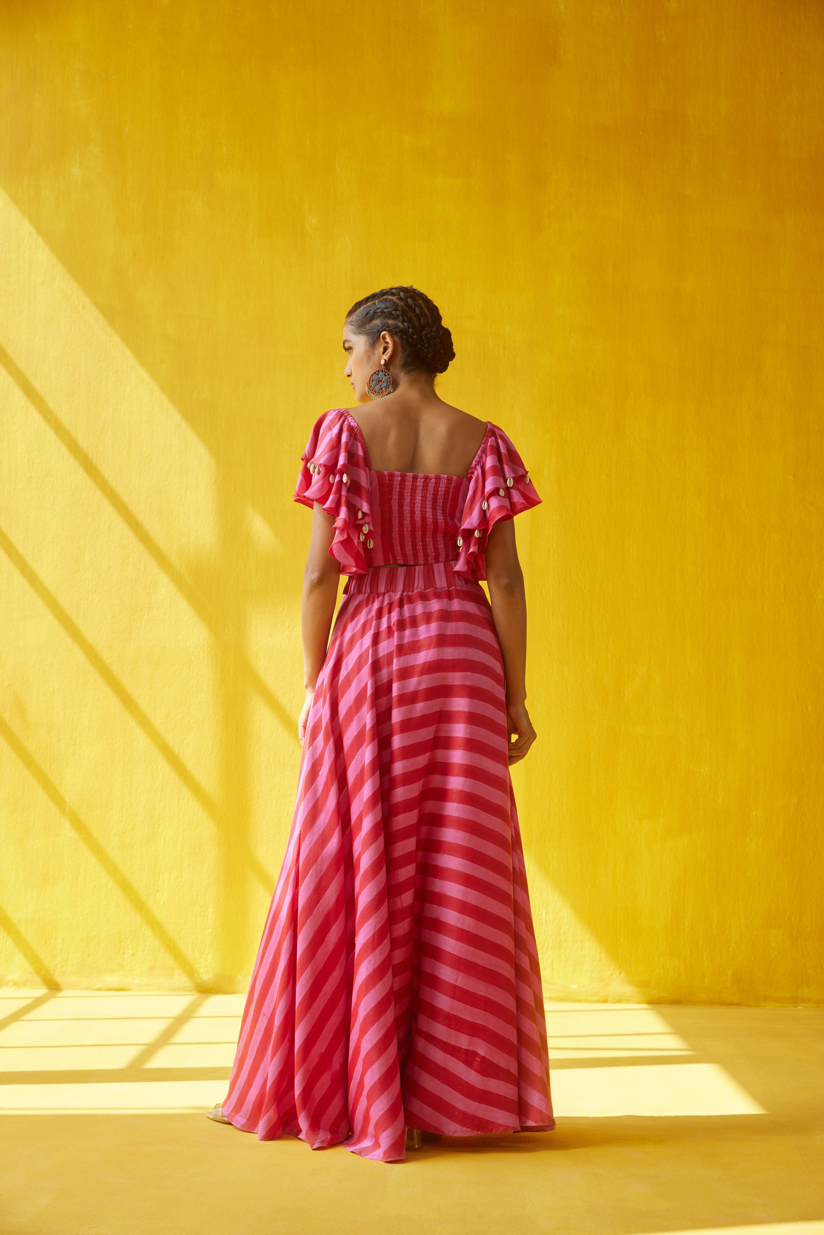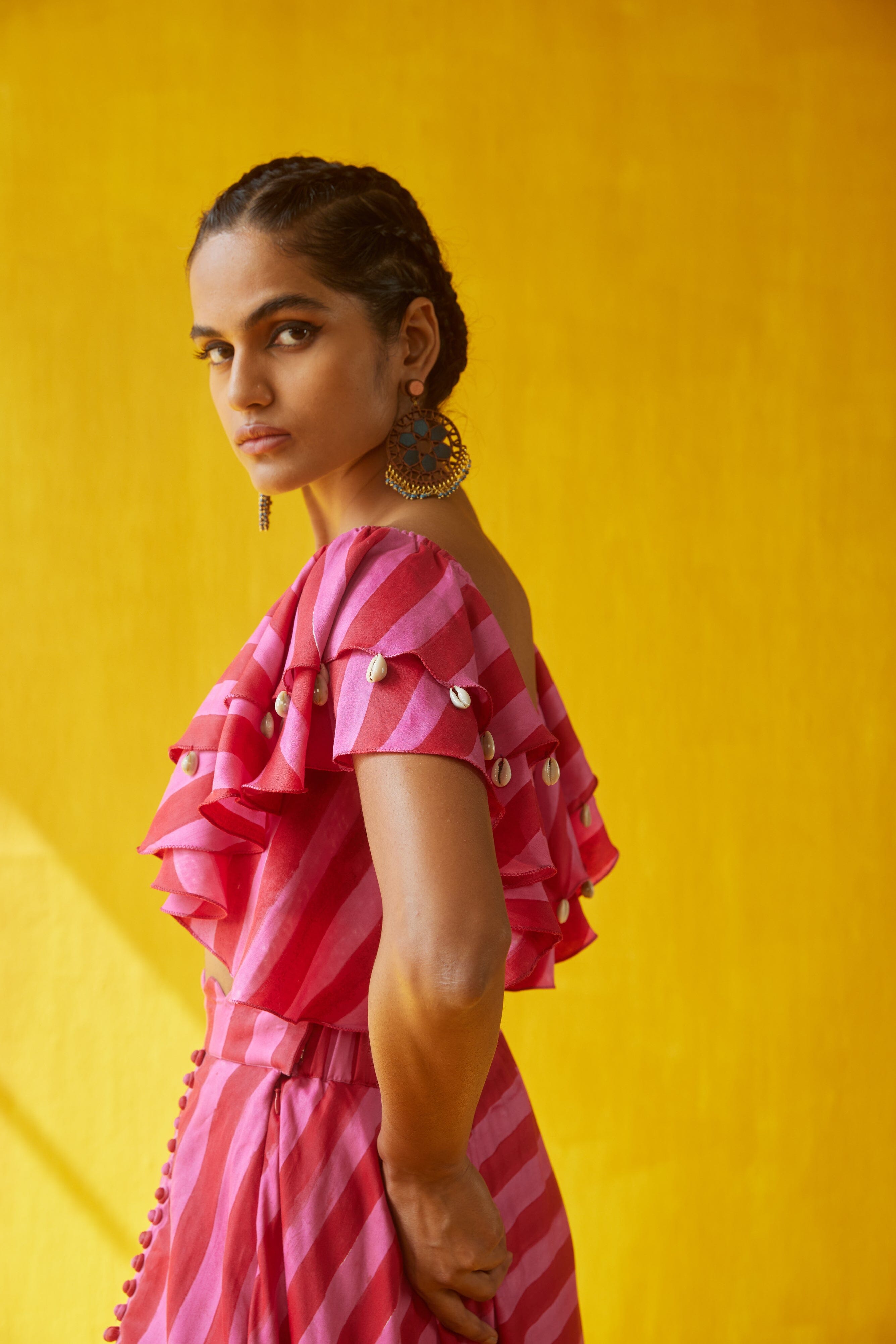 The skirt features a front slit, button up for that sophisticated look, or button down for some leg show. It has an elasticated back waist, side seam zipper and welt pocket for that added comfort. The top has a twisted knot detail at the center front and ruffle sleeves,highlighted with cowrie shells.