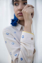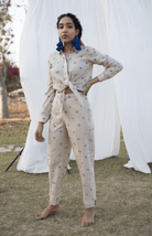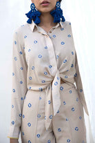 It’s a season of co-ords. Our Bandhej shirt features a beautiful hand tie and dye print, shirt collar, placket and cuffs highlighted with contrast crochet lace, a tie up detail in the front and a comfort fit.