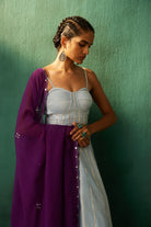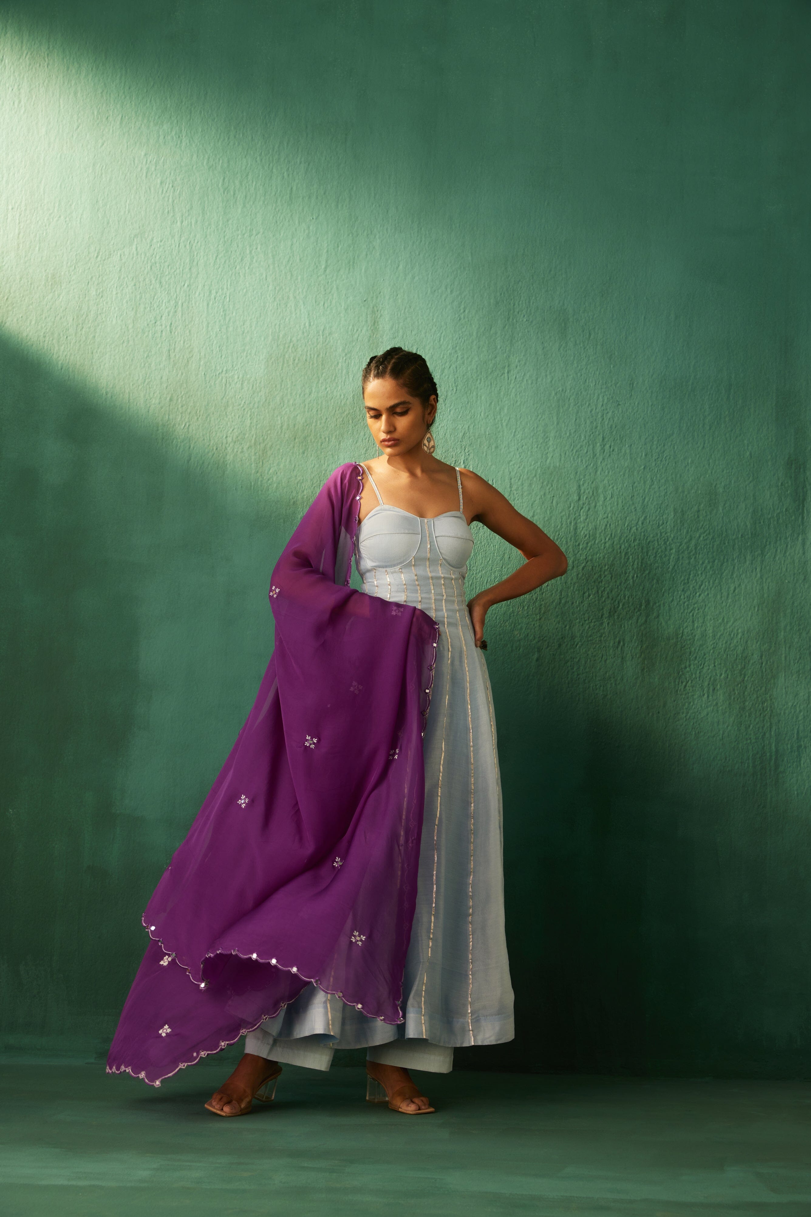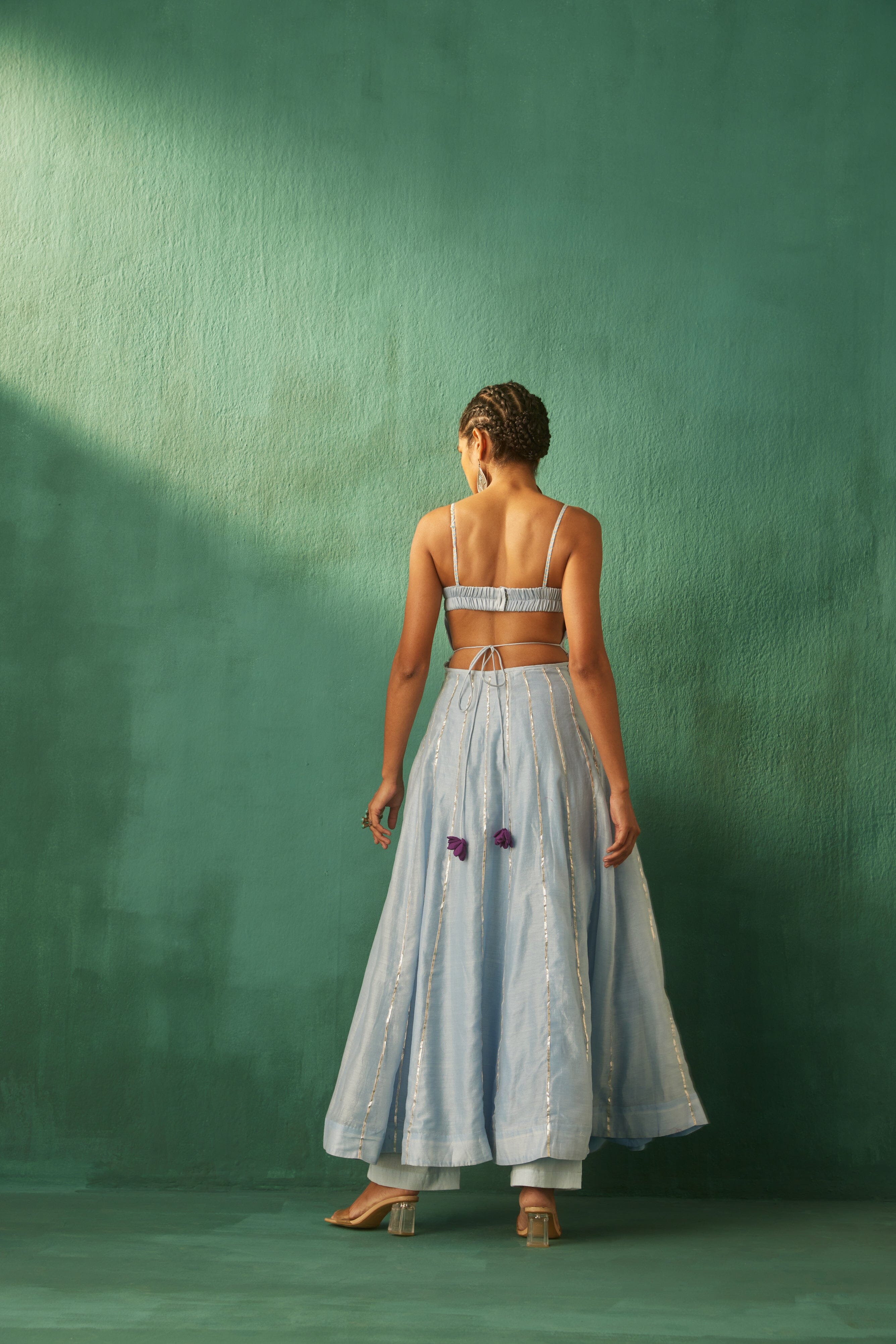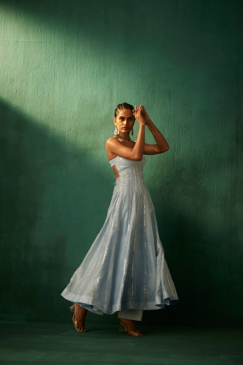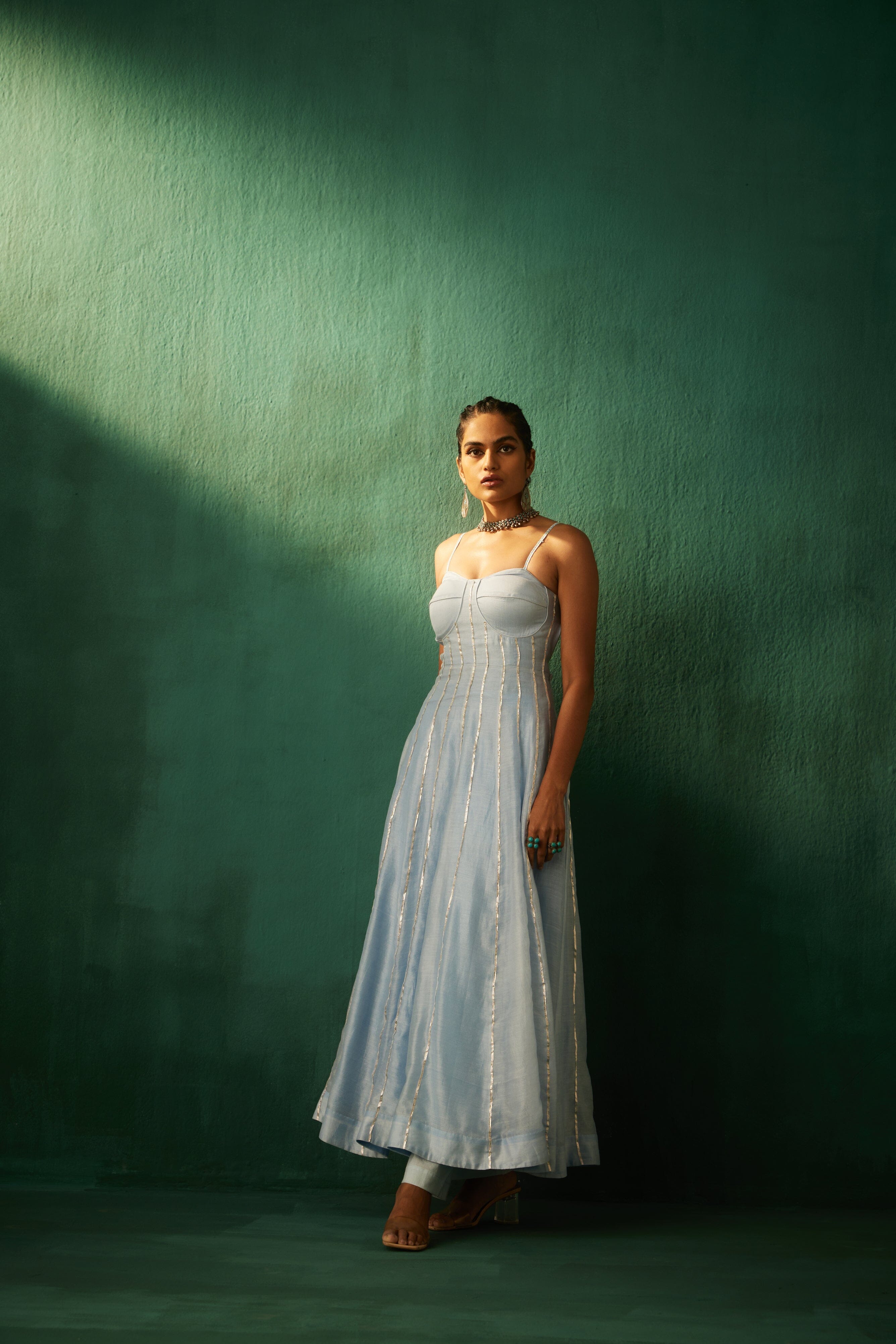 This light blue Anarkali is highlighted with a sweetheart neckline and silver metal gota.