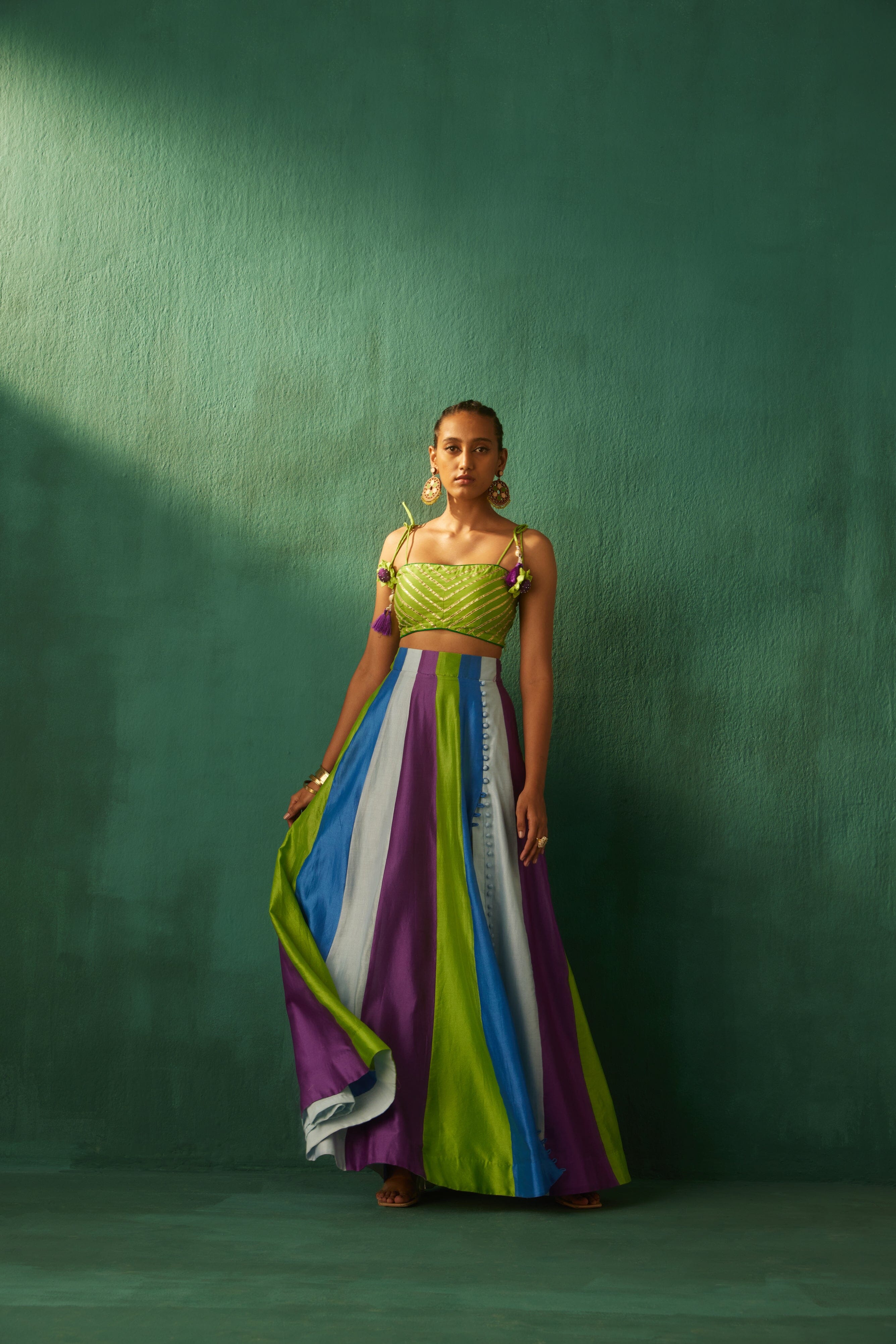 Skirt is highlighted with an interesting color blocking.