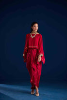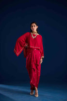 Made in soft modal satin.The skirt features an interesting drape at the center front and a back zipper. The top features a adjustable boat neckline and a kaftan fit for the festive yet comfortable look.The top is highlighted with metal gota and gota cuffs for the enhanced look.Styling Tip- Pair it with a long layered necklace and midi rings for a winning look.