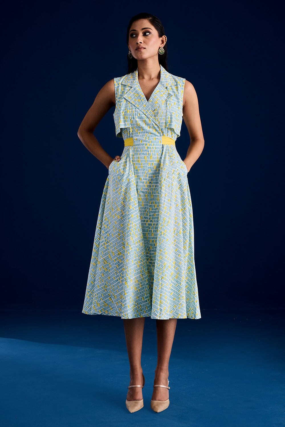 A simple, yet elegant design that will be sure to catch your eye. Featuring a fun blockprint, flared trench dress inspired by trench jacket.Hand block printed in Jaipur, Rajasthan.Made in 100% cotton.The dress features a double-breasted lapel collar and a contrast belt for a cinched waist.Closure: front zipper and button.It also features two side pockets
