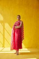 Dupatta features an interesting handblock printed stripes, highlighted with boho coins and embroidered border.