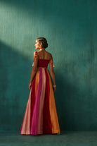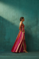 Fashionably made of soft Chanderi silk, this lehenga features an eye-catching color blocking and details of gold metal gota. The skirt has a side seam zipper and inseam pockets, while the top is adorned with gold metal gota, bright orange piping, and a tie up detail with handmade flowers and tassels at the shoulder. For added comfort, it has bust cups and an elasticated back. Complete with a beautiful organza dupatta, accented with delicate hand embroidery, contrasting handmade tassels, and cowrie shell
