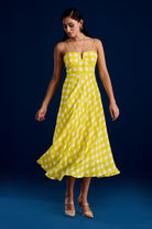 Edgy yet easy-going feminine romantic essence for a breezy day or night out look.Hand block printed in Jaipur, Rajasthan.Made in Vegan Crepe. The Dress has fit and flare style and wire support for a cinched fit.It has adjustable tie up straps to the neck to make the fit perfectly highlighted with hand made crochet flowers.It comes with bust cups, elasticated back and side seam zipper for that added comfort.