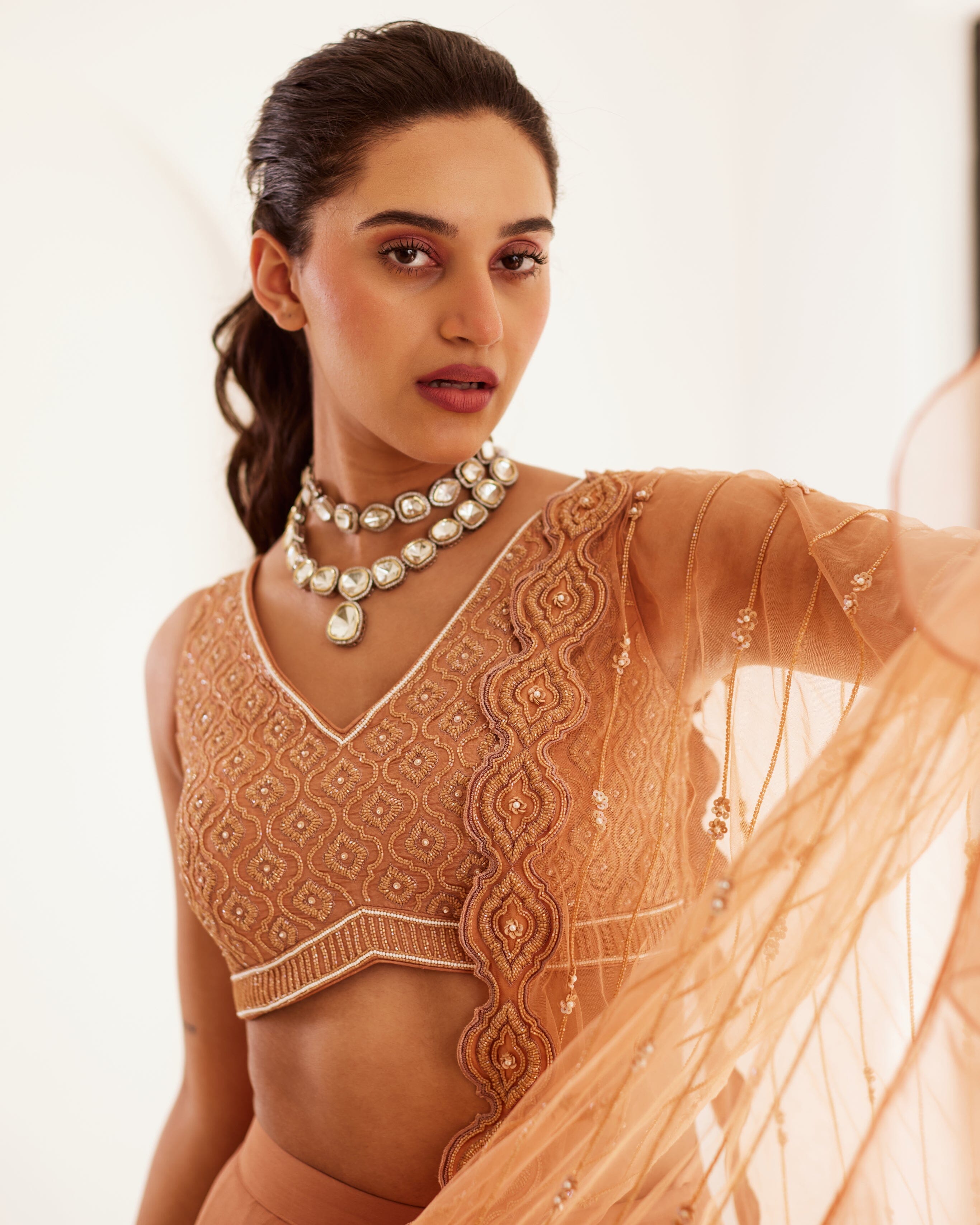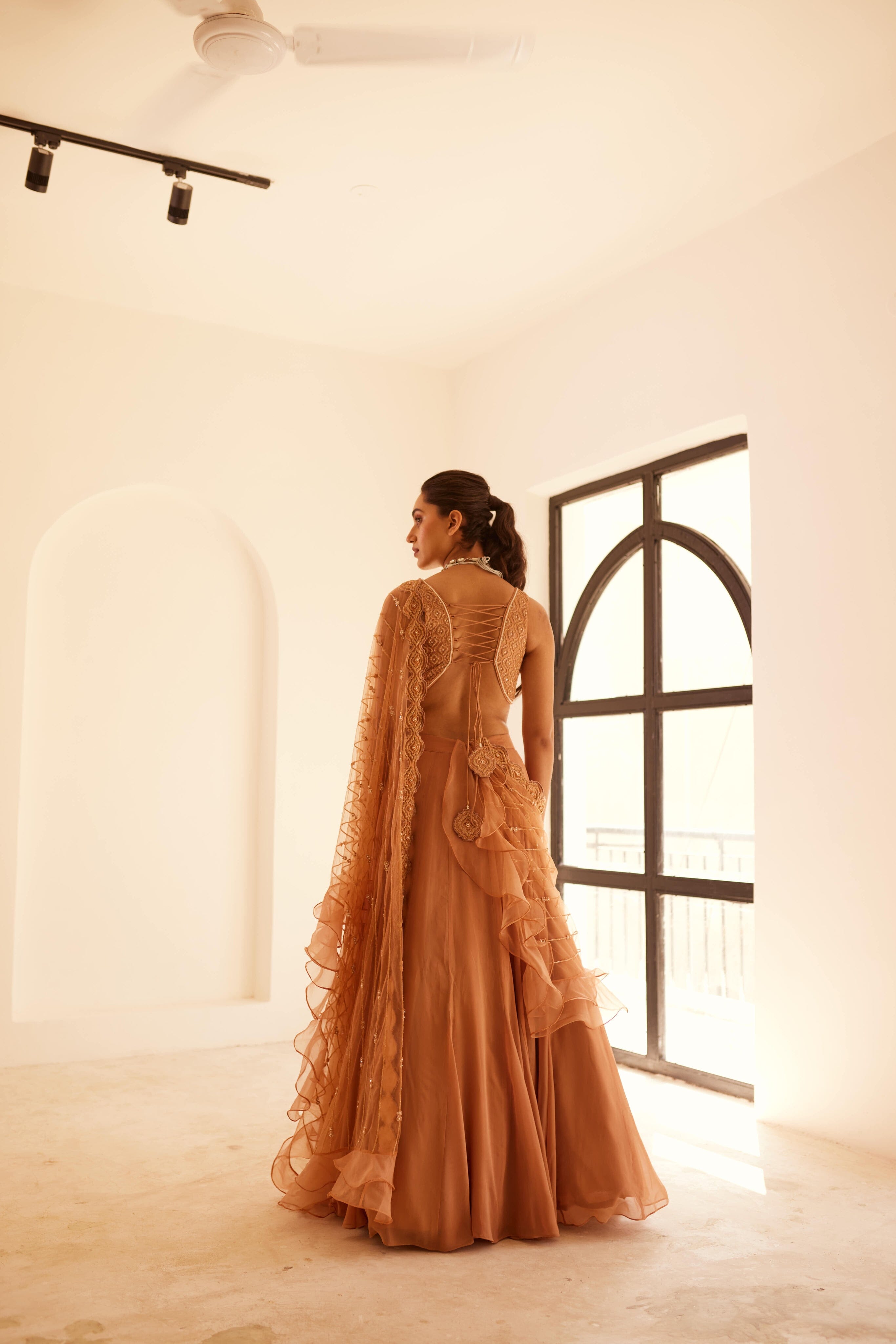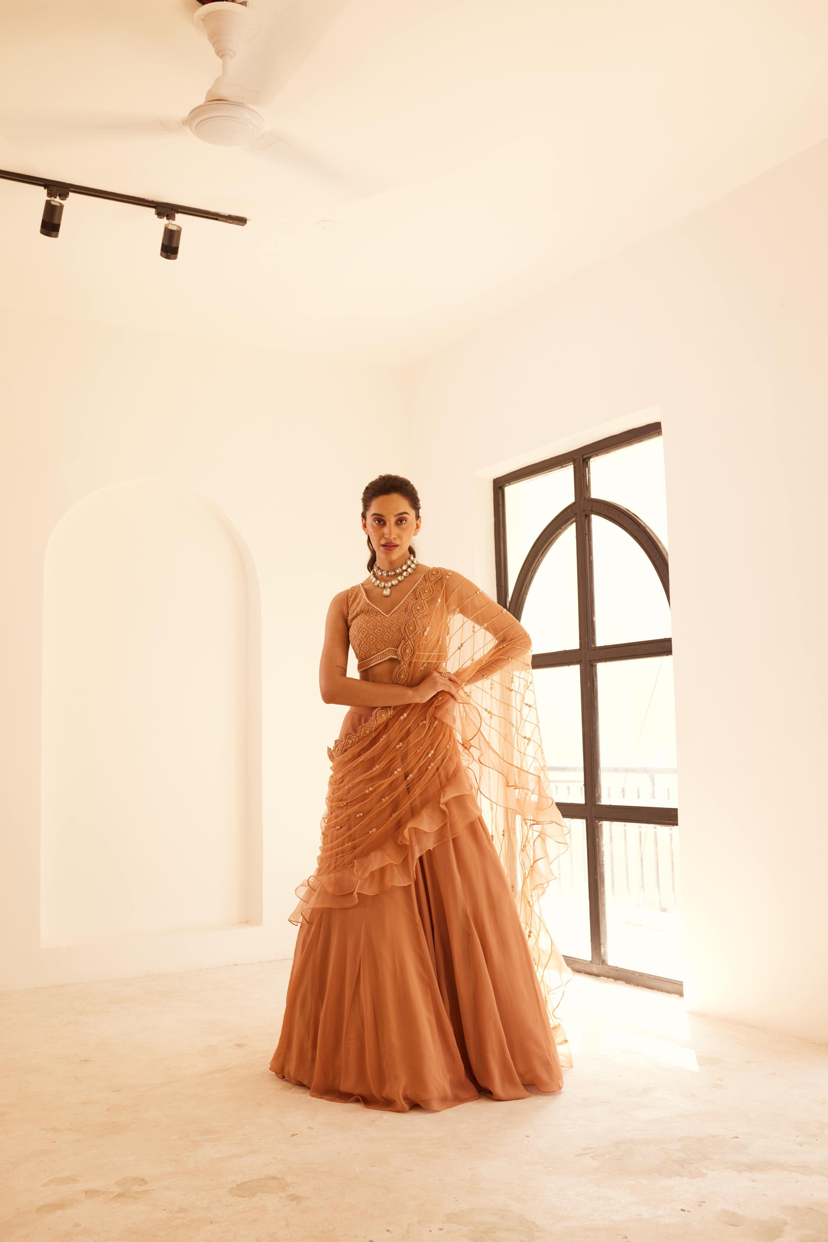 Beige Lehenga Saree Set With Net Frill Dupatta