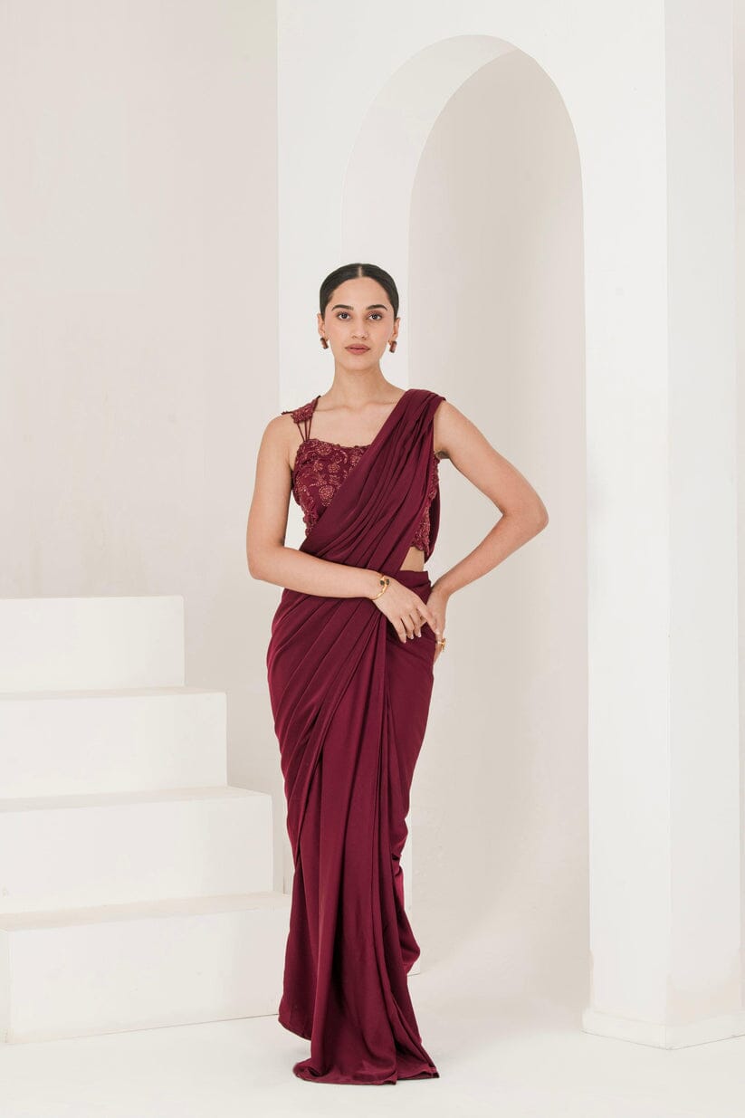 Wine Hand Embroidered Pre Stitched Saree ( Set of 2 )