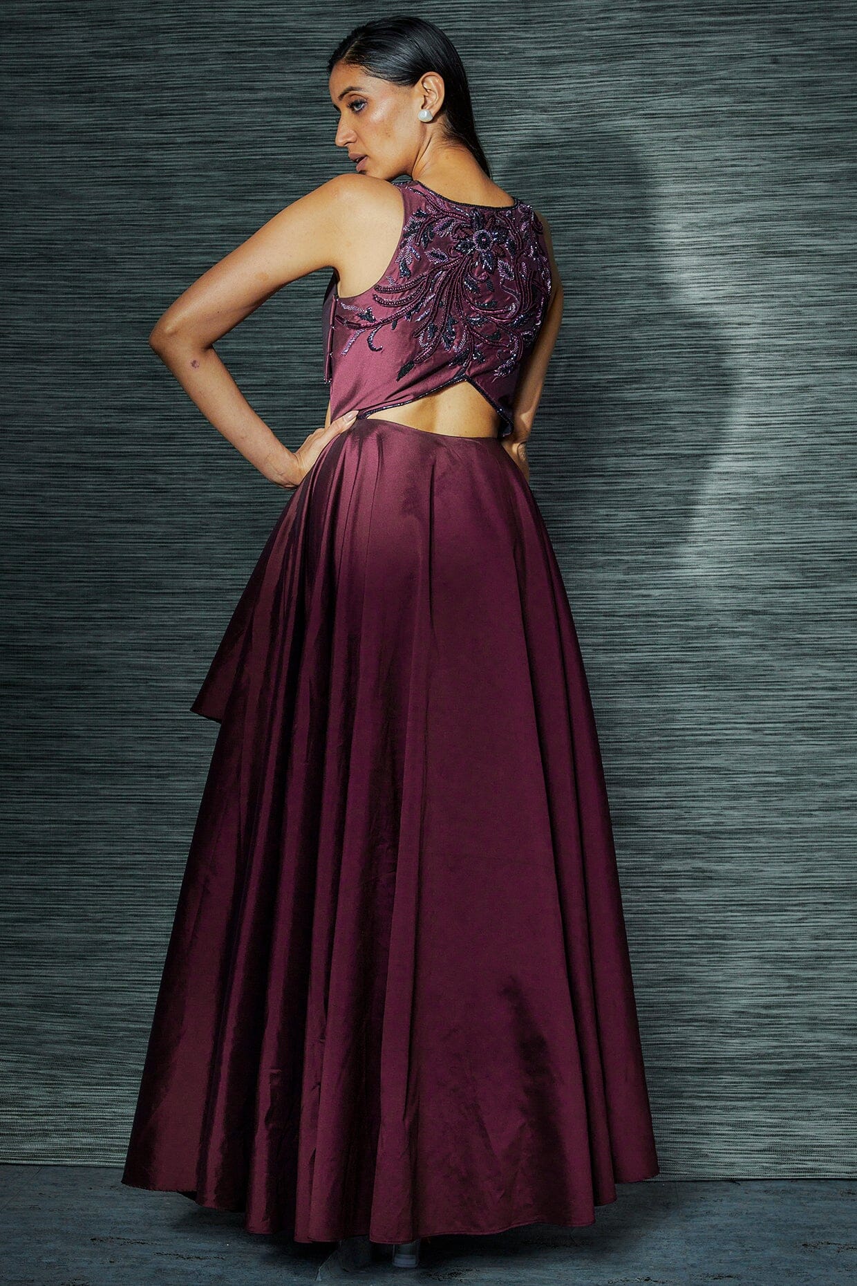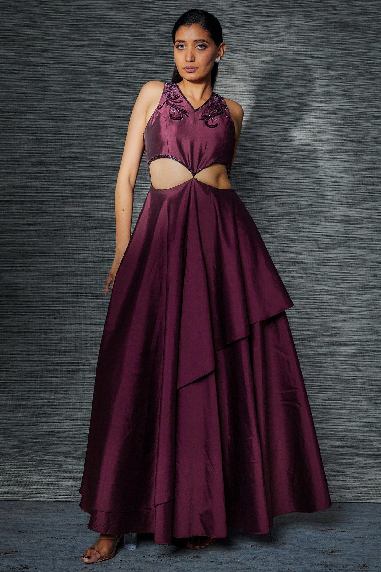 Wine Layered Cocktail Gown With Embroidery