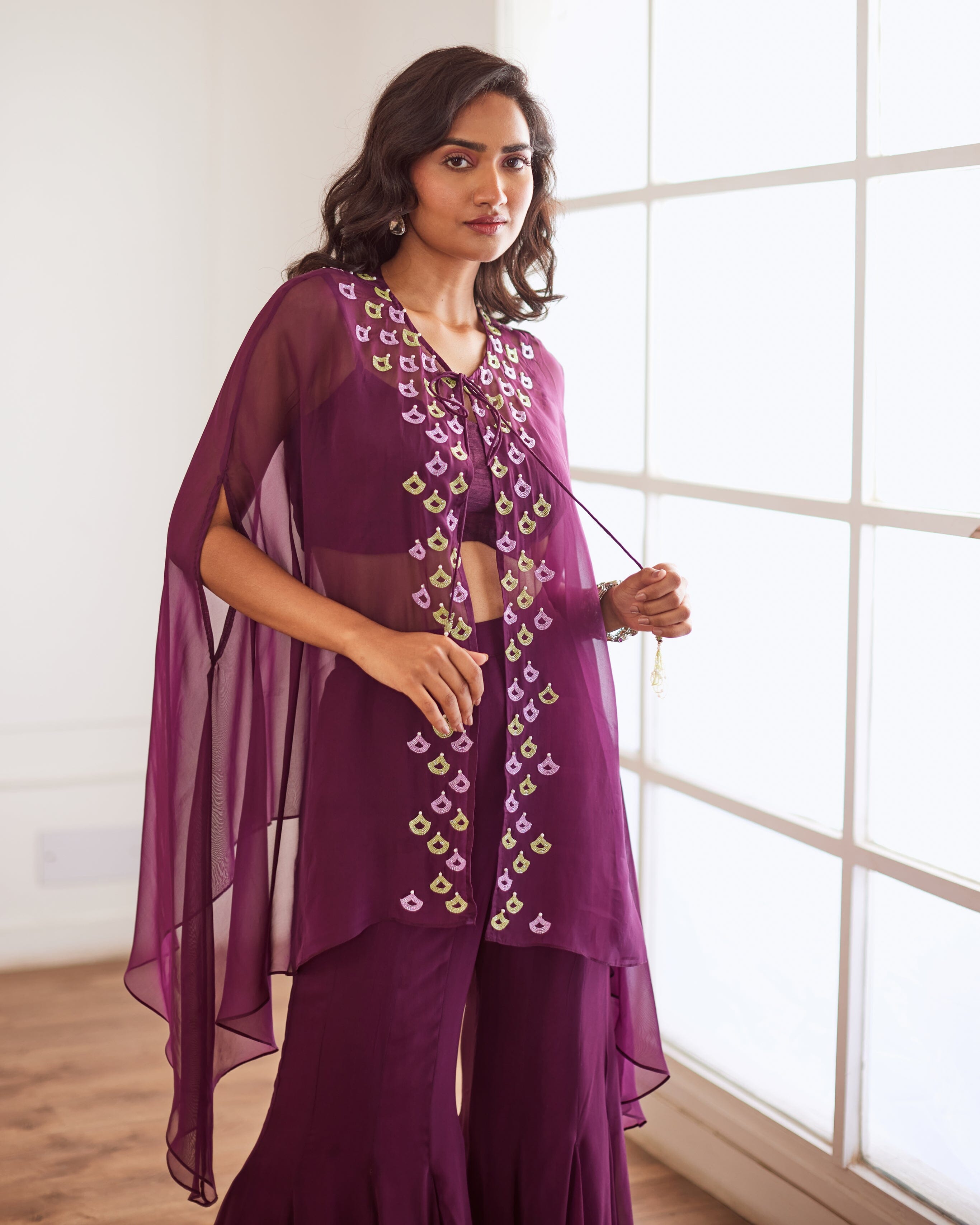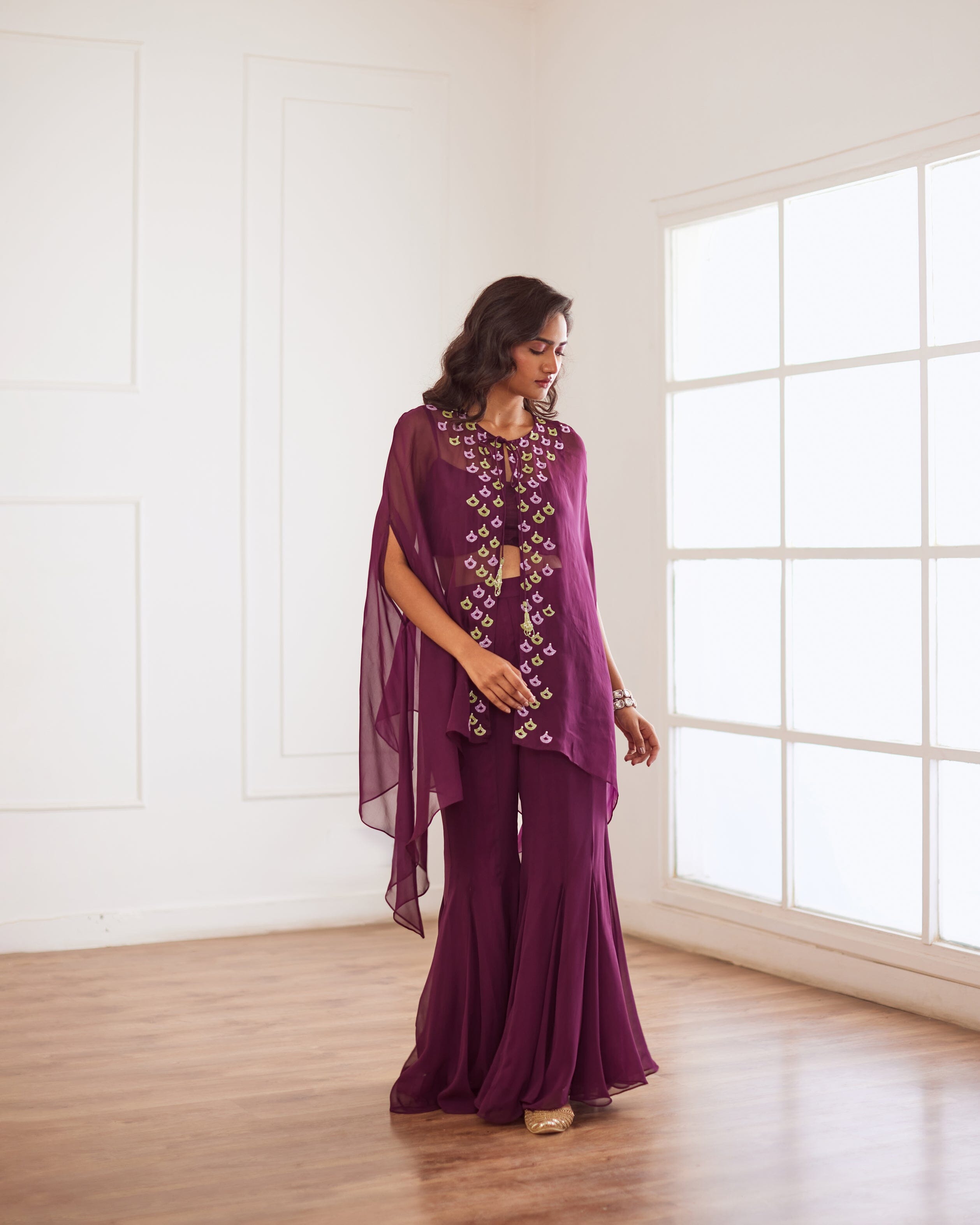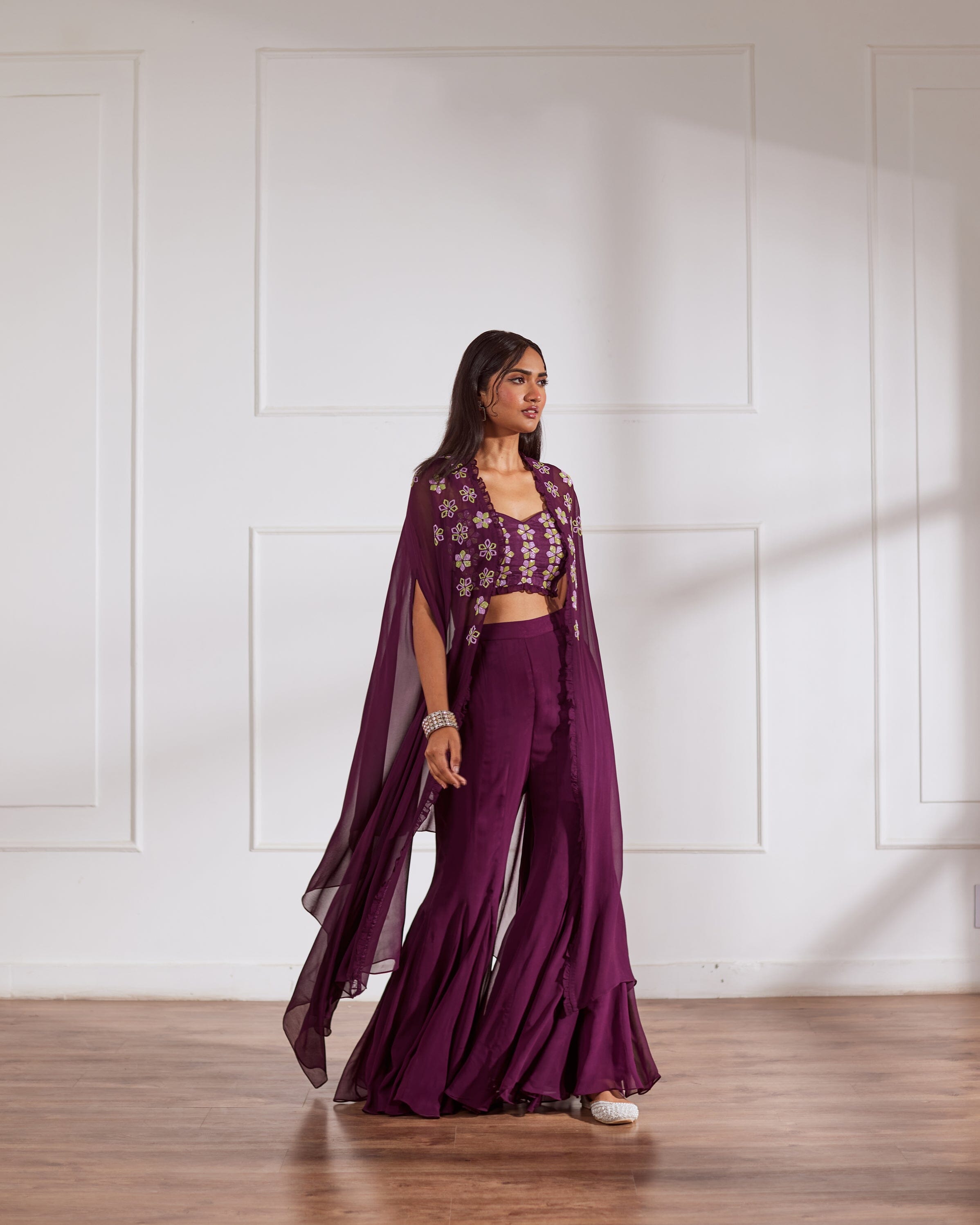 Wine Croptop And Sharara With Cape