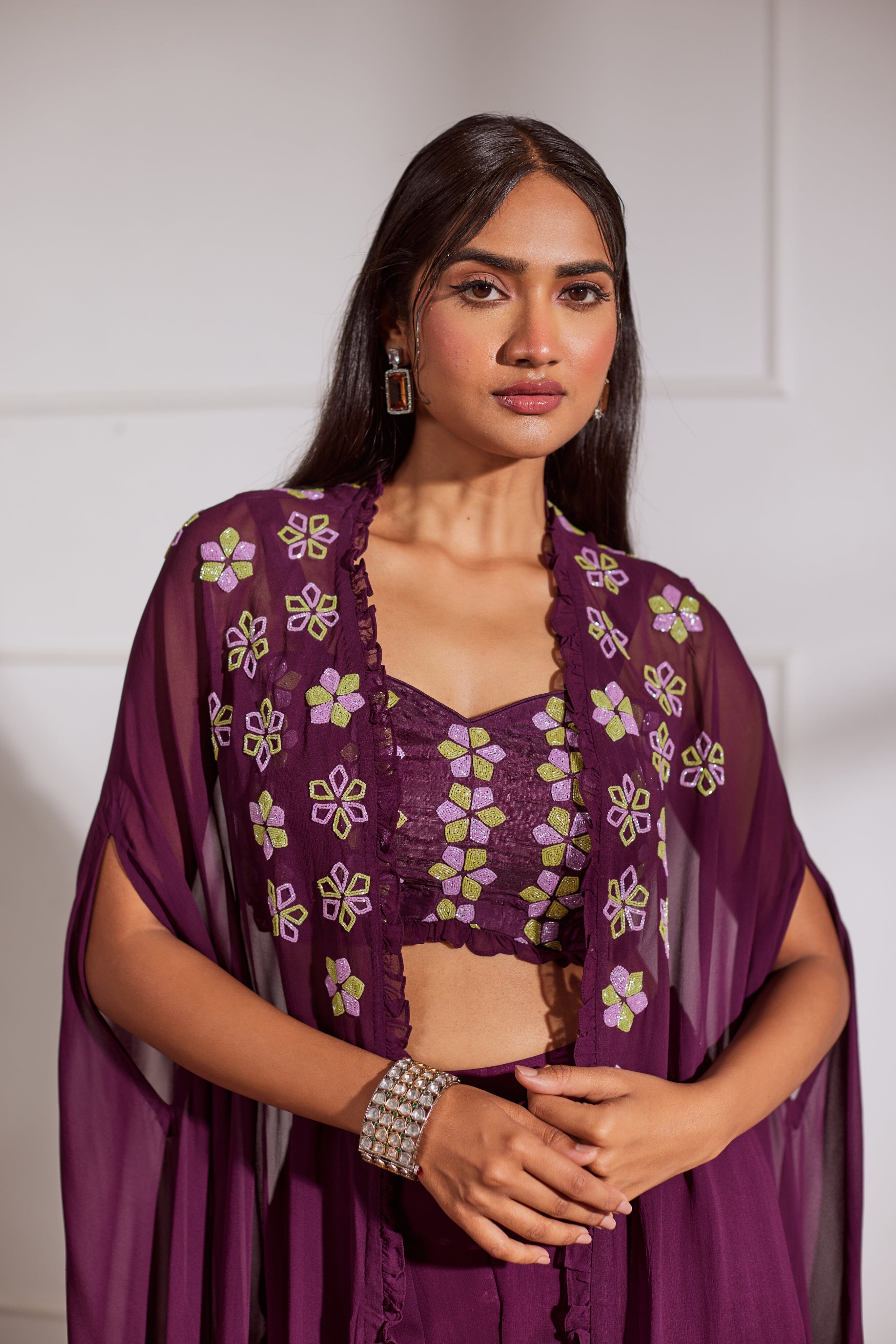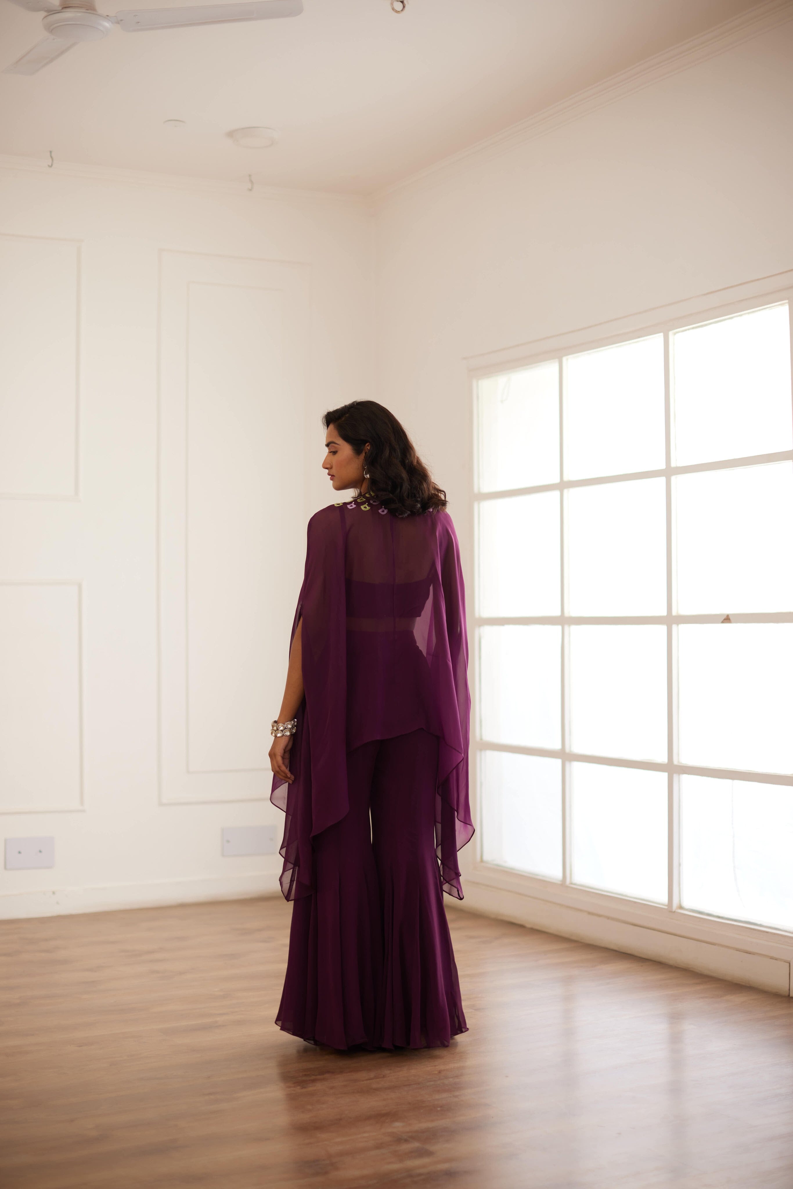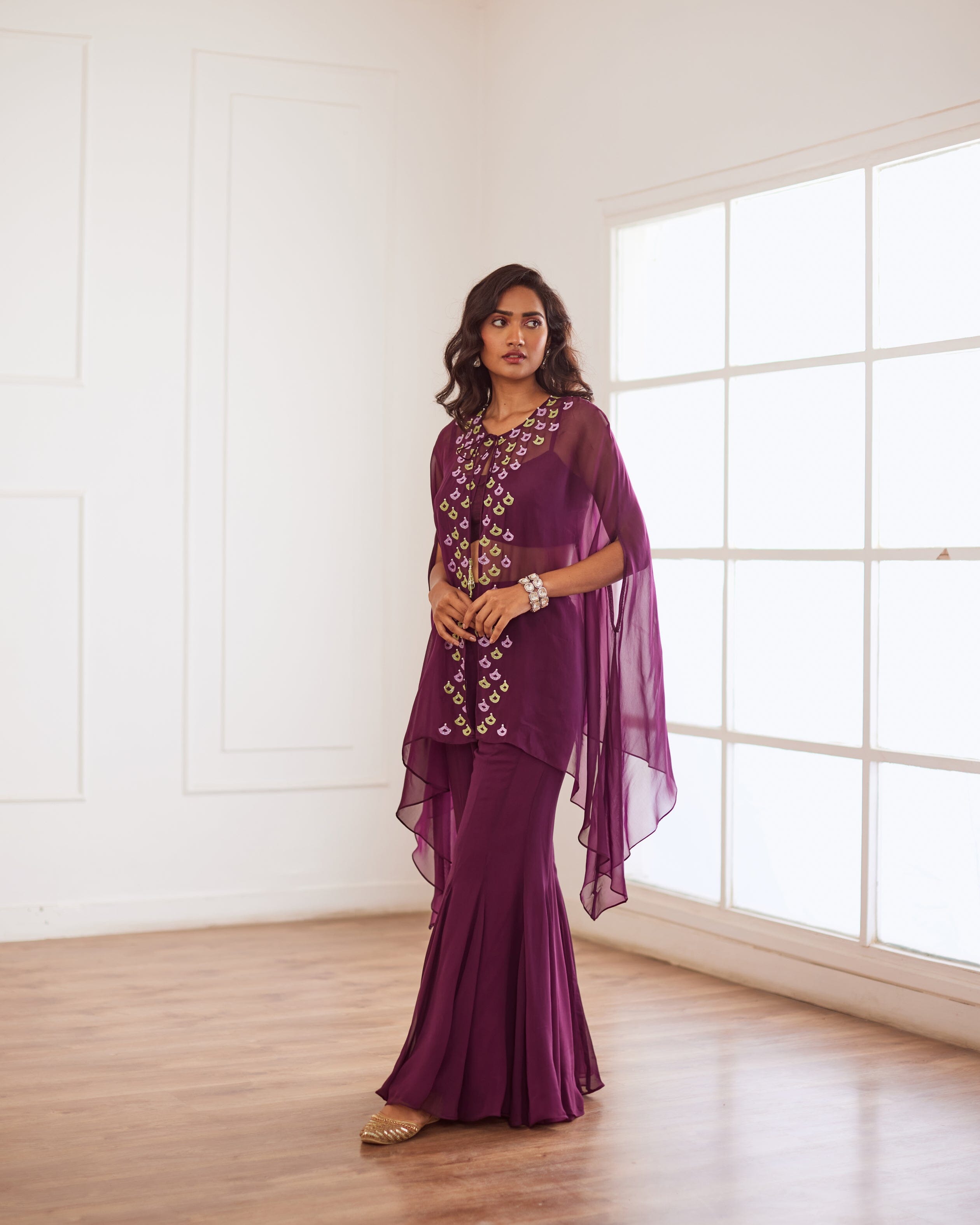 Wine Croptop And Sharara With Cape