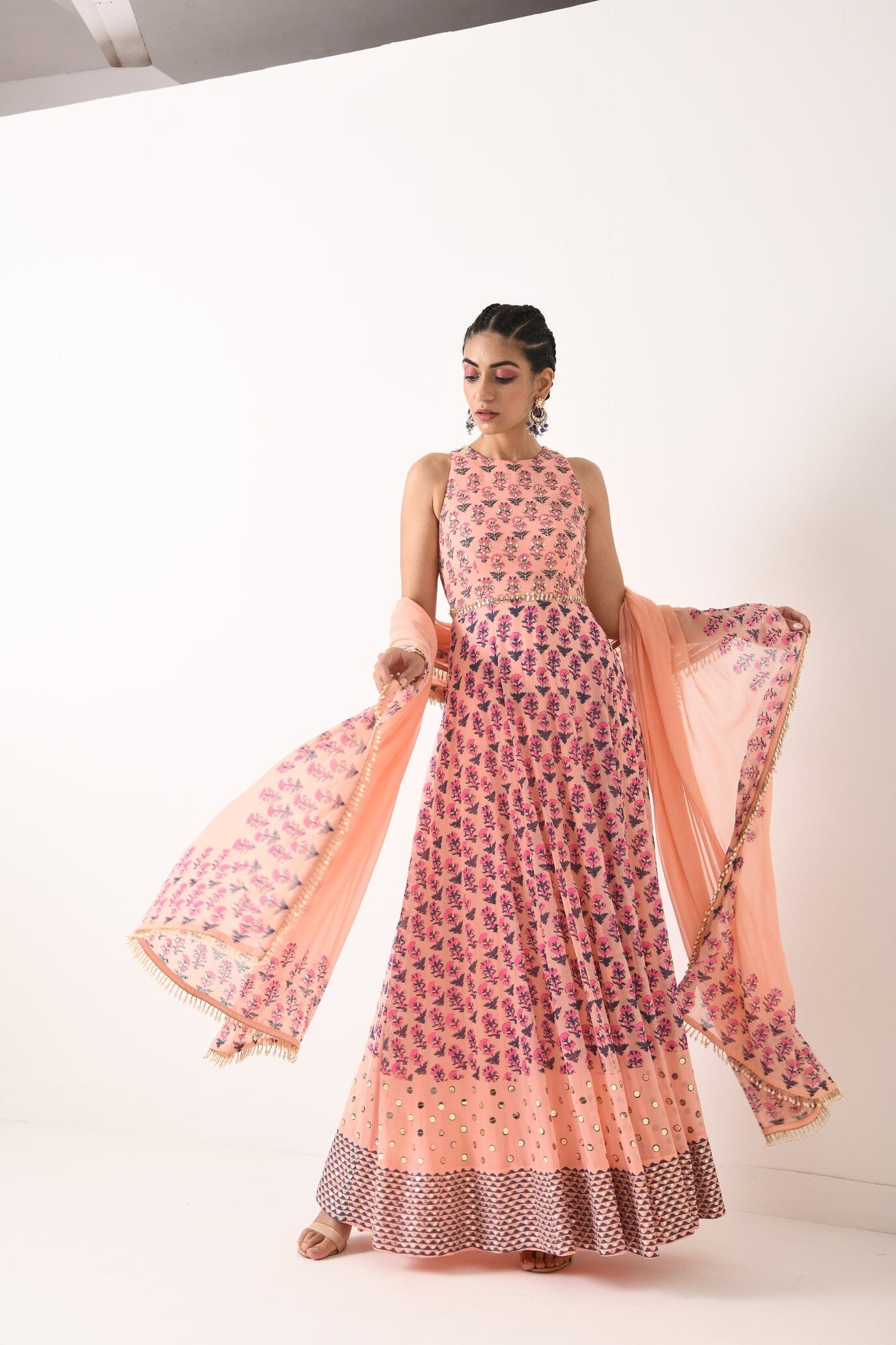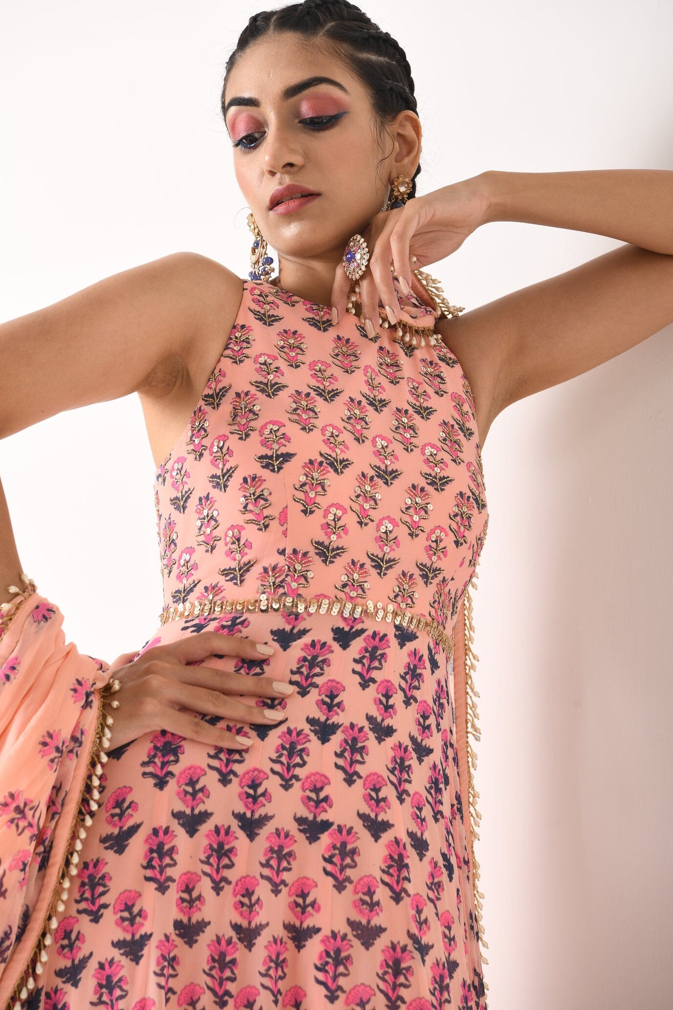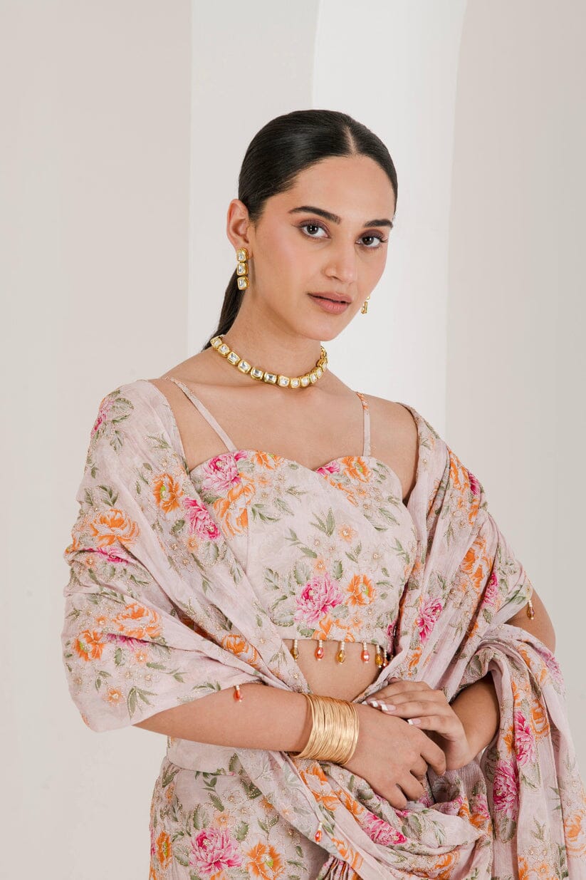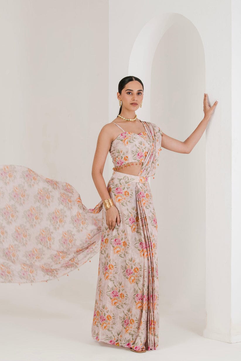 Blush Pink floral print pre stitched Saree (Set of 2)