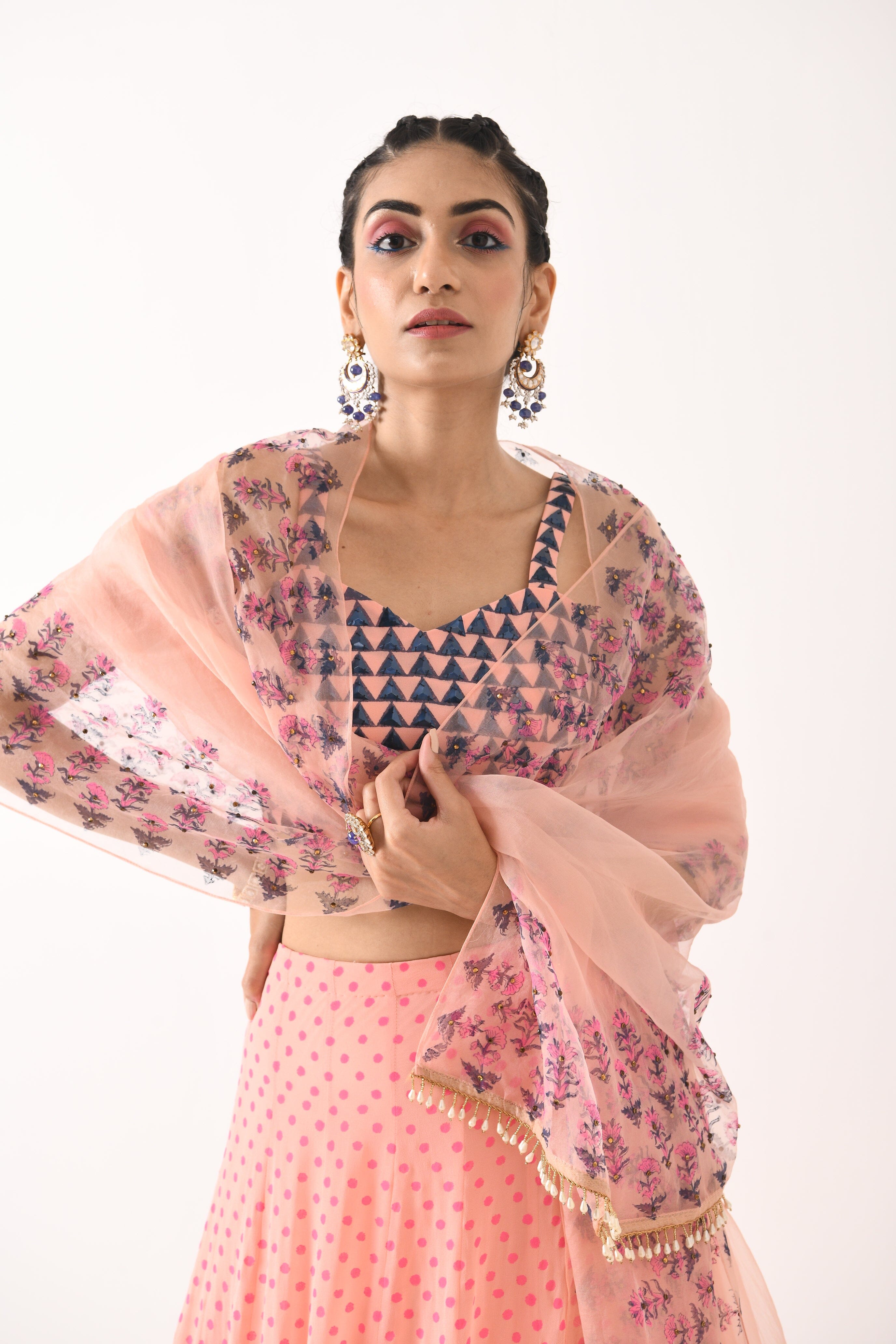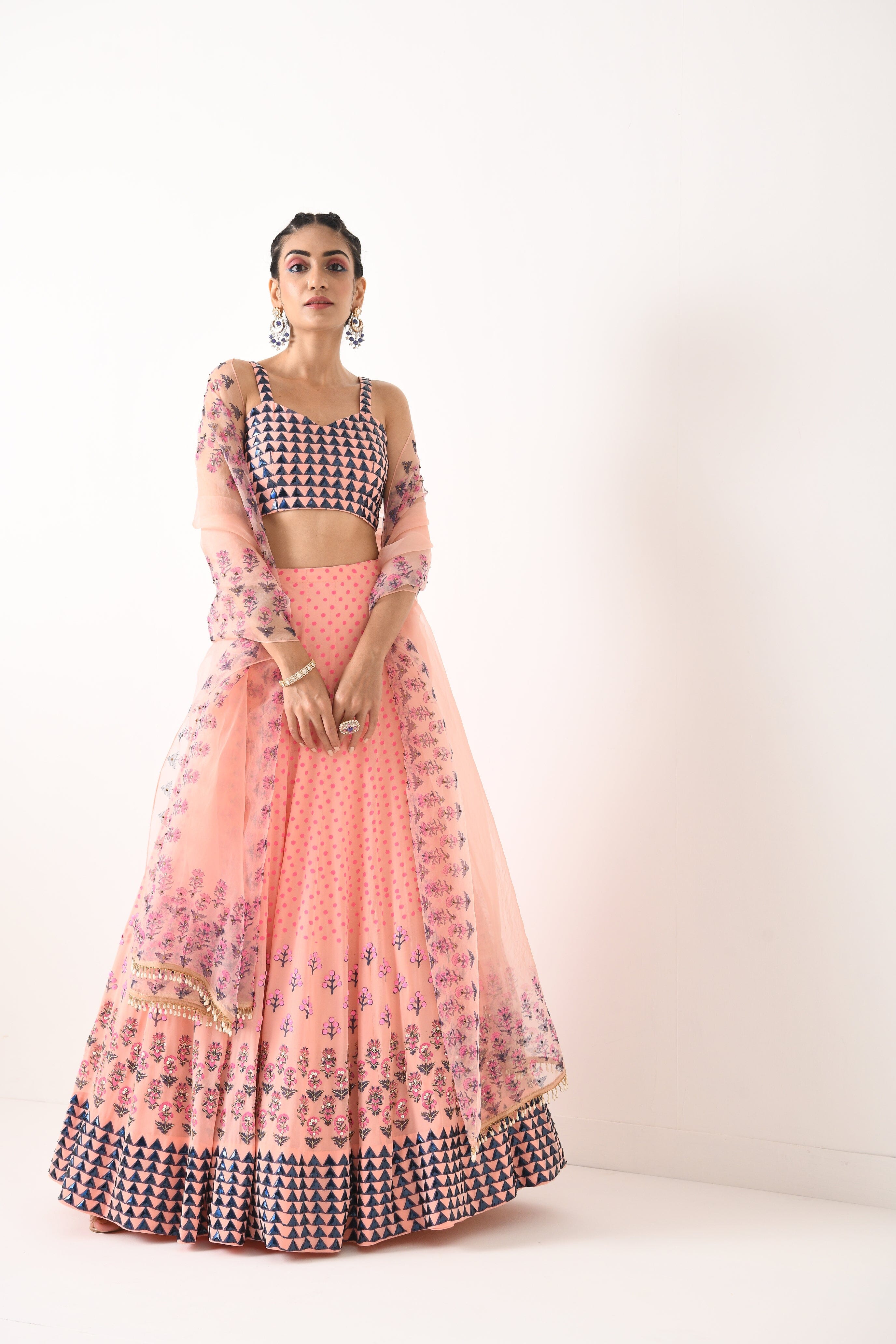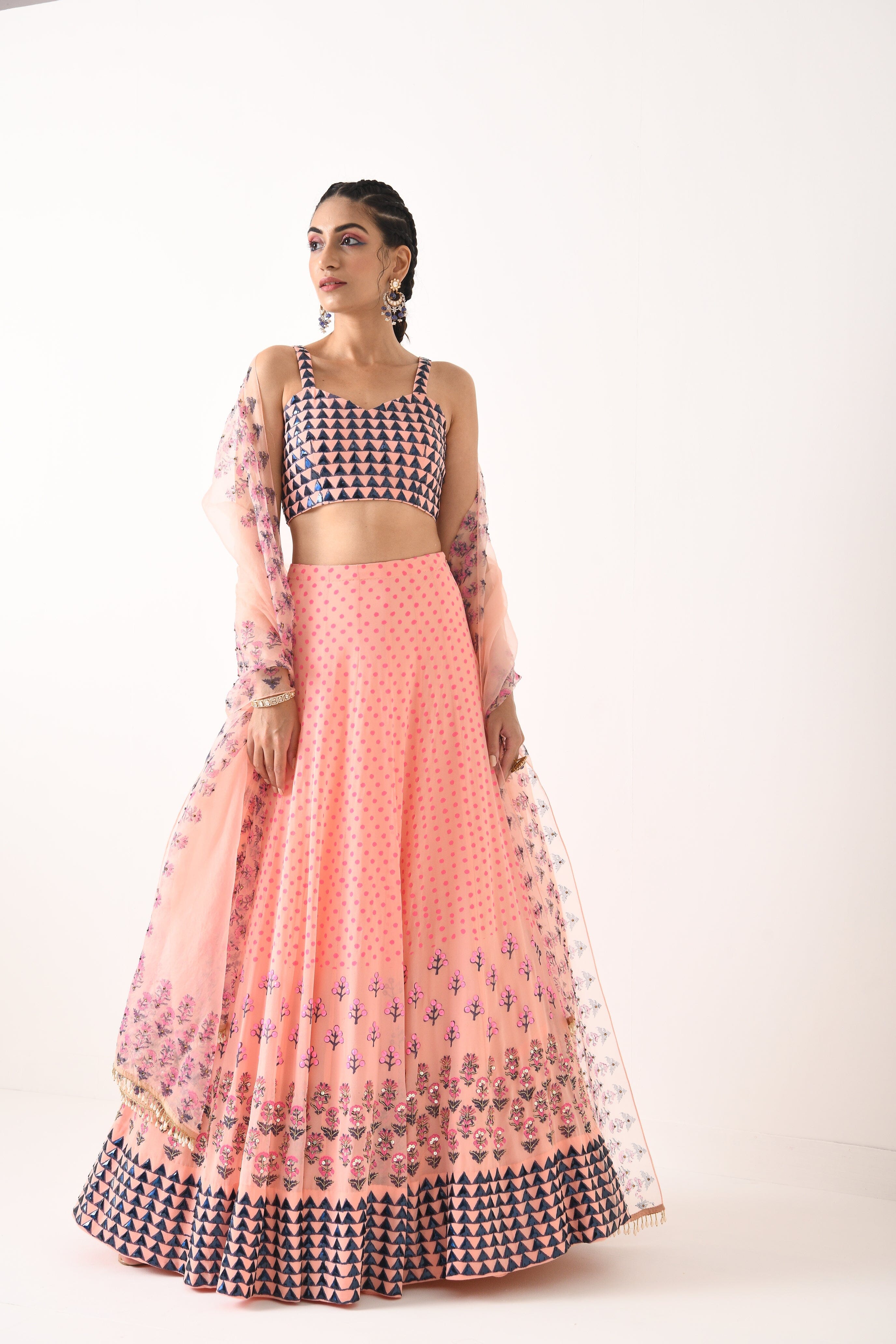 BLUSH PINK TRIANGLE MOTIF THREE BORDER LEHNGA