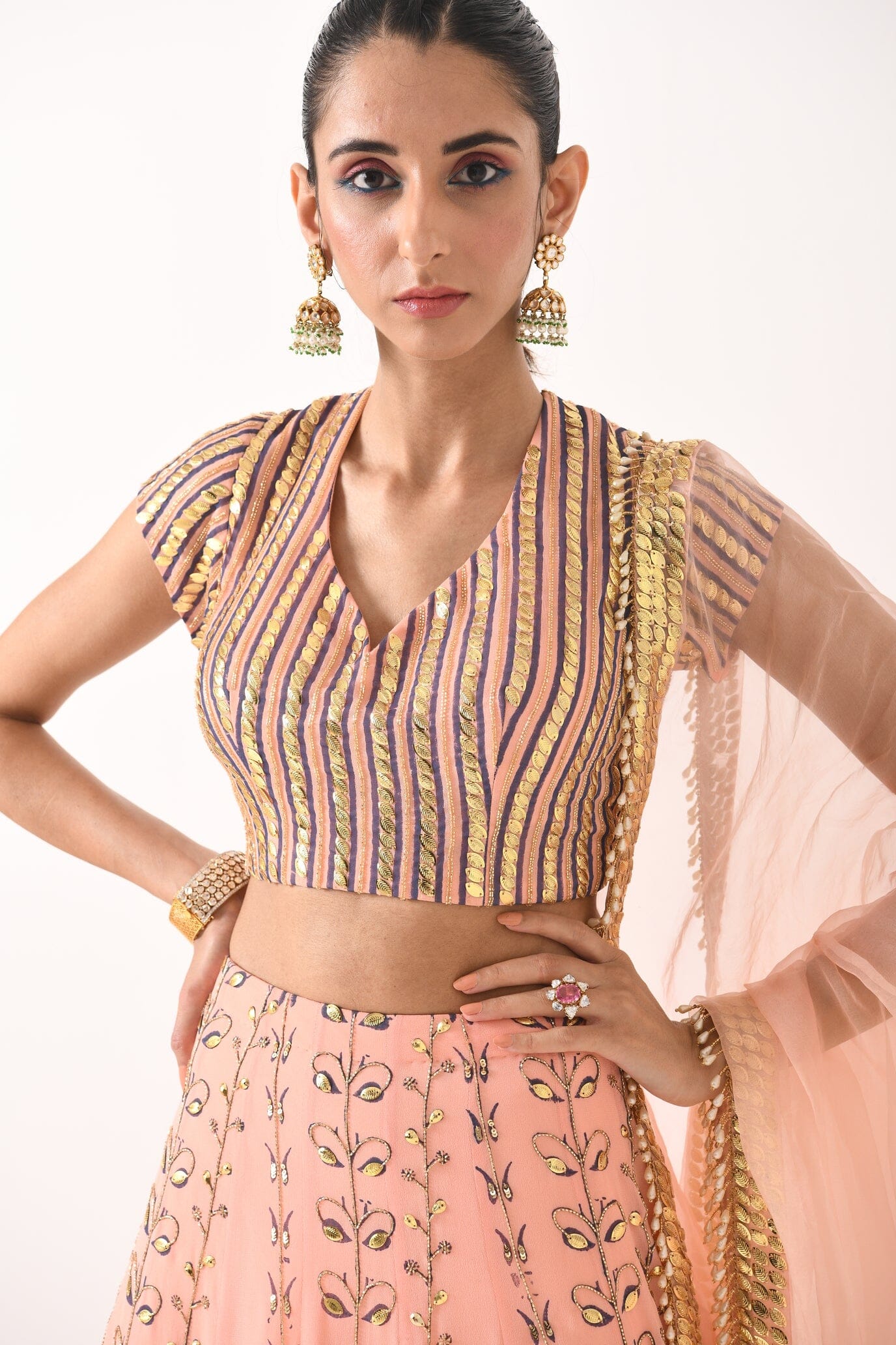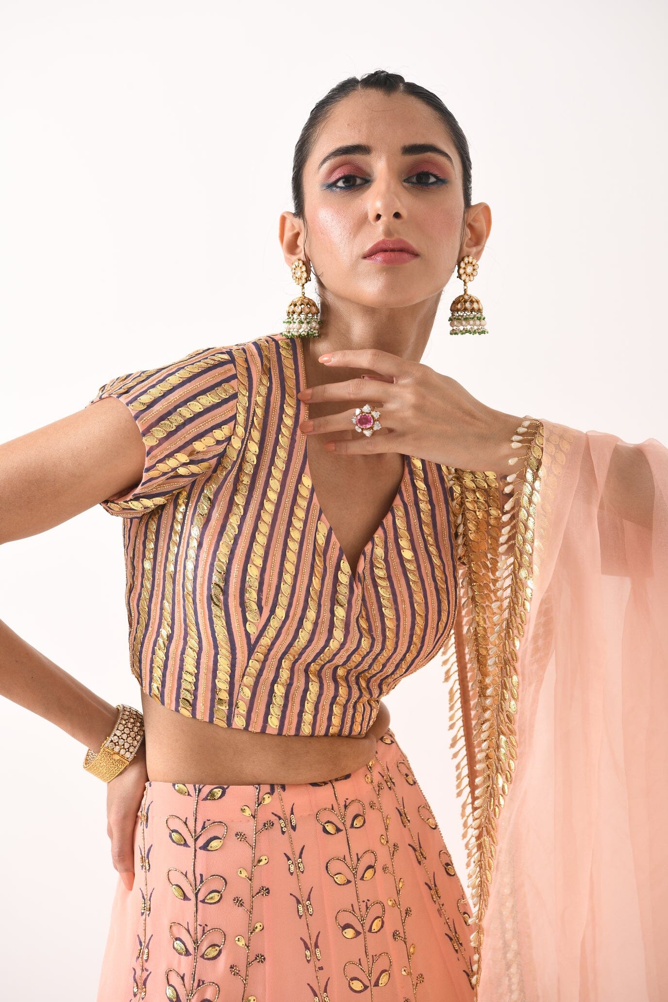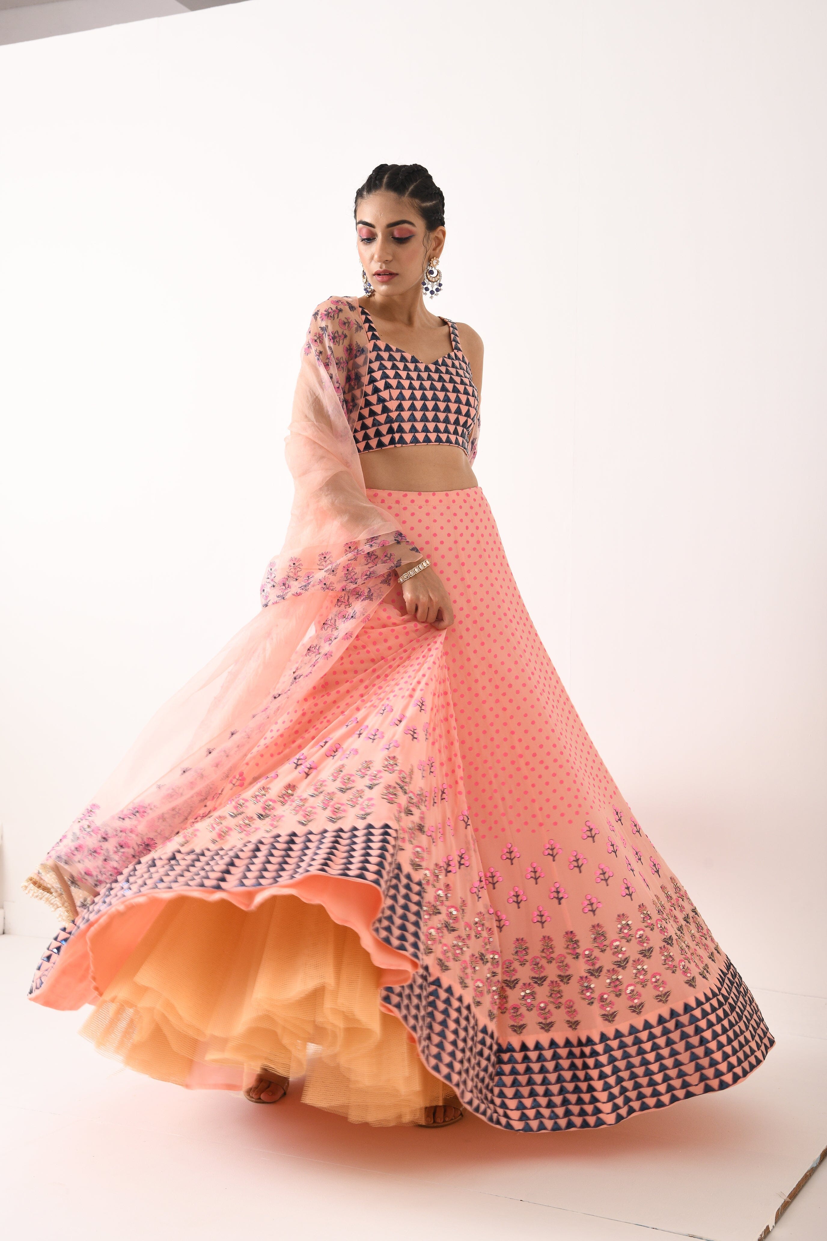BLUSH PINK TRIANGLE MOTIF THREE BORDER LEHNGA