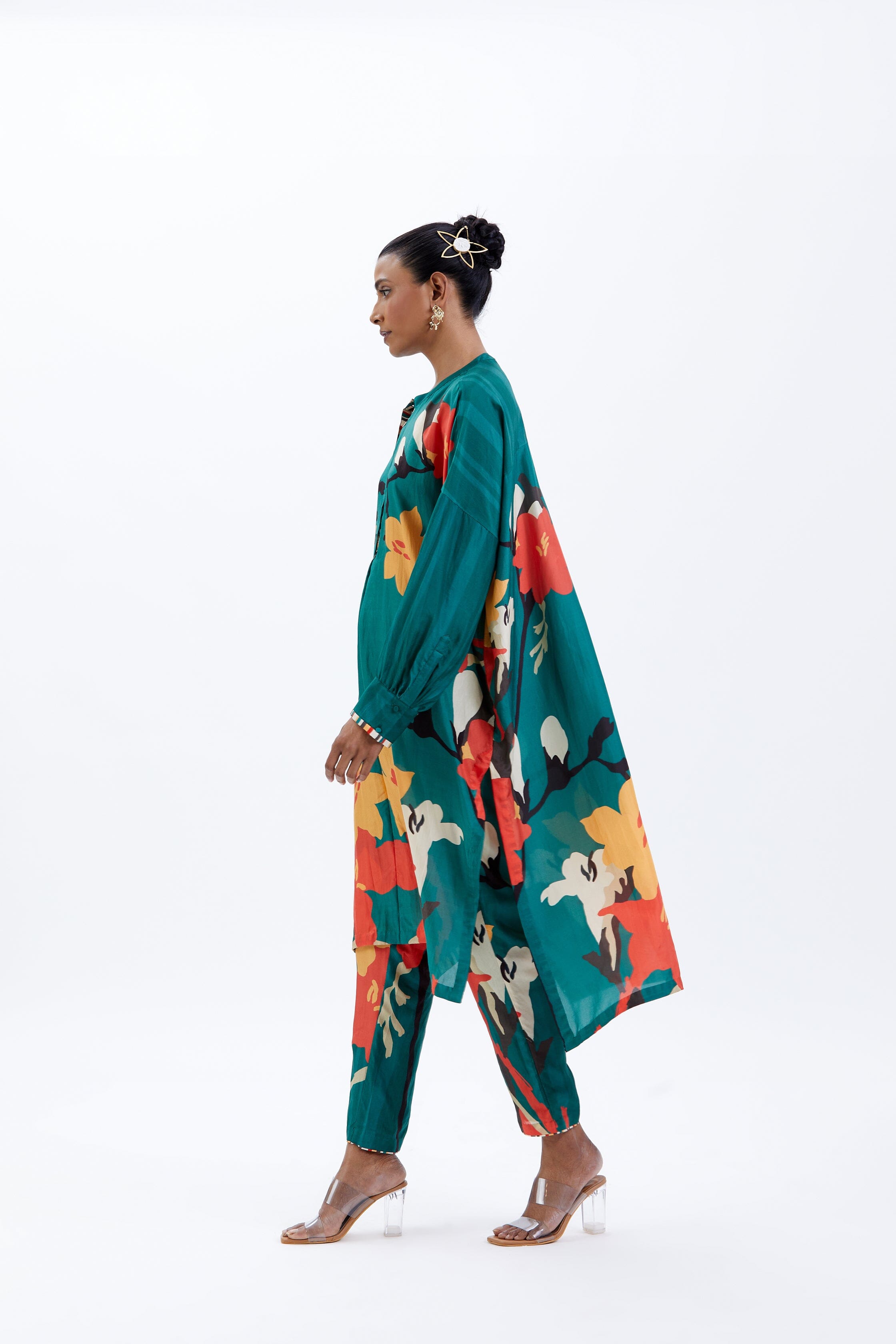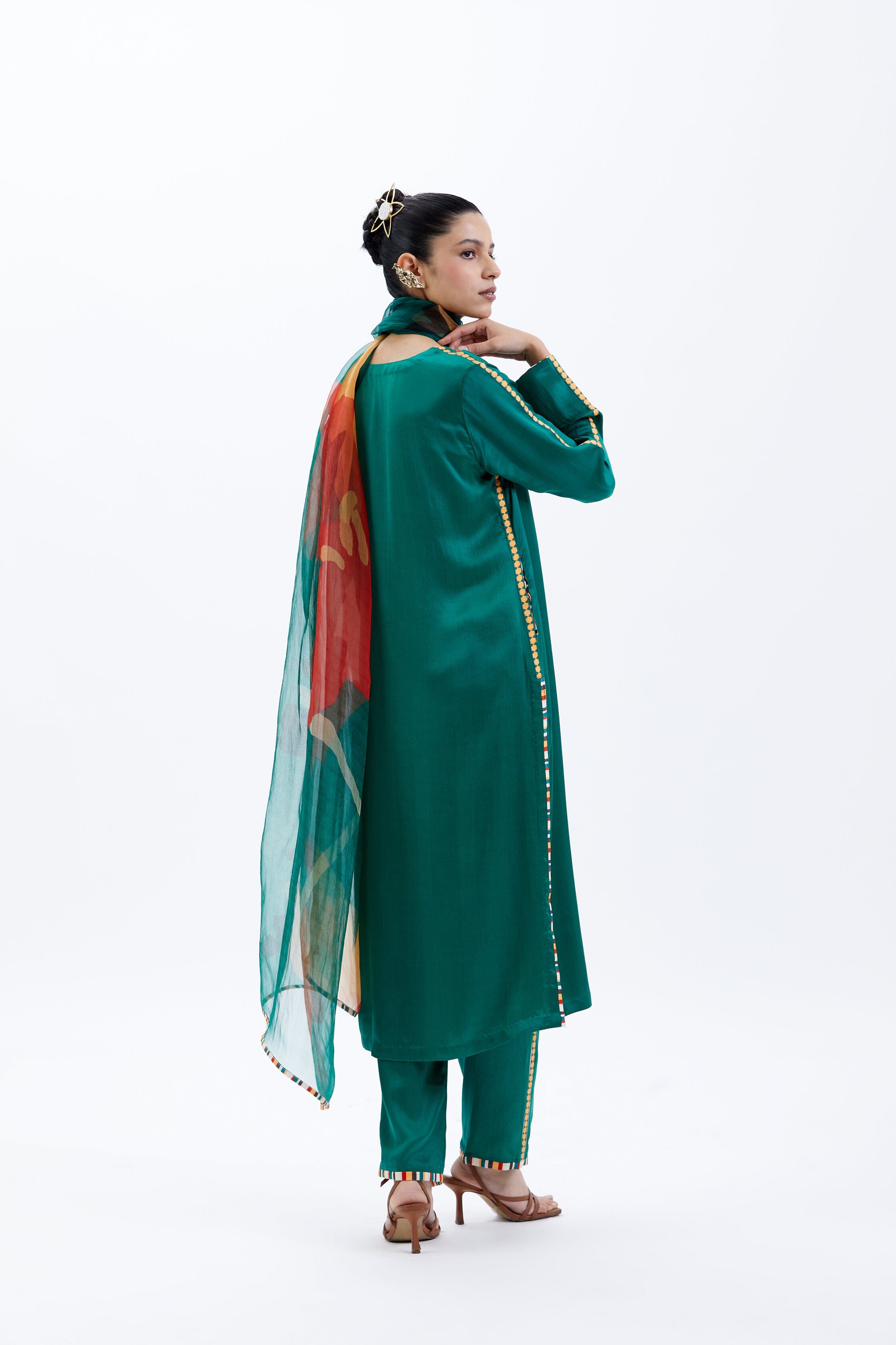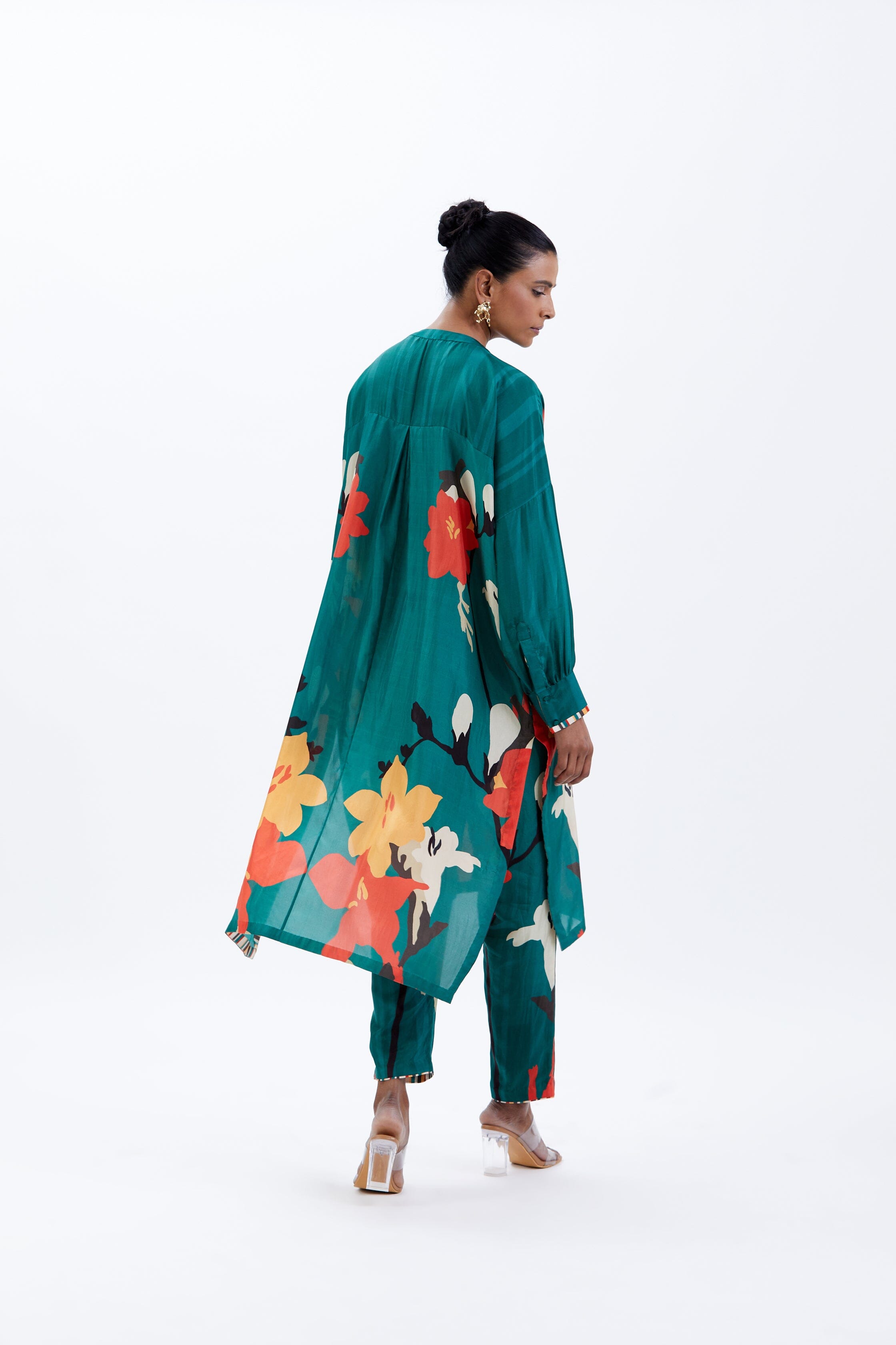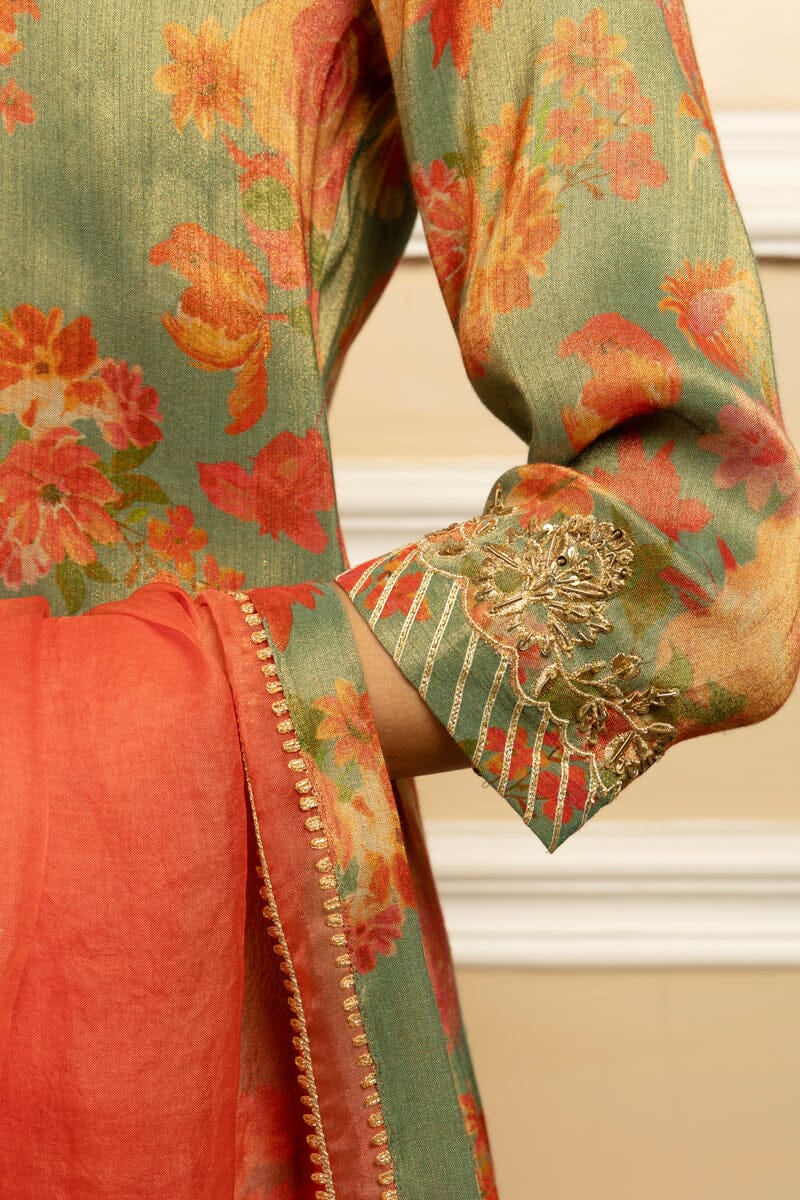 GULBAHAR GREEN FLORAL PRINTED TISSUE KURTA SET