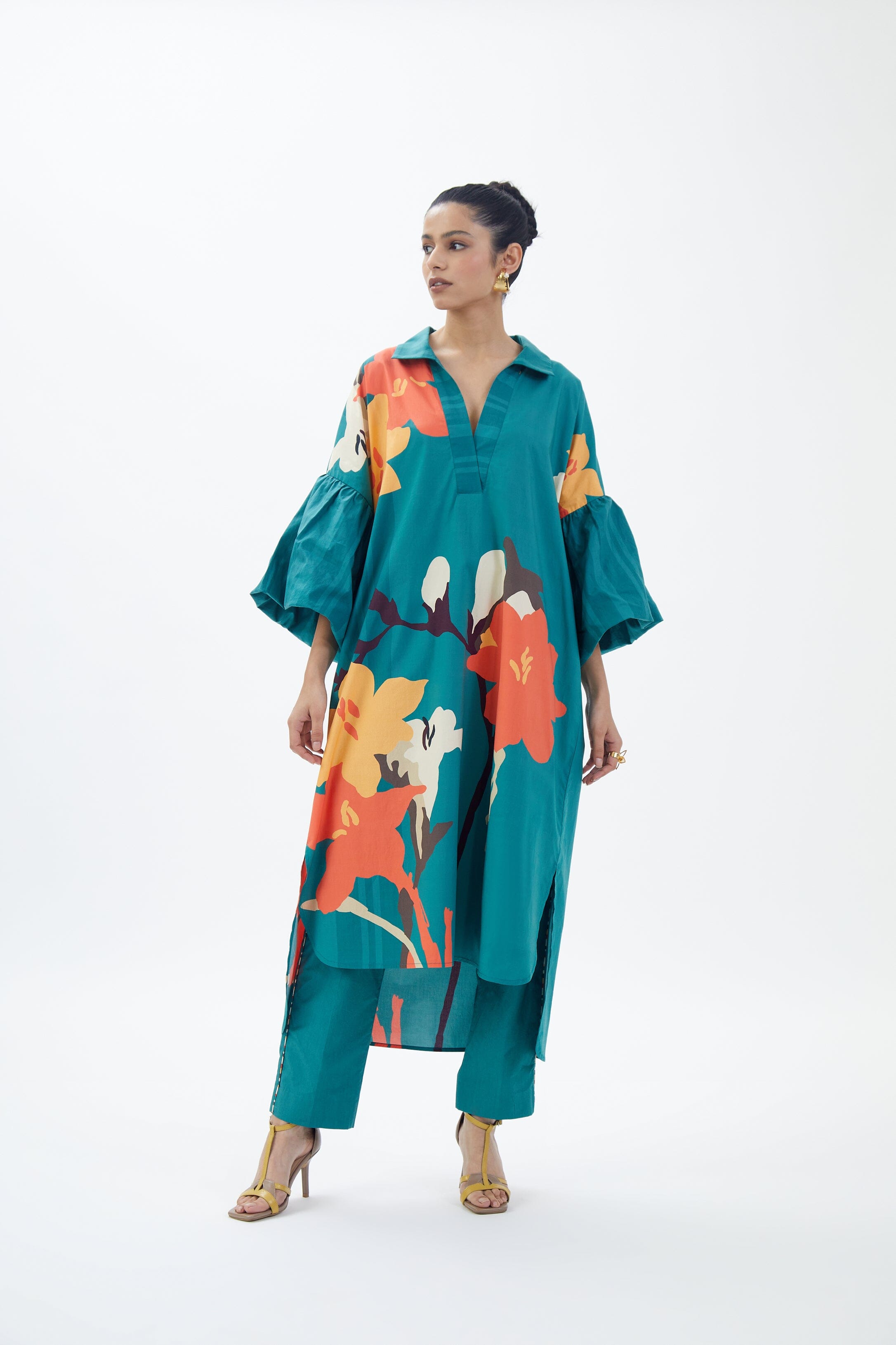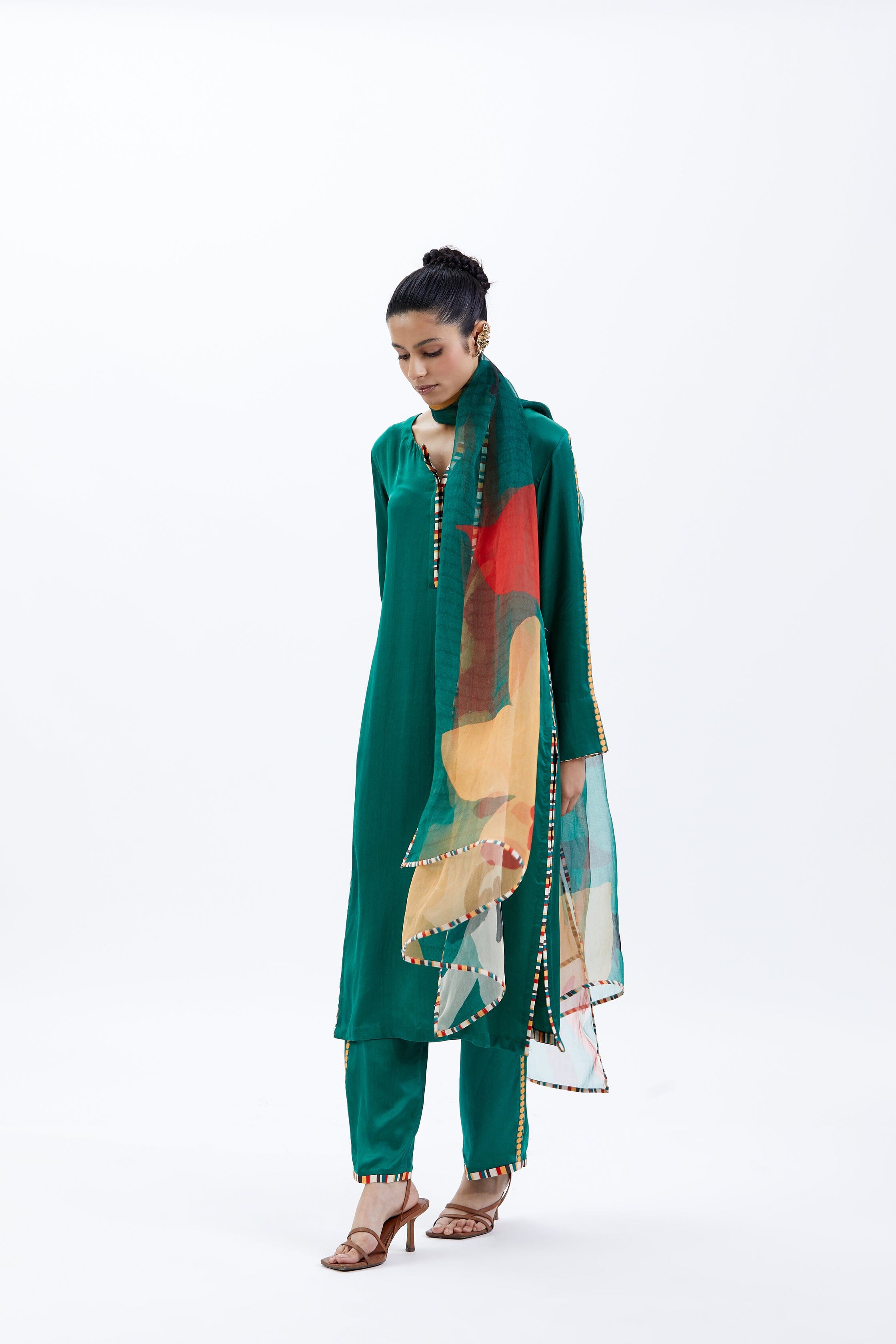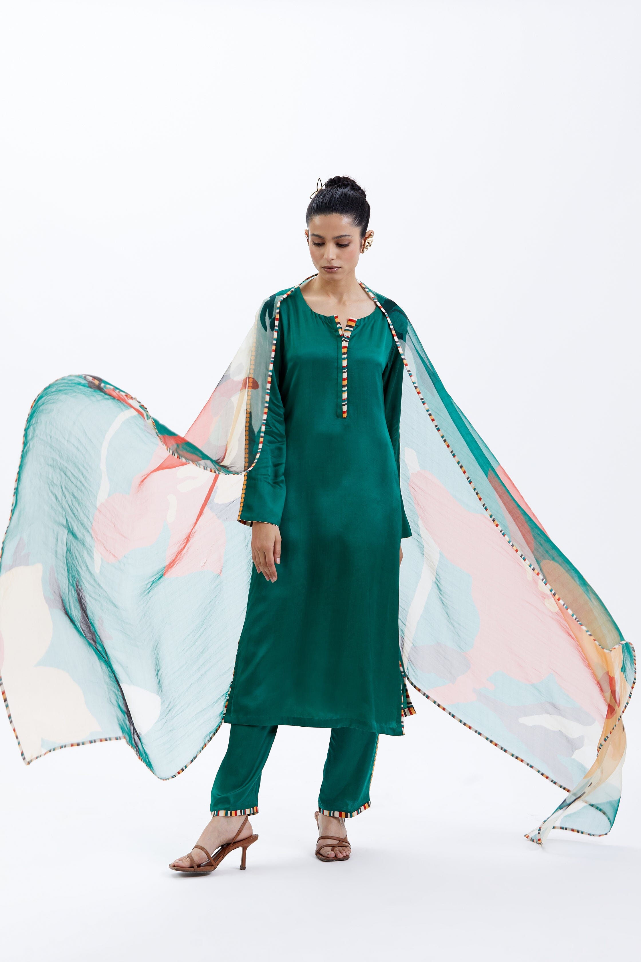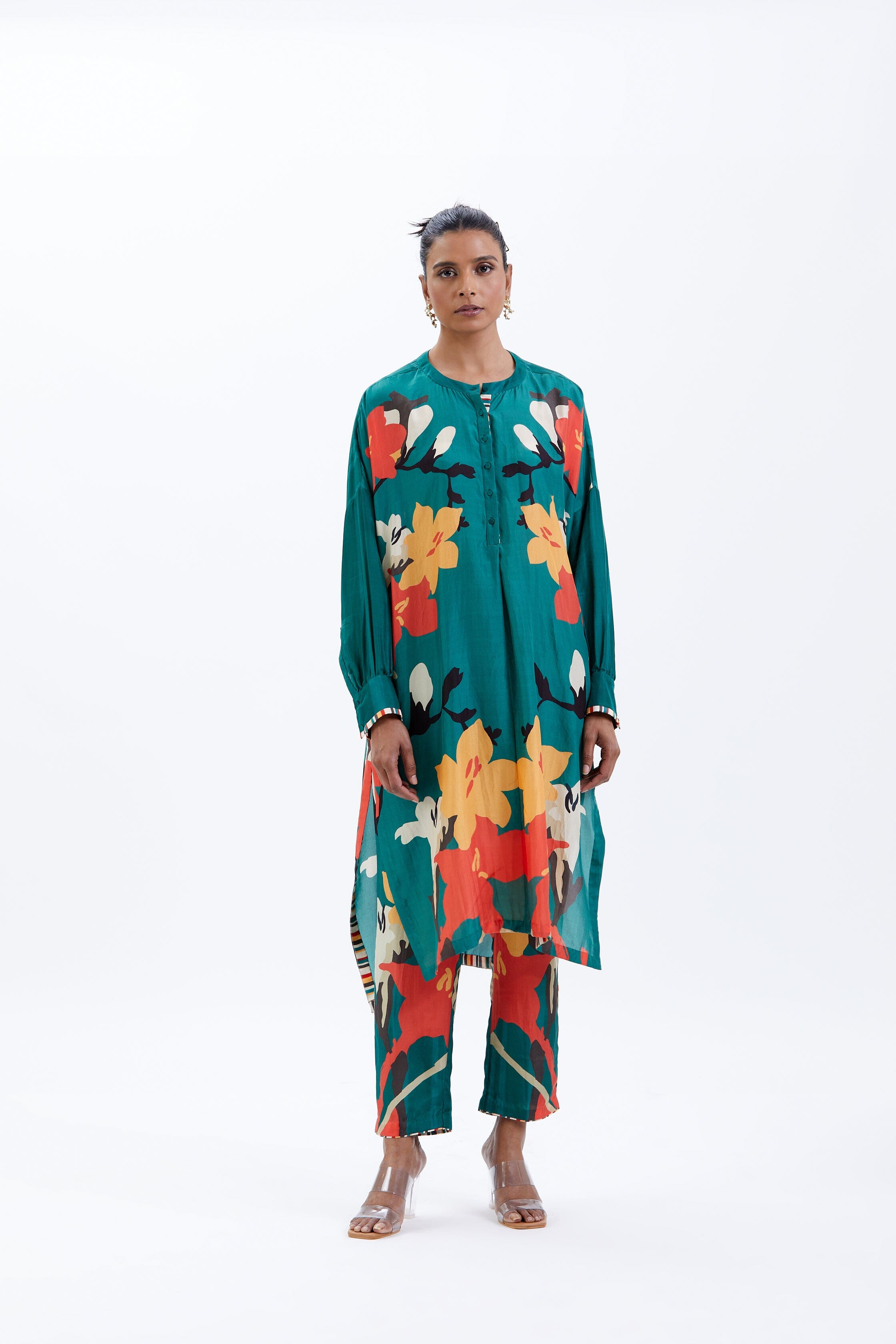 GULBAHAR GREEN FLORAL PRINTED TISSUE KURTA SET