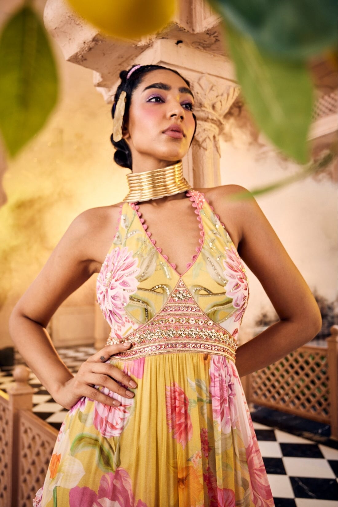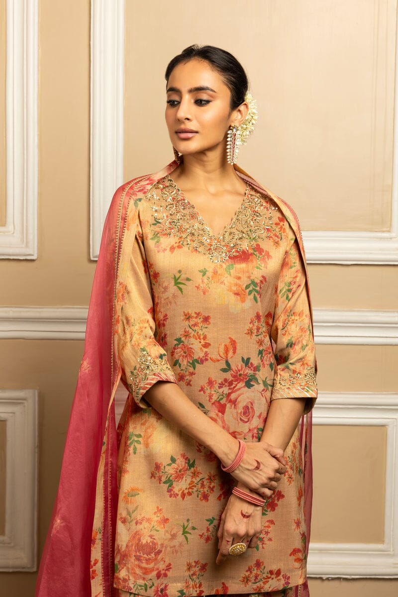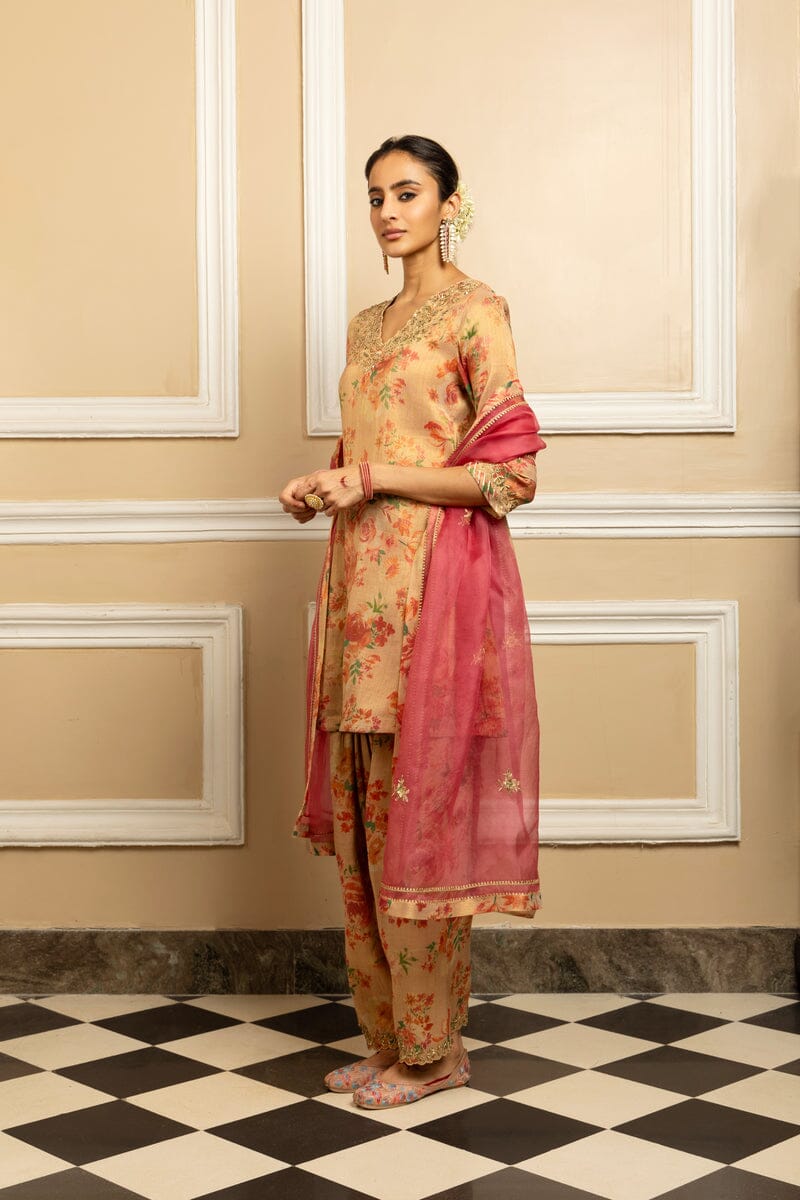 GULBAHAR BEIGE FLORAL PRINTED TISSUE KURTA SET