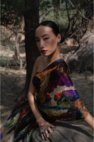 A stunning mosaic inspired blouse and skirt is a mix of splatter and exceptional patterns to take you into a printed heaven translated into fluid silk