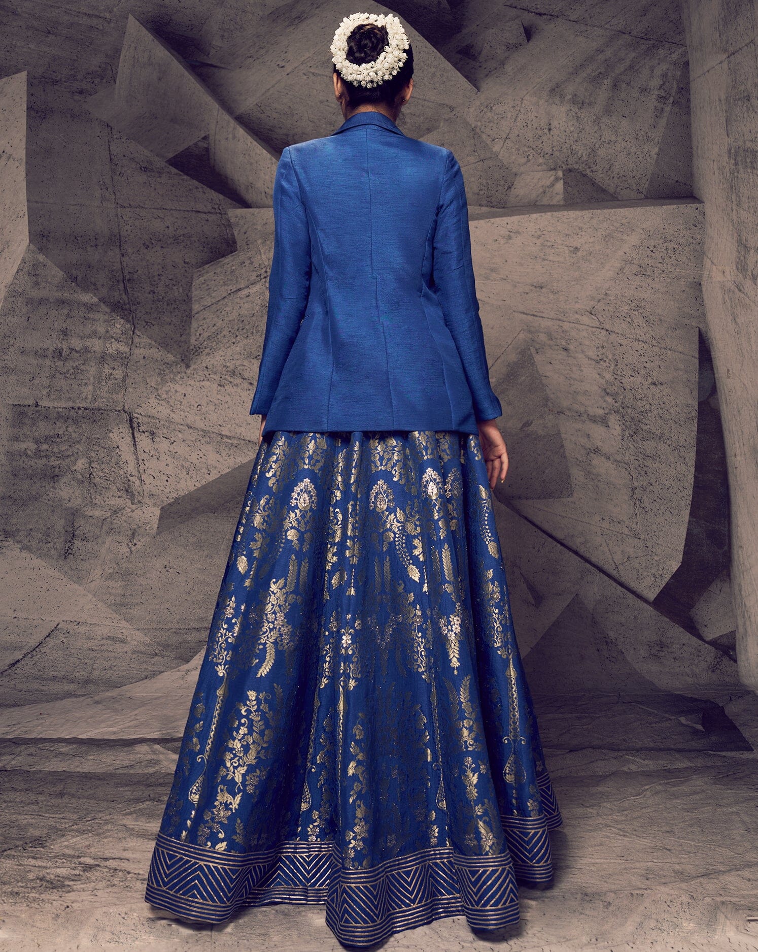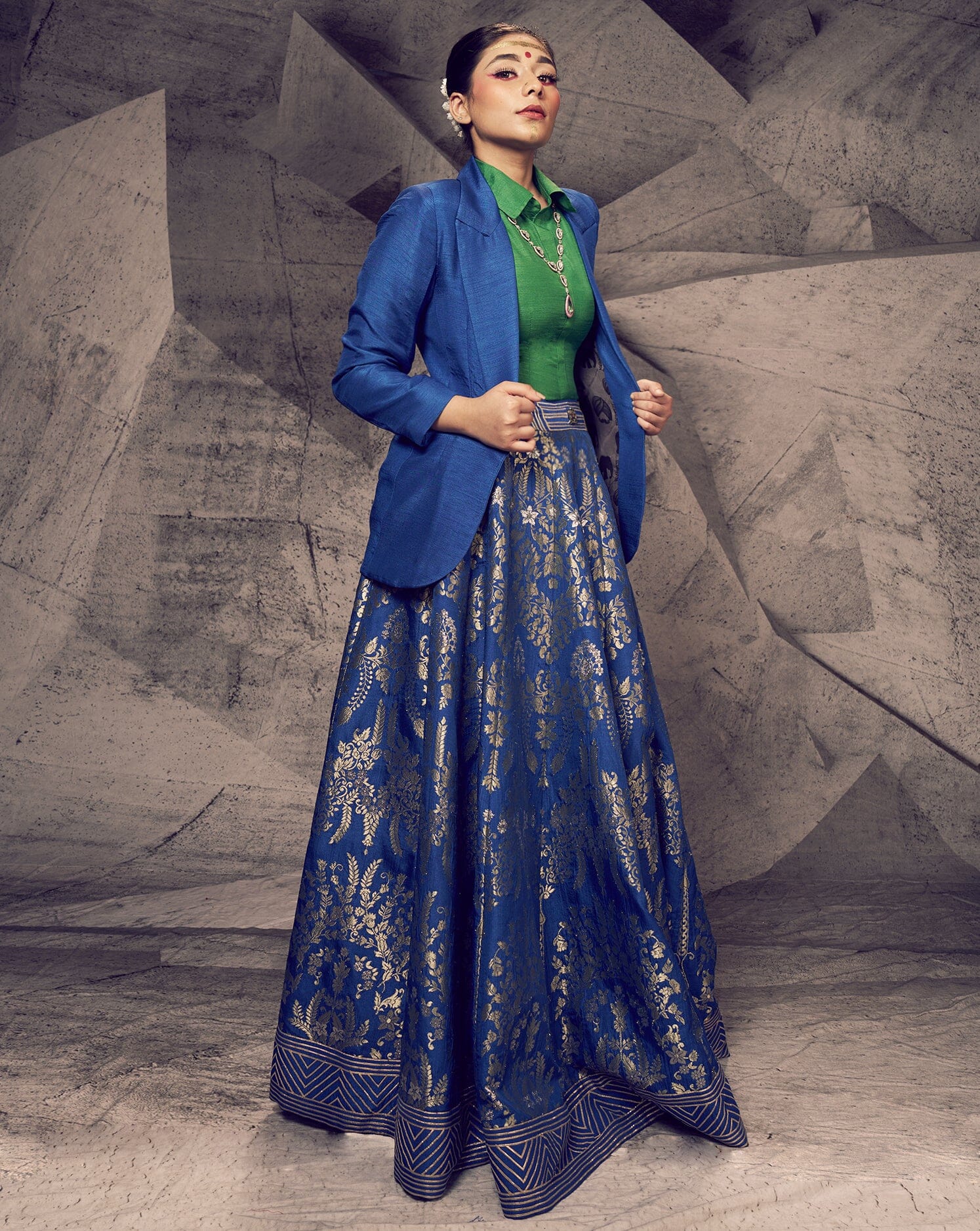 Enveloped between the Indian hues of green and blue and glimmering brocade woven embroidery work lies this beautiful outfit from our NYFW SS24 collection. The lehenga is embellished with gota thread embroidery in the border and belt and brocade woven embroidery for the centre. It is paired with a green shirt to break the colour and a blazer to complete the contemporary look.