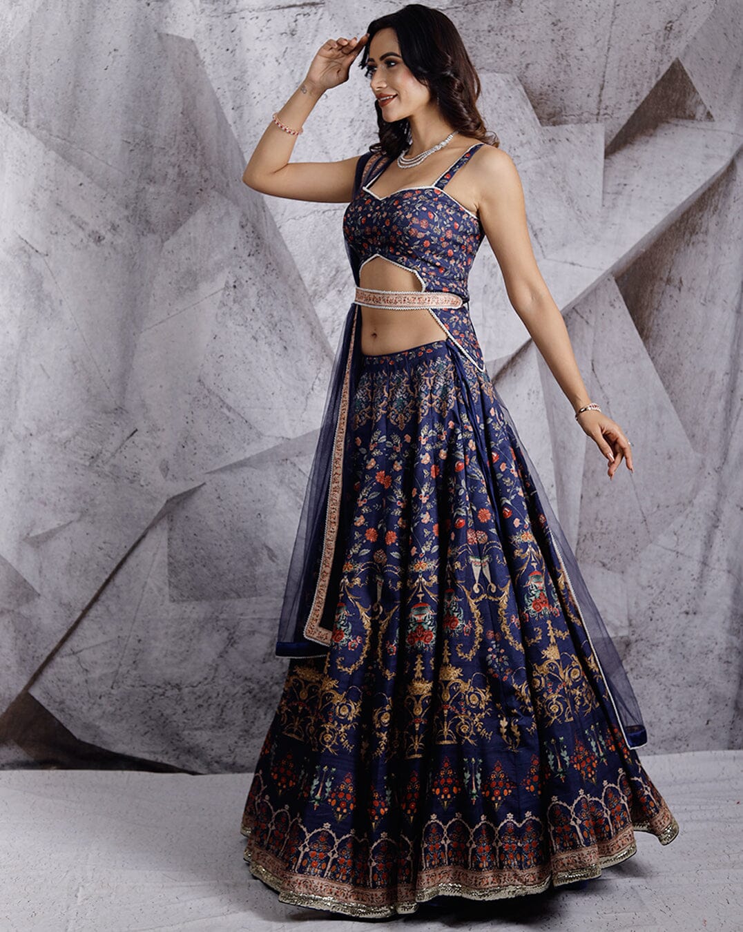 Enveloped between graceful blue hues and floral motifs lies this Blue Paradise lehenga. The digitally printed lehenga is embodied with floral and geometric prints in a marriage of traditional and contemporary. It’s paired with a floral blouse, a net dupatta and an embellished belt.