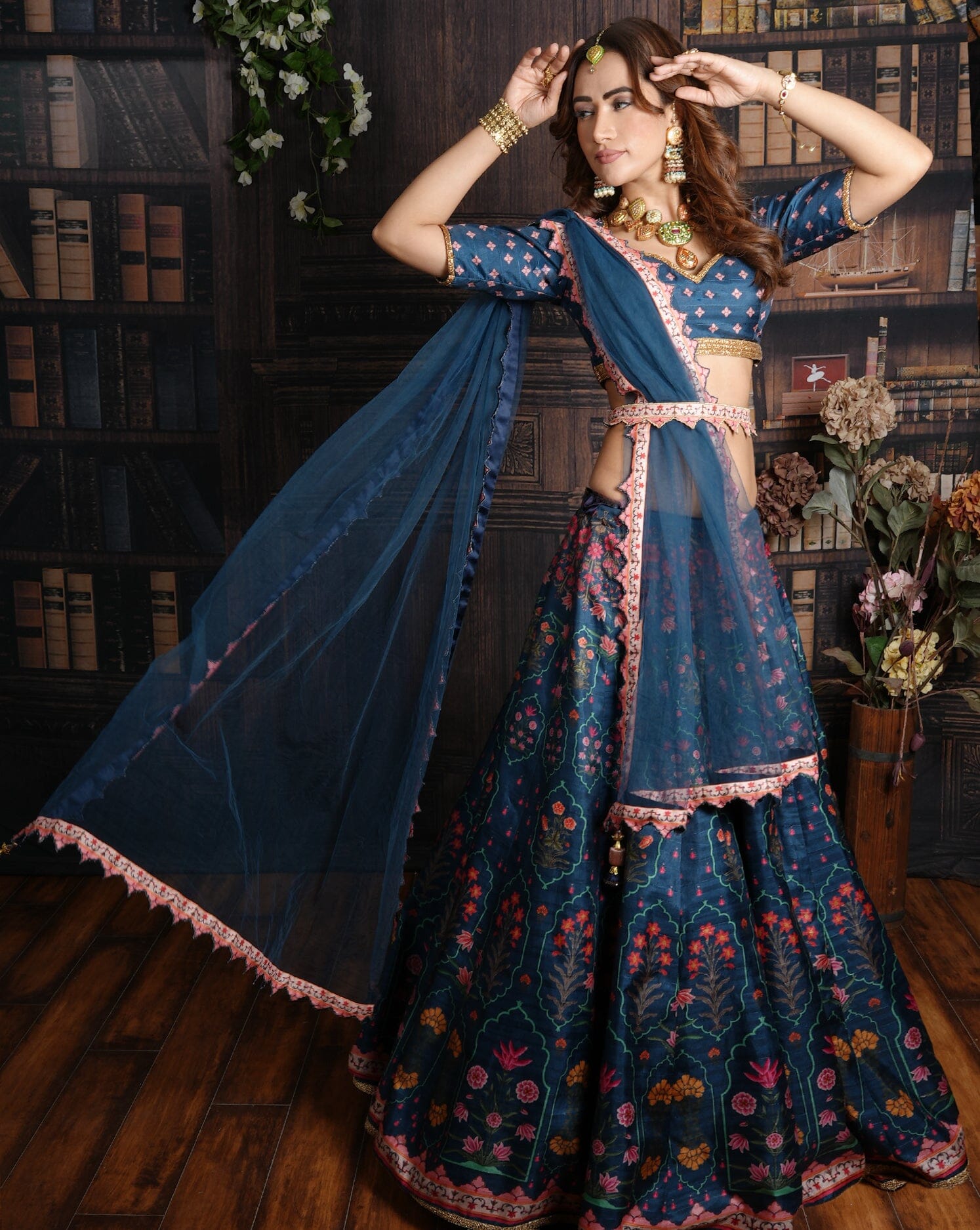 Enveloped between floral motifs and traditional feels lies this Lagoon Lehenga. The digital lehenga is embodied with floral geometric motifs showing the marriage of traditional and contemporary. The lehenga is paired with a matching blouse, a scalloped edge dupatta and a belt. The lehenga and blouse is bordered with a traditional gold kasab border. We can customize the blouse style and the outfit colour for you.
