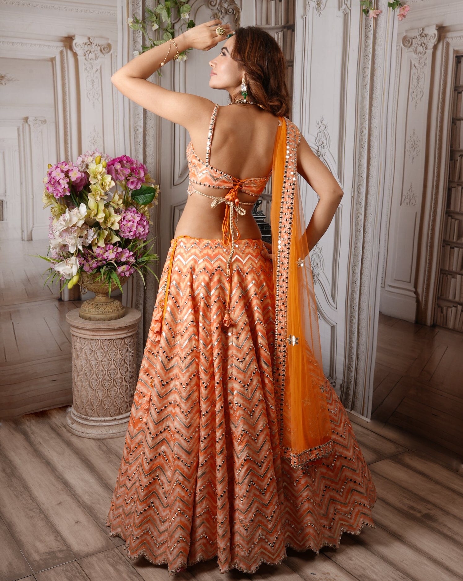 Enveloped between tie dye orange hues and reflecting mirror work lies this Yellow Chevron Mirror Lehenga. The digital lehenga is embroidered with contemporary leather work and traditional mirror work. It’s paired with a coordinated blouse, dupatta and embellished belt. We can customize the blouse style and the outfit colour for you.
