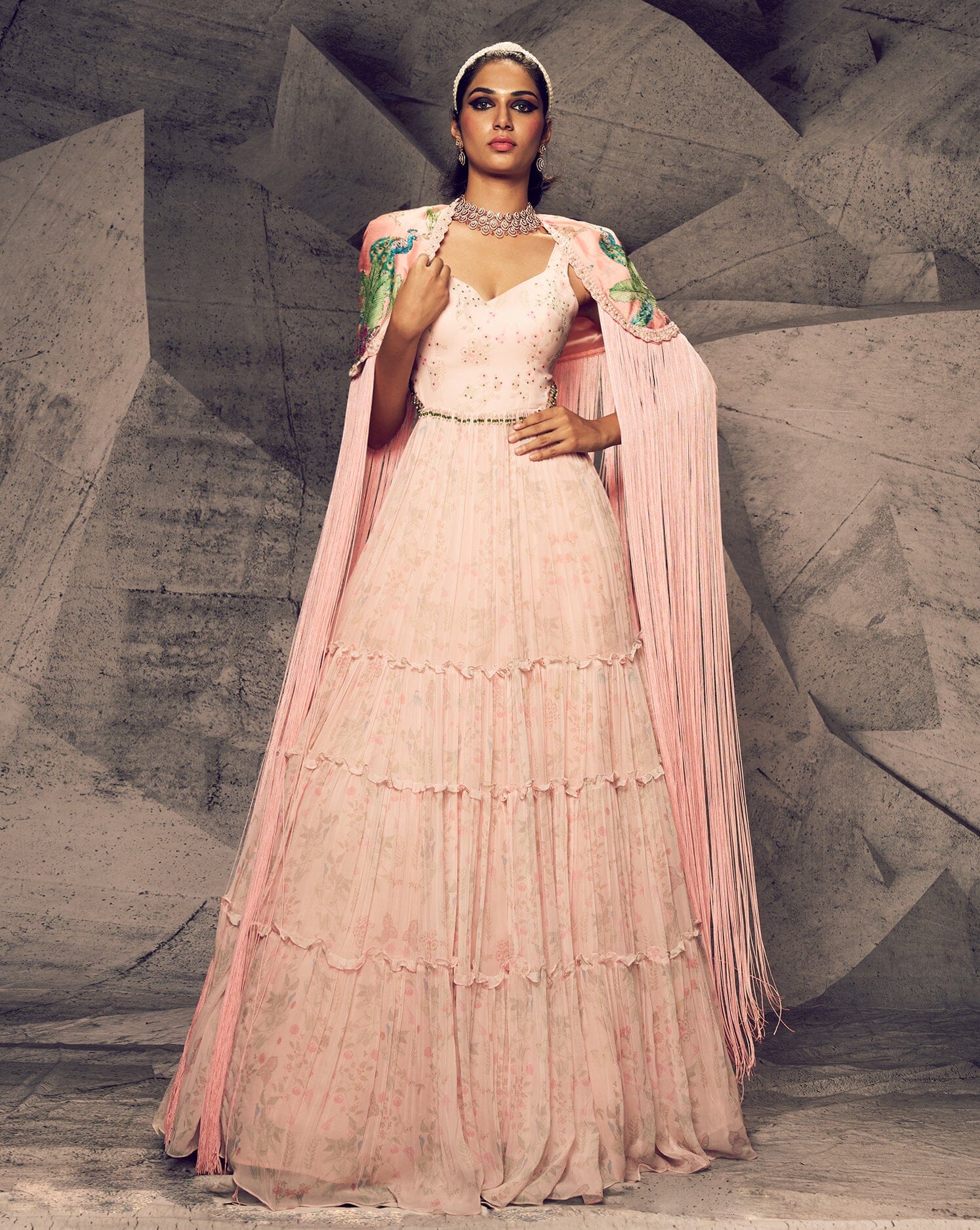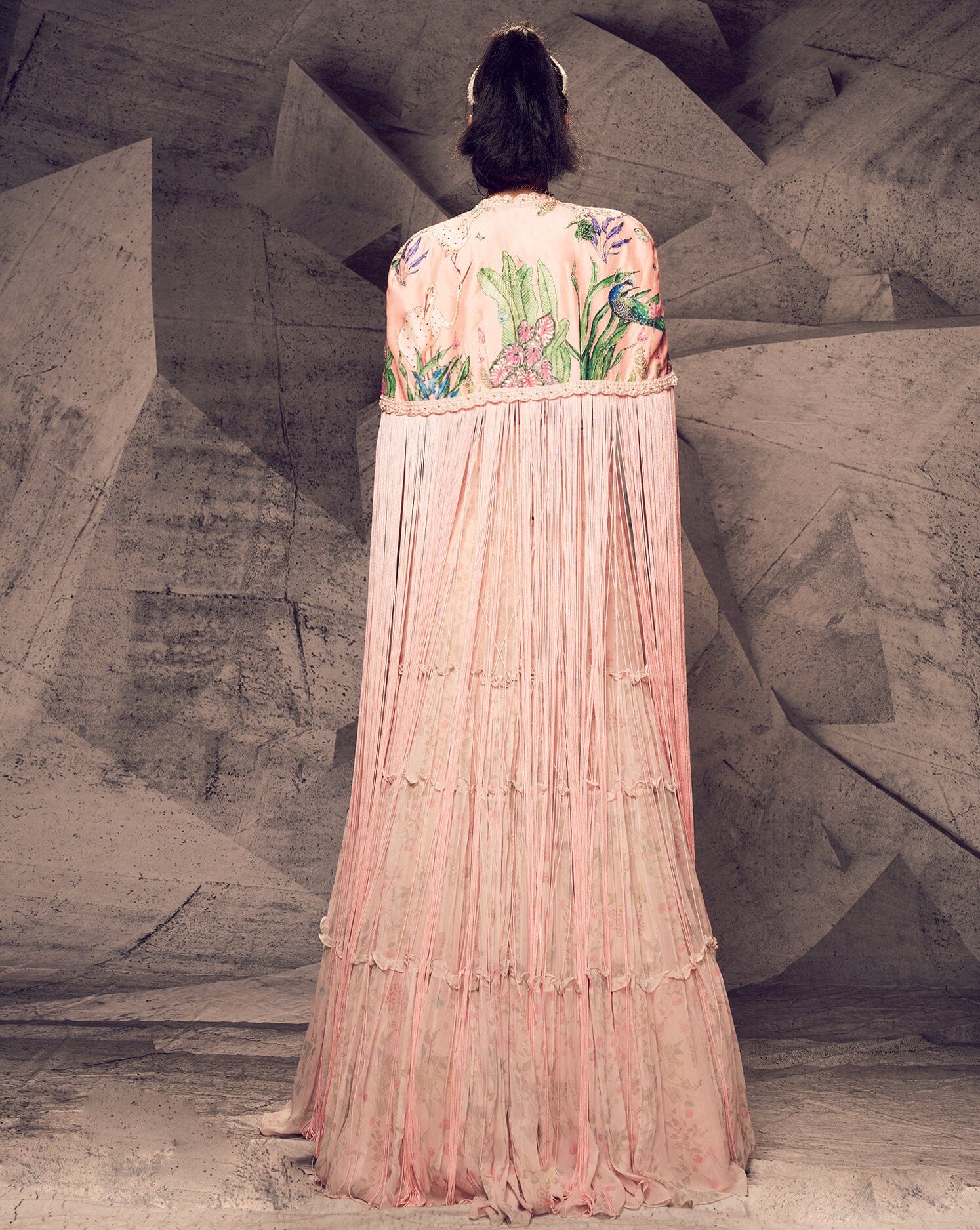 Enveloped between the pastel hues of pink and fringe embroidery work lies this beautiful outfit from our NYFW SS24 Collection. The georgette anarkali is embellished with tassels at the waistline. The cape is embroidered with gold kasab thread work and highlighted with sequins. The statement fringe on the cape completes the look.