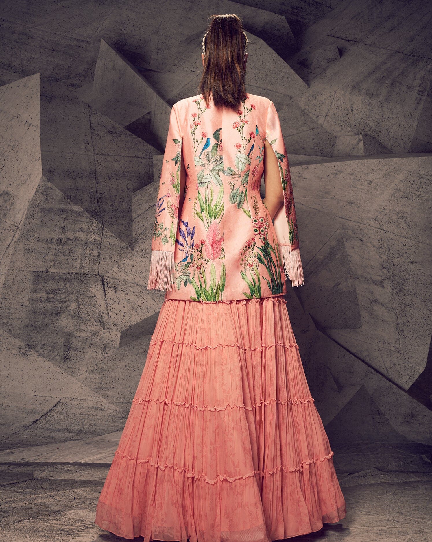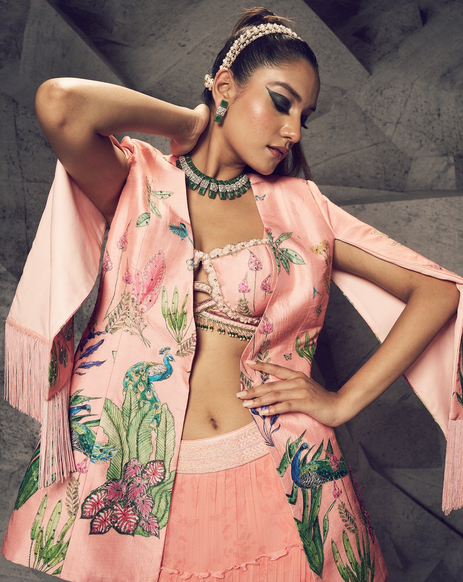 Enveloped between the pastel hues of pink and fringe embroidery work lies this beautiful outfit from our NYFW SS24 Collection. The georgette lehenga is embellished with beadwork at the waistline. The contemporary blouse is embellished with pearls. The jacket is embroidered with gold kasab thread work and highlighted with sequins. The statement fringe on the jacket completes the look.