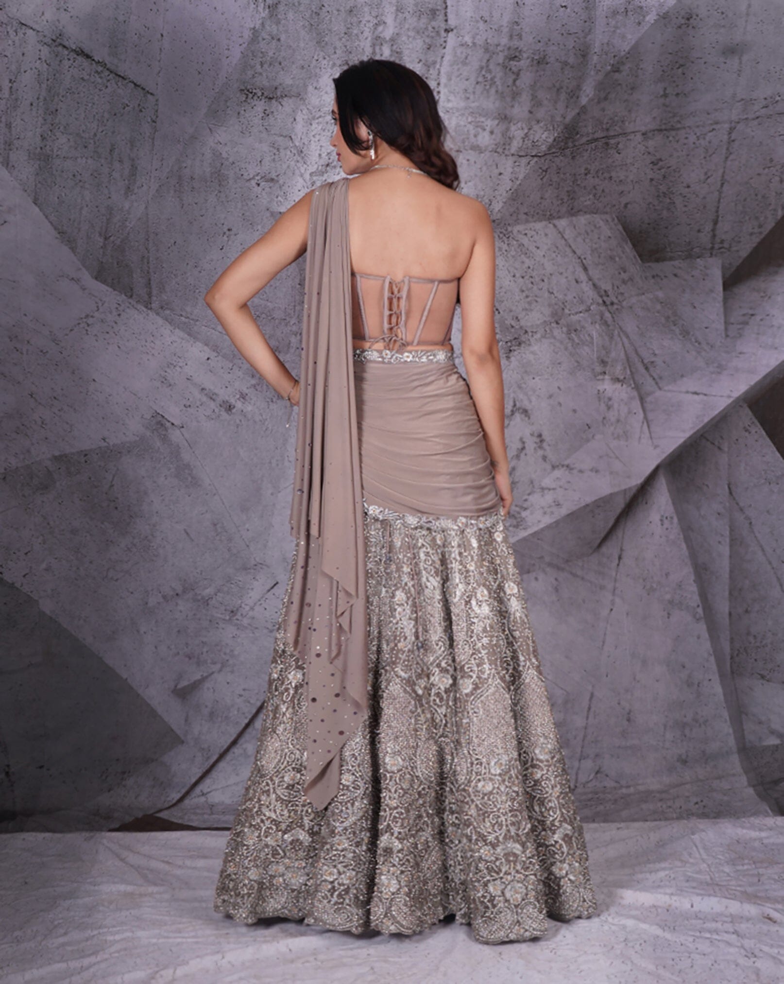 Enveloped between the hues of english grey and shimmering traditional silver embroidery work lies this beautiful lehenga. The corset blouse is embroidered with floral embroidery done with kasab thread, stones and kardana beads. The lehenga is heavily embroidered with Kasab thread work and highlighted with stones, sequins and kardana beads. The pre pleated dupatta add to the sleek, elegant look of the piece.