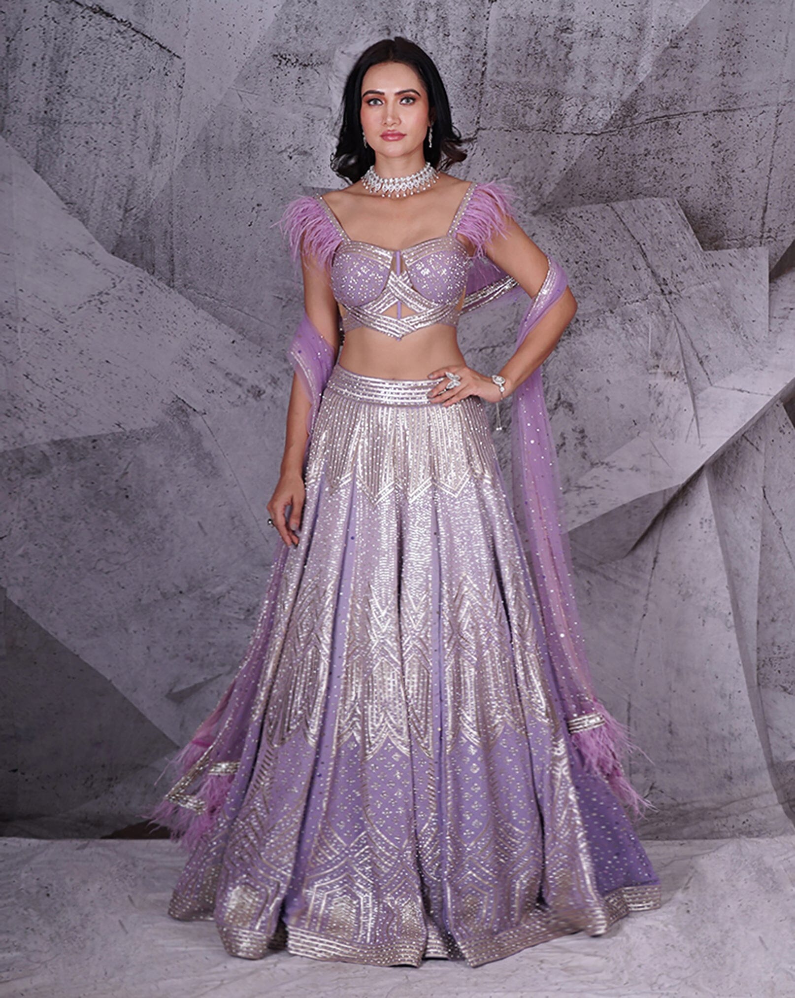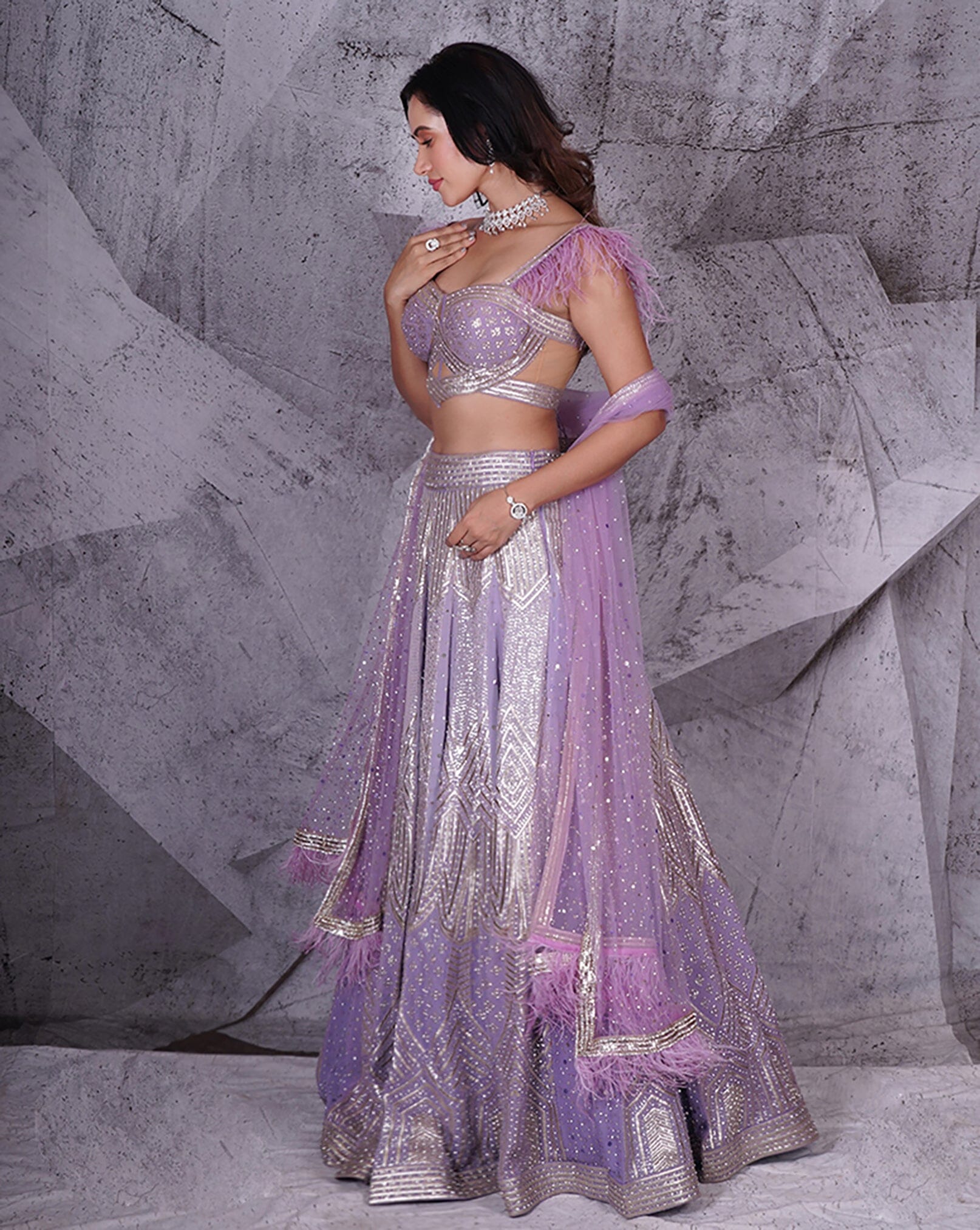 Enveloped between the pastel colour of lilac and shimmering geometric embroidery work lies this beautiful lehenga. The corset blouse is embroidered with lucknowi thread work which is highlighted with stones and kardanas and is adorned with feathers on the sleeves. The lucknowi embellished lehenga is the perfect mix of shine with a contemporary feel. The outfit is paired with a coordinated dupatta with feathers to complete the look.