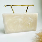 Simplicity with a twist. The V clutch is a hand crafted beauty on resin with a swanky geometric style handle embellished with gem stones .