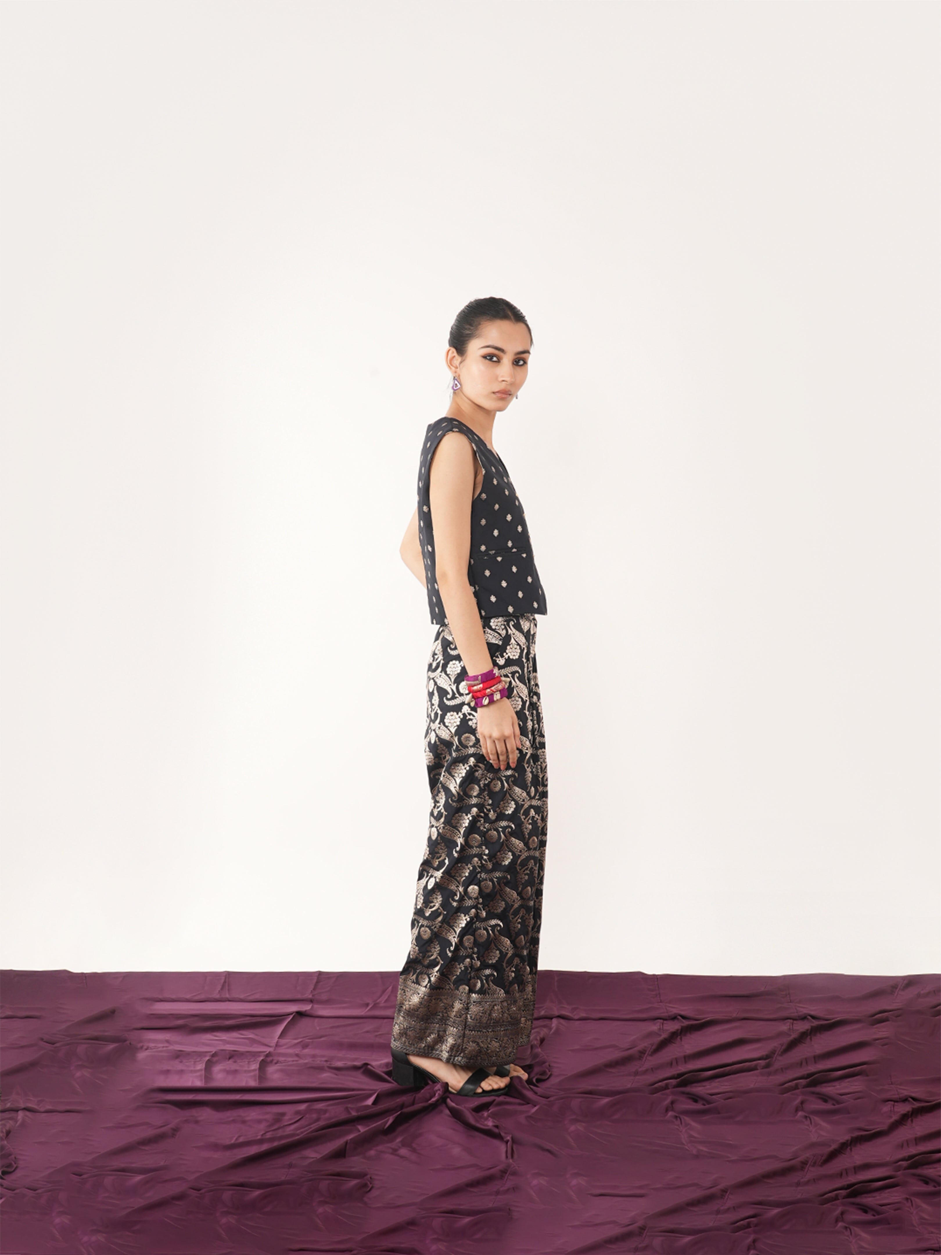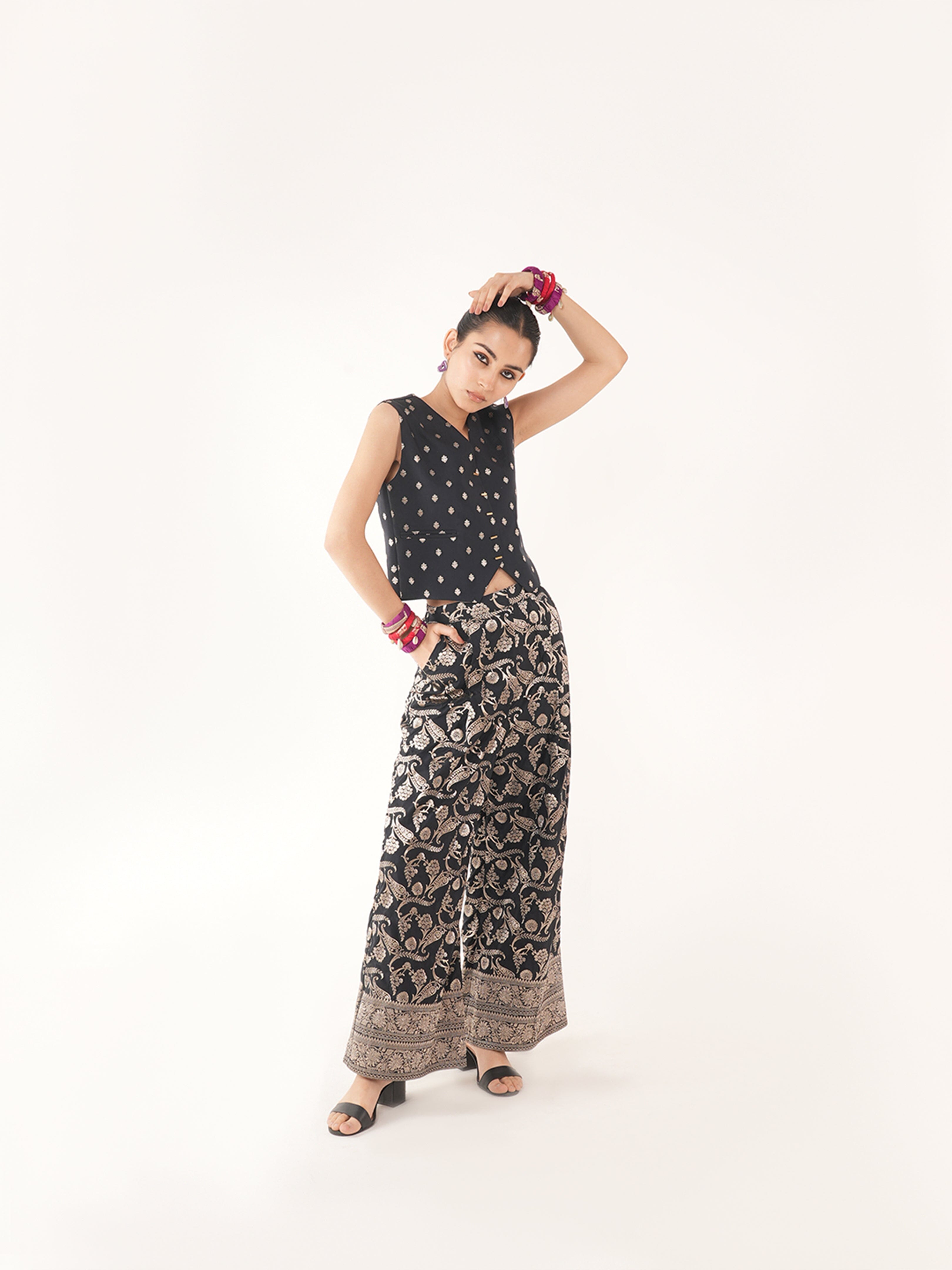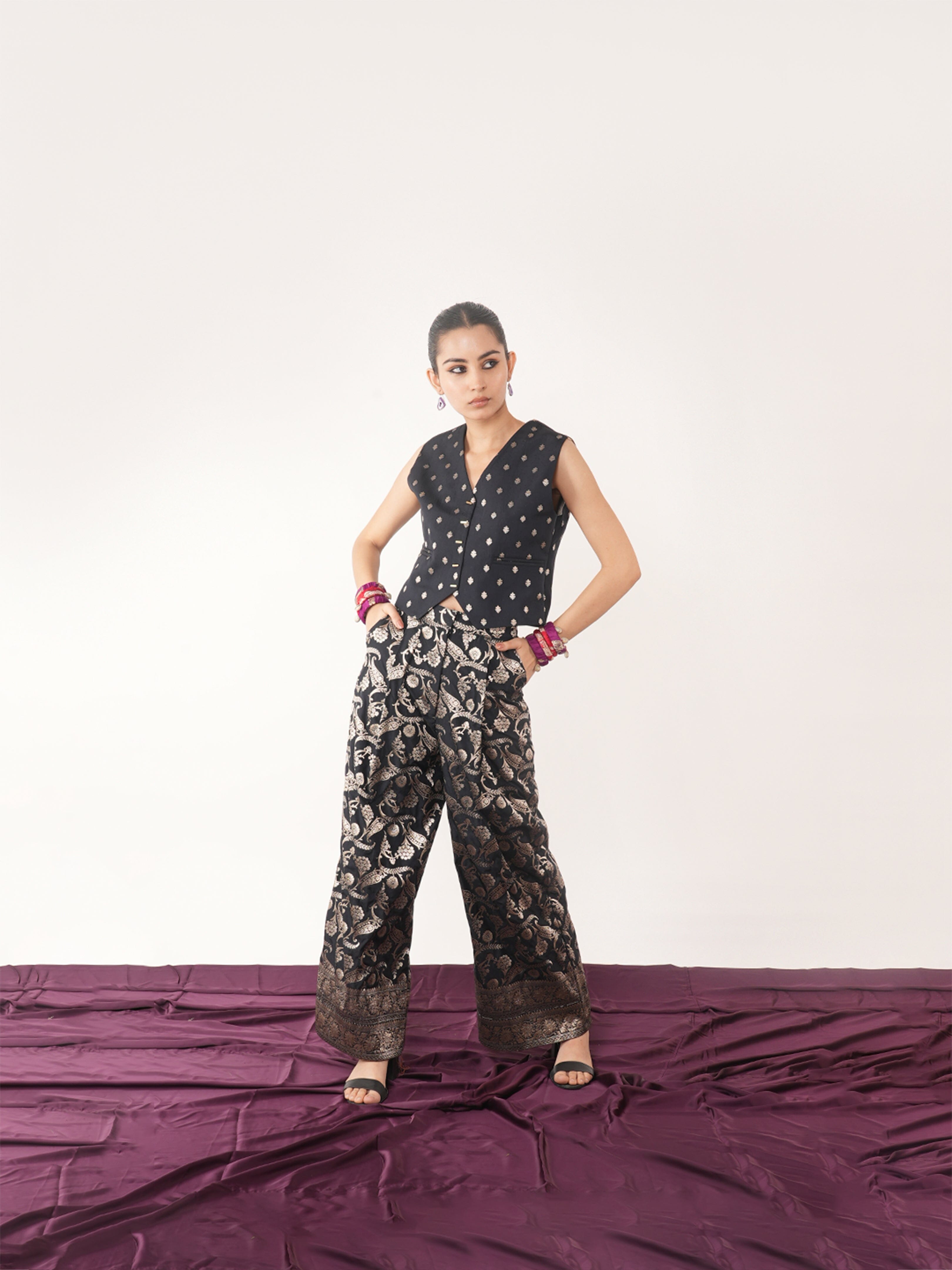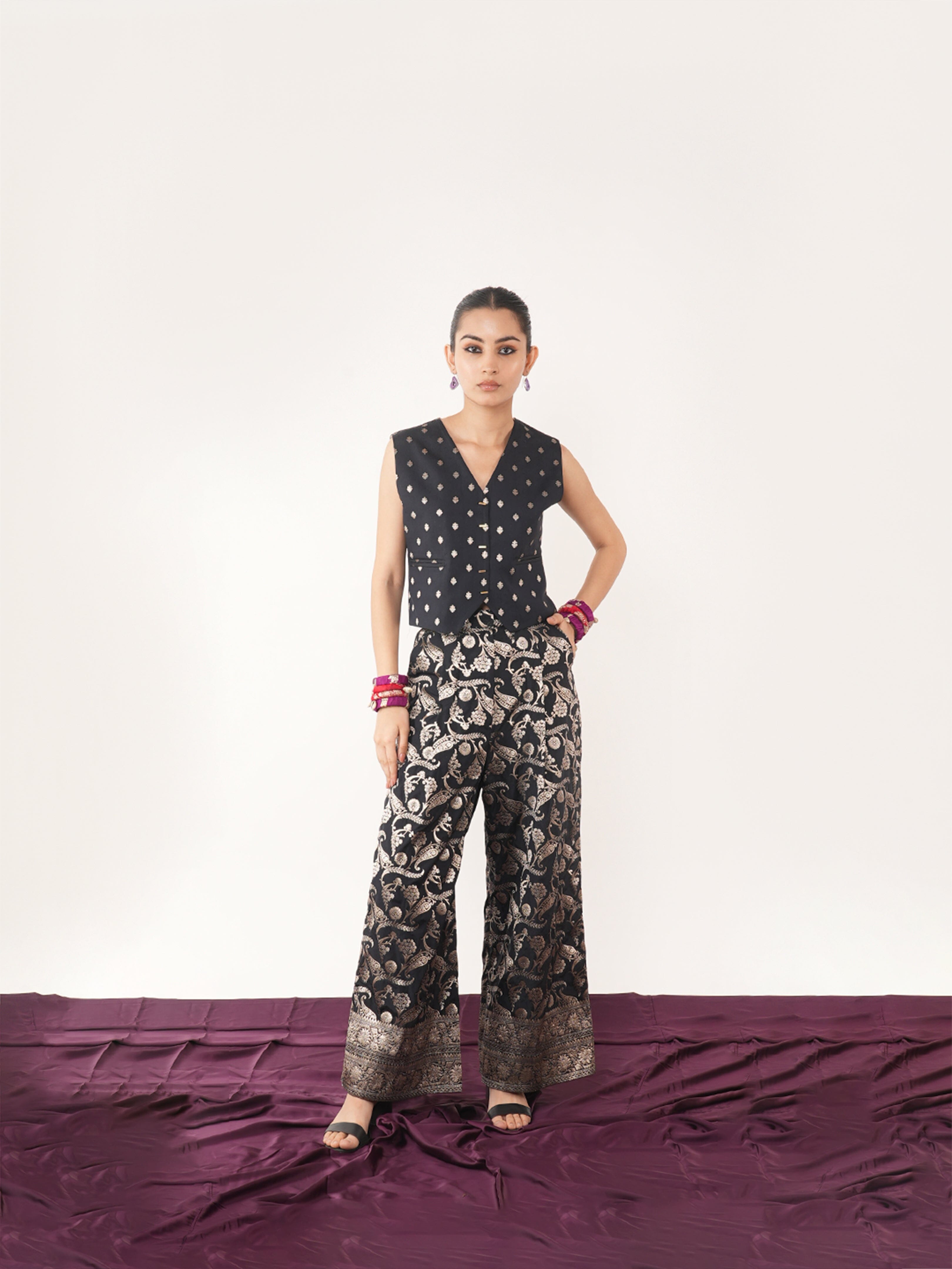 Amyra Black Silk Waist Coat And Pant Set Features a 2pc waist coat and flaire pant. The set is made on the bed of silk weaved with intricate floral jaal motif. The pant of this set has pockets on each side along with back elastic for added comfort.