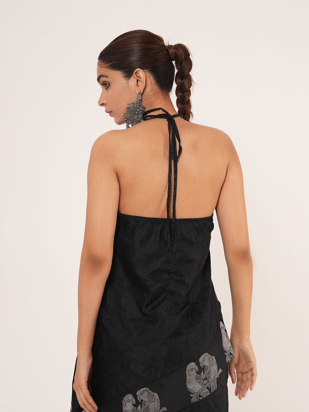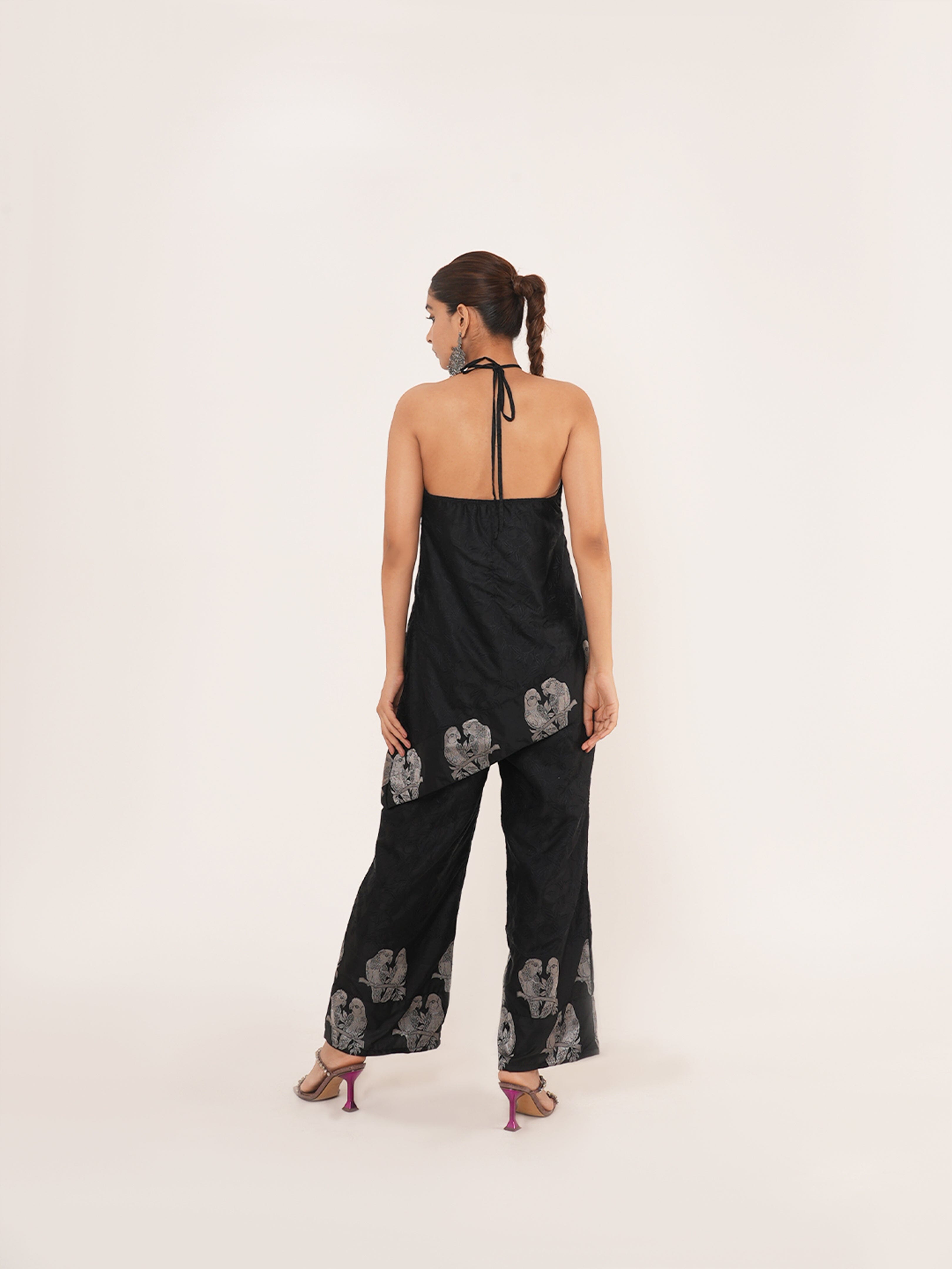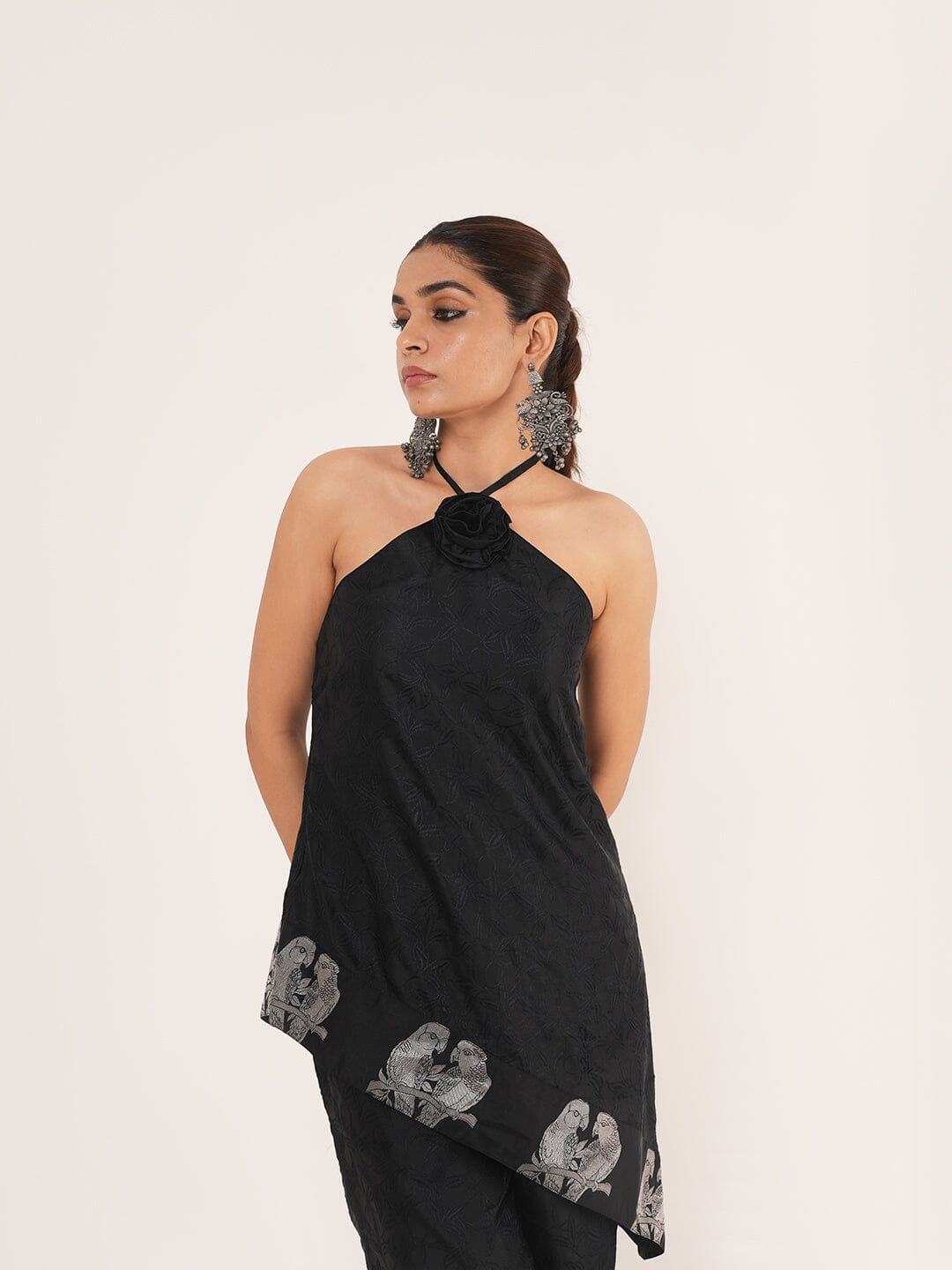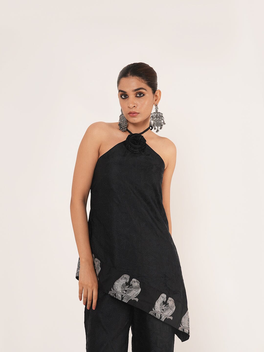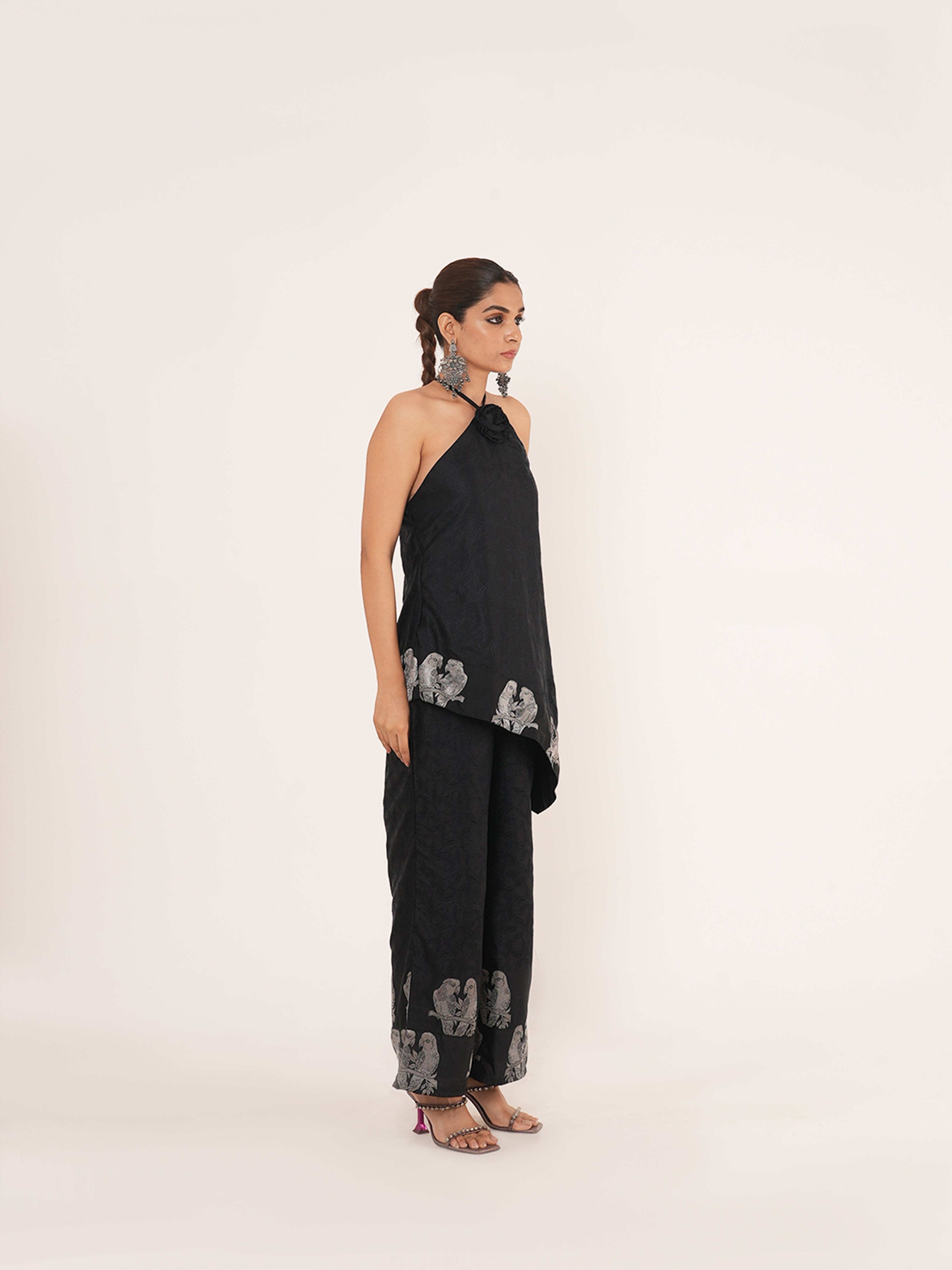 Black Parrot Silk Coord Set features an asymmetrical top with rose applique and a tie knot details. The top is paired beautifully with a flared matching pant which has pockets on each side along with elasticated back for added comfort.