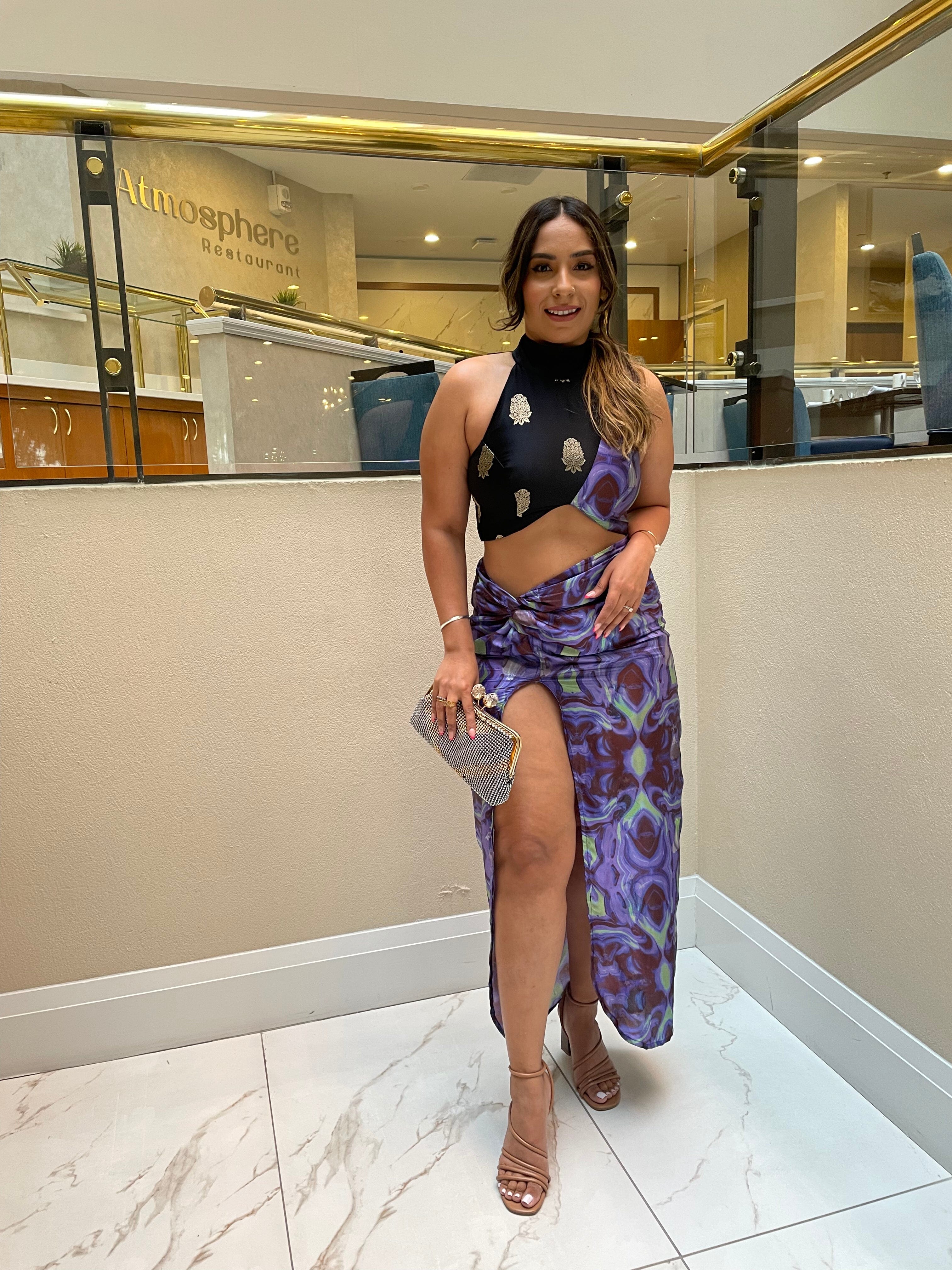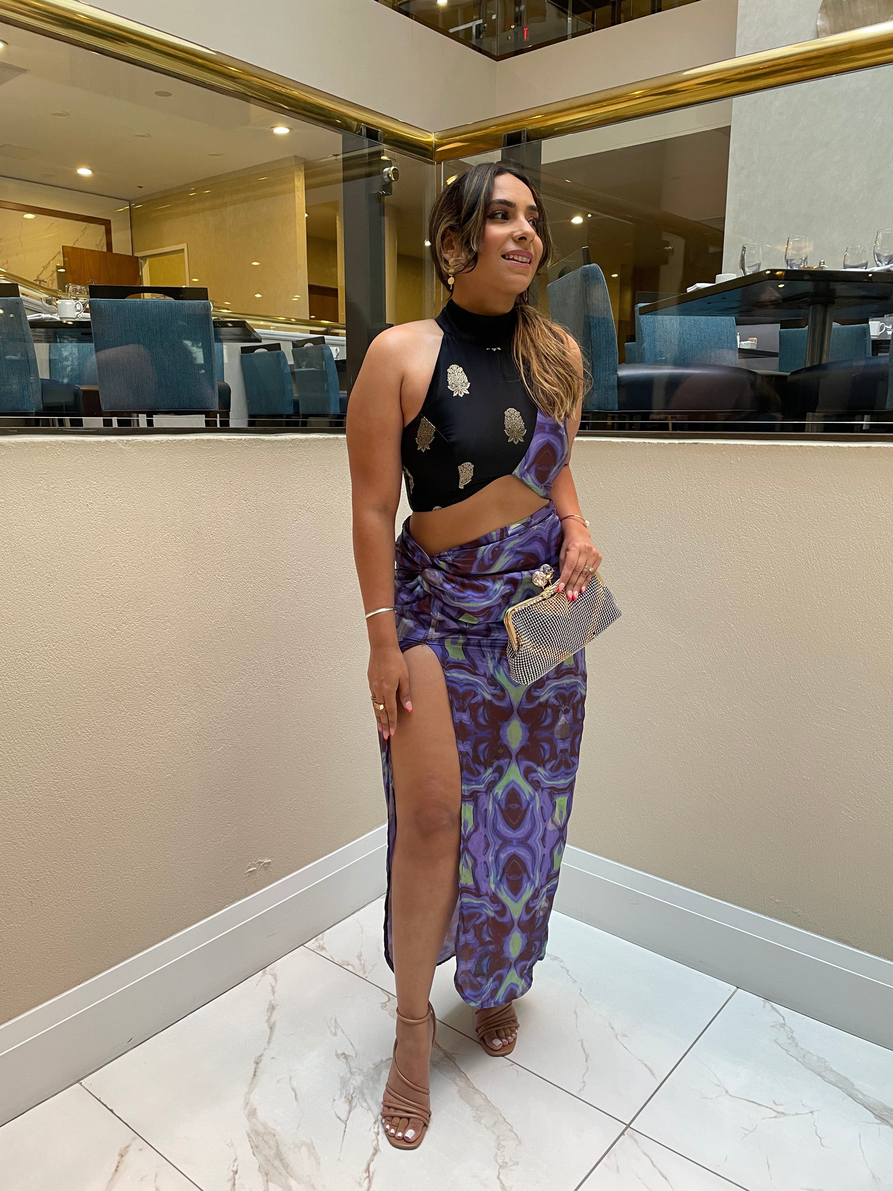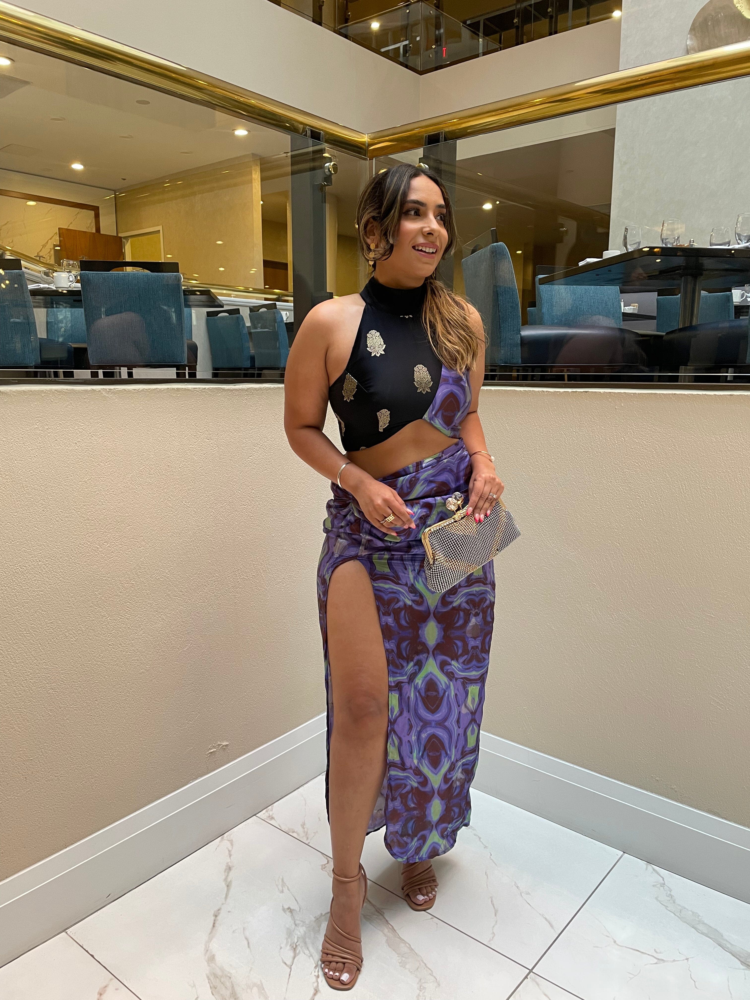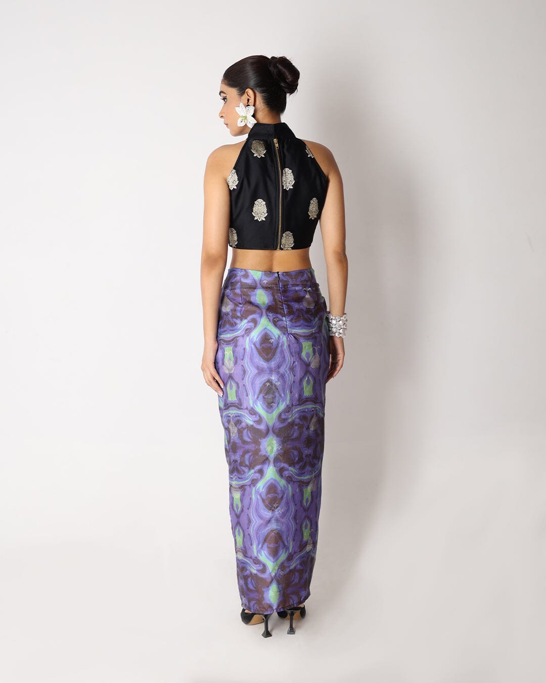 Embrace celestial elegance with our Galaxy Print Twist knot Skirt featuring a thigh high slit, paired with a Black Half and Half Halter Top. Crafted from banarsi silk fabric, this stunning ensemble merges galactic charm with sophisticated style.