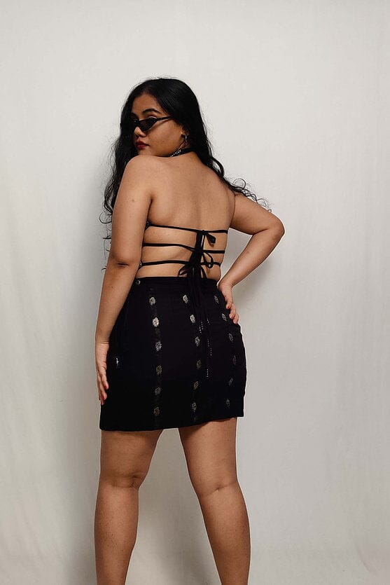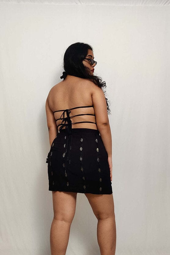 Strut out in the Kala Jamun Crop, our black and silver, strappy number that can take you from a simple brunch to a big boogie night seamlessly. A 9-year-old vintage saree with silver zari brocade is reused and given a brand new life as a versatile crop top. A silver jewellery replication is expressed in the choker-style halter design. It’s giving traditional, it’s giving Berlin fashion, darling.