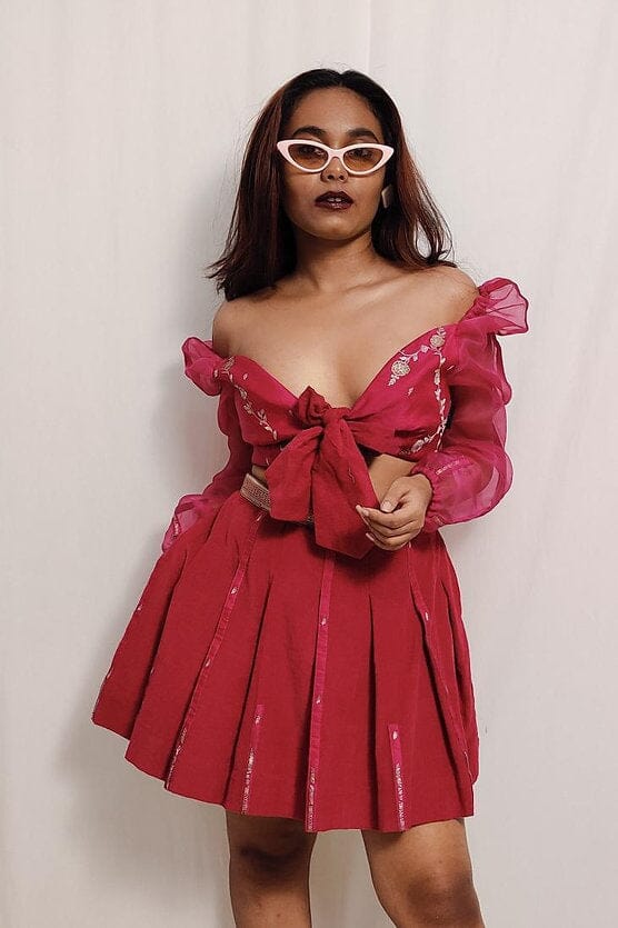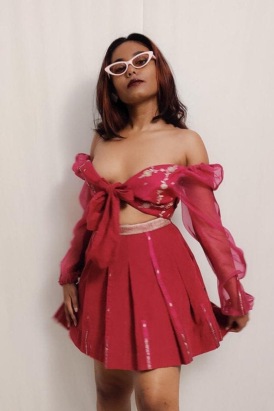 We upcycled a 9 years old silver zari, hot pink Banarasi sari to make a puffed sleeves blouse with front opening knot and a cute pleated skirt. Dress it up with heels or lay low with sneakers for, this ensemble is a choice for the environment & fashion conscious being.
