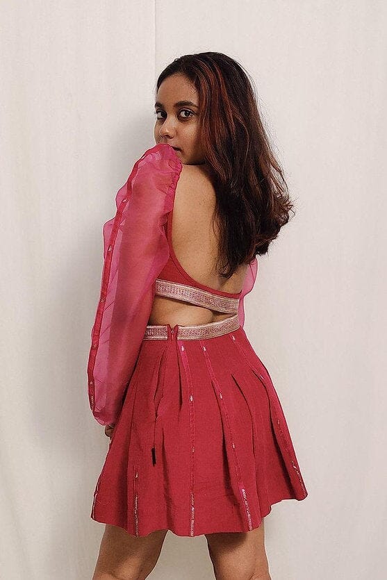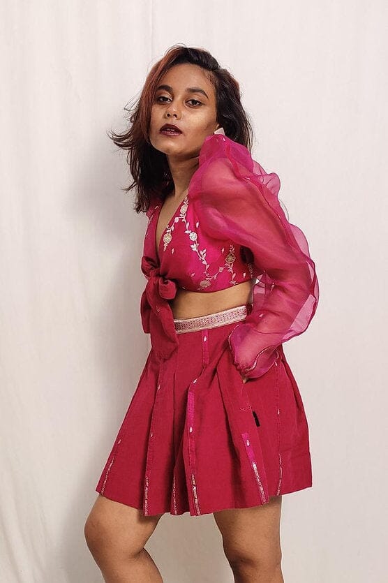 We upcycled a 9 years old silver zari, hot pink Banarasi sari to make a puffed sleeves blouse with front opening knot and a cute pleated skirt. Dress it up with heels or lay low with sneakers for, this ensemble is a choice for the environment & fashion conscious being.