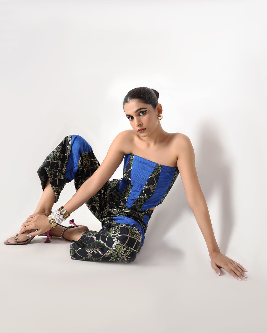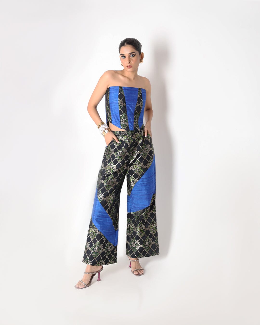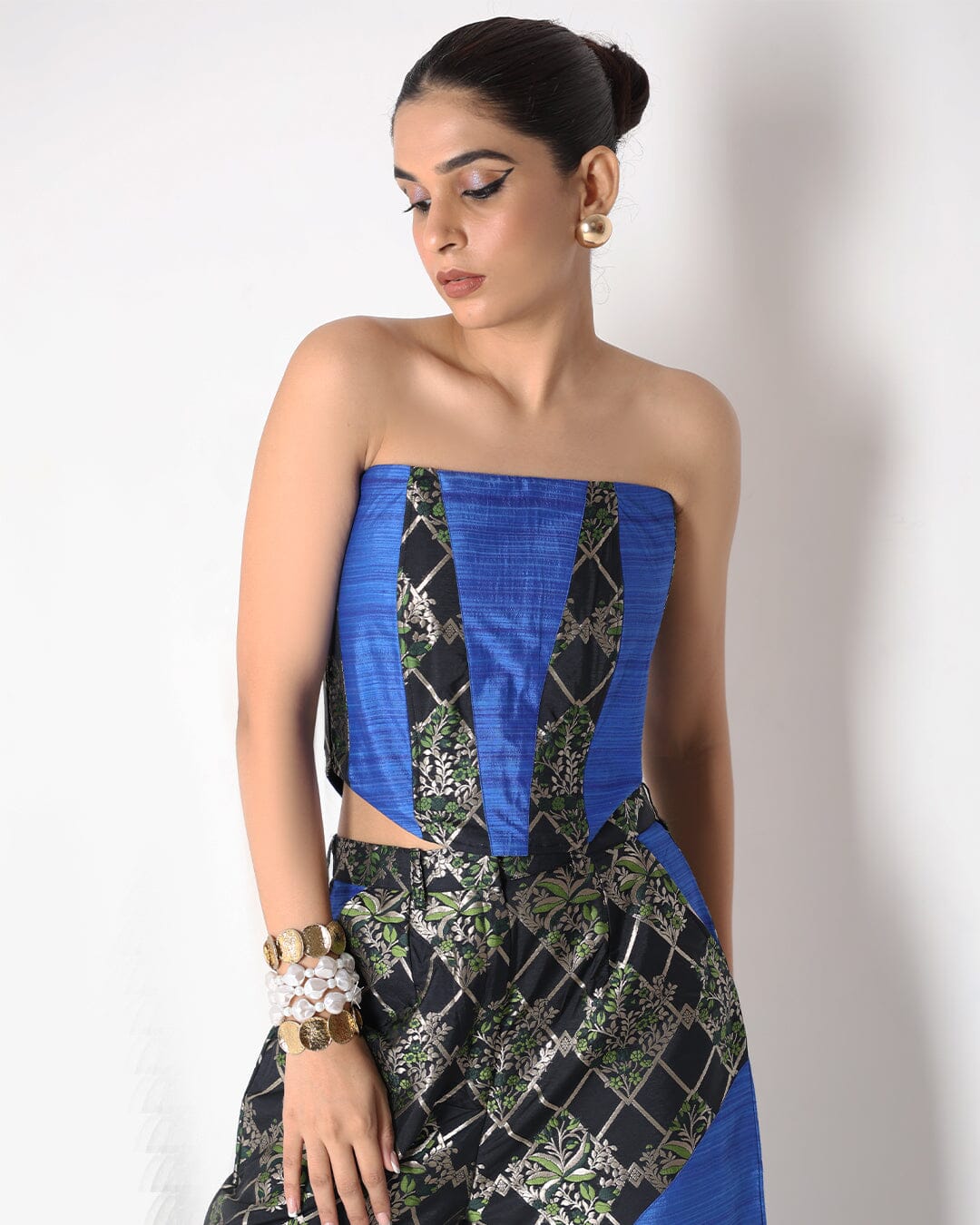 Make a bold fashion statement with our Blue and Black Silk Patchwork Corset and Pant Set. Crafted from luxurious banarasi silk, this coordinated ensemble showcases stunning patchwork detailing, combining elegance and edginess for a captivating look. The pant come with back elastic for that added comfort.