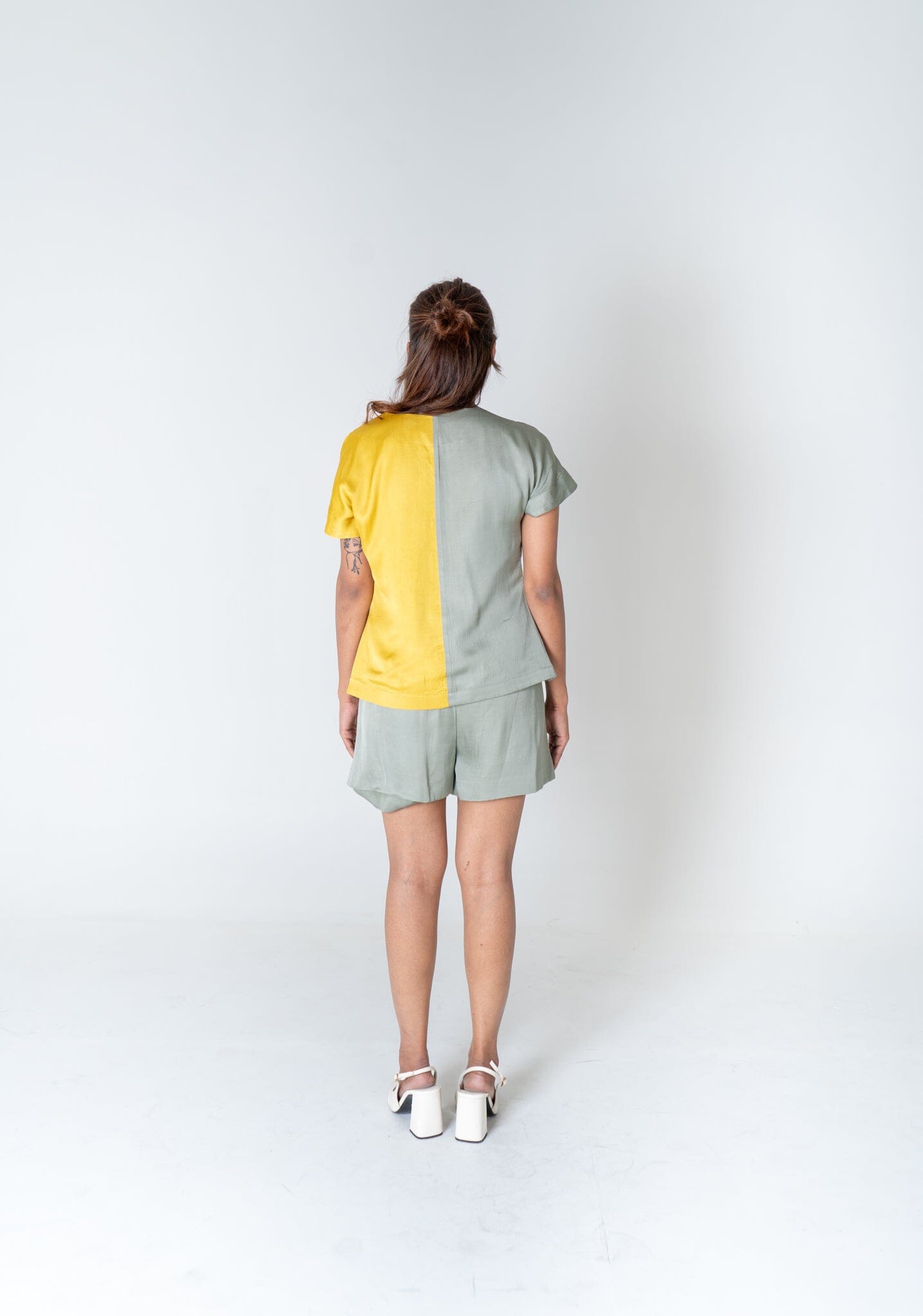 Green-Yellow Short Co-ord Set; Shorts and Shirt with button detailing