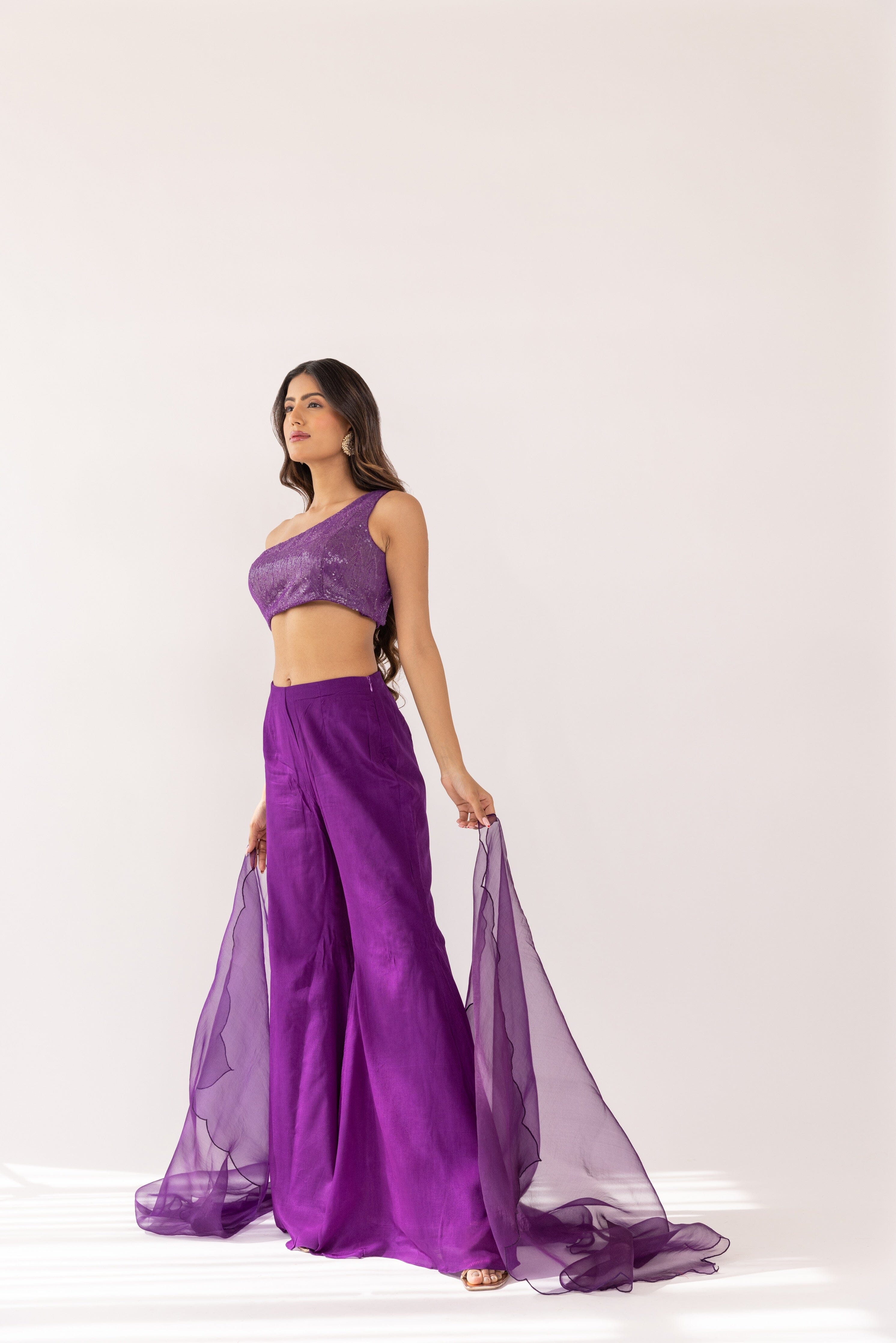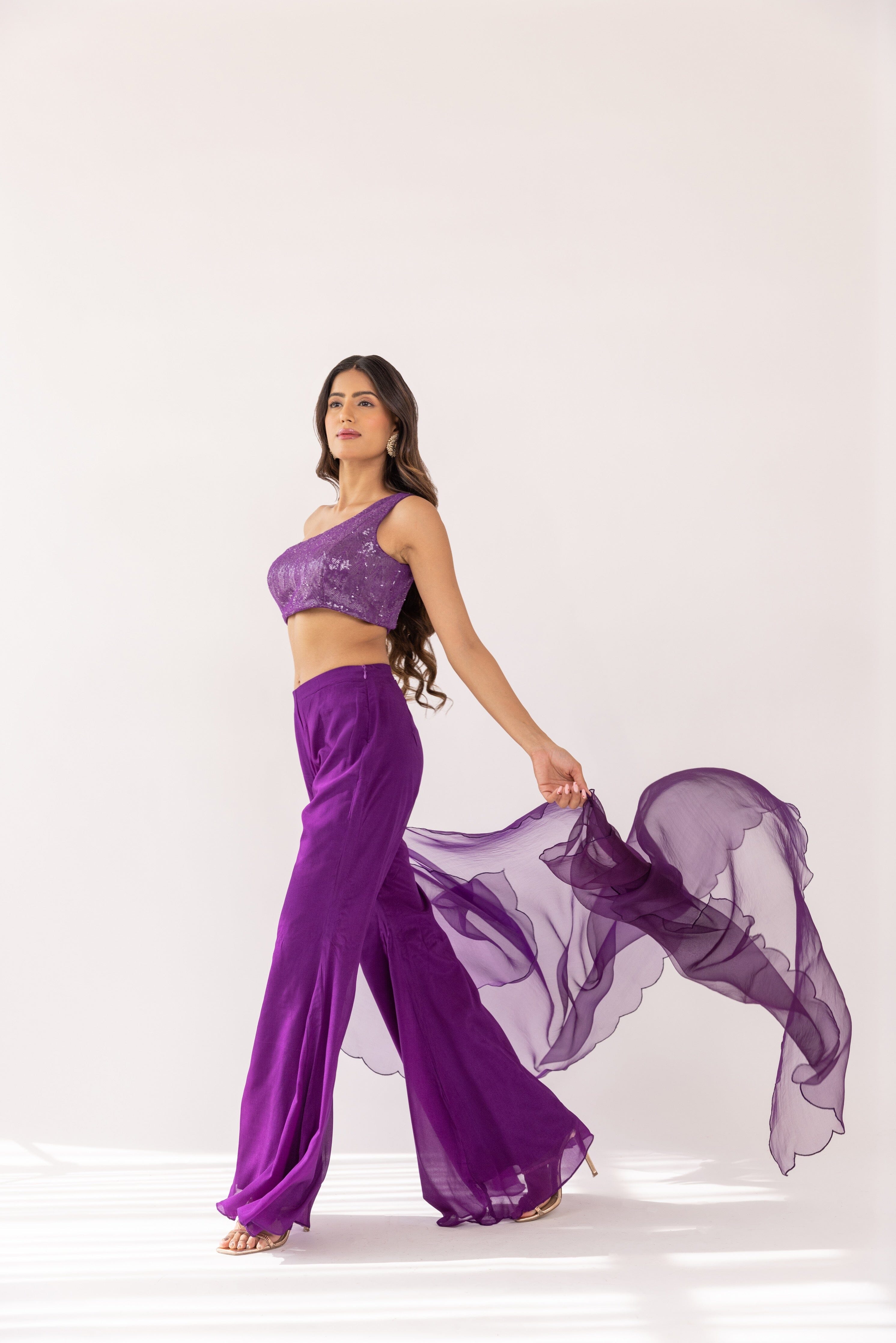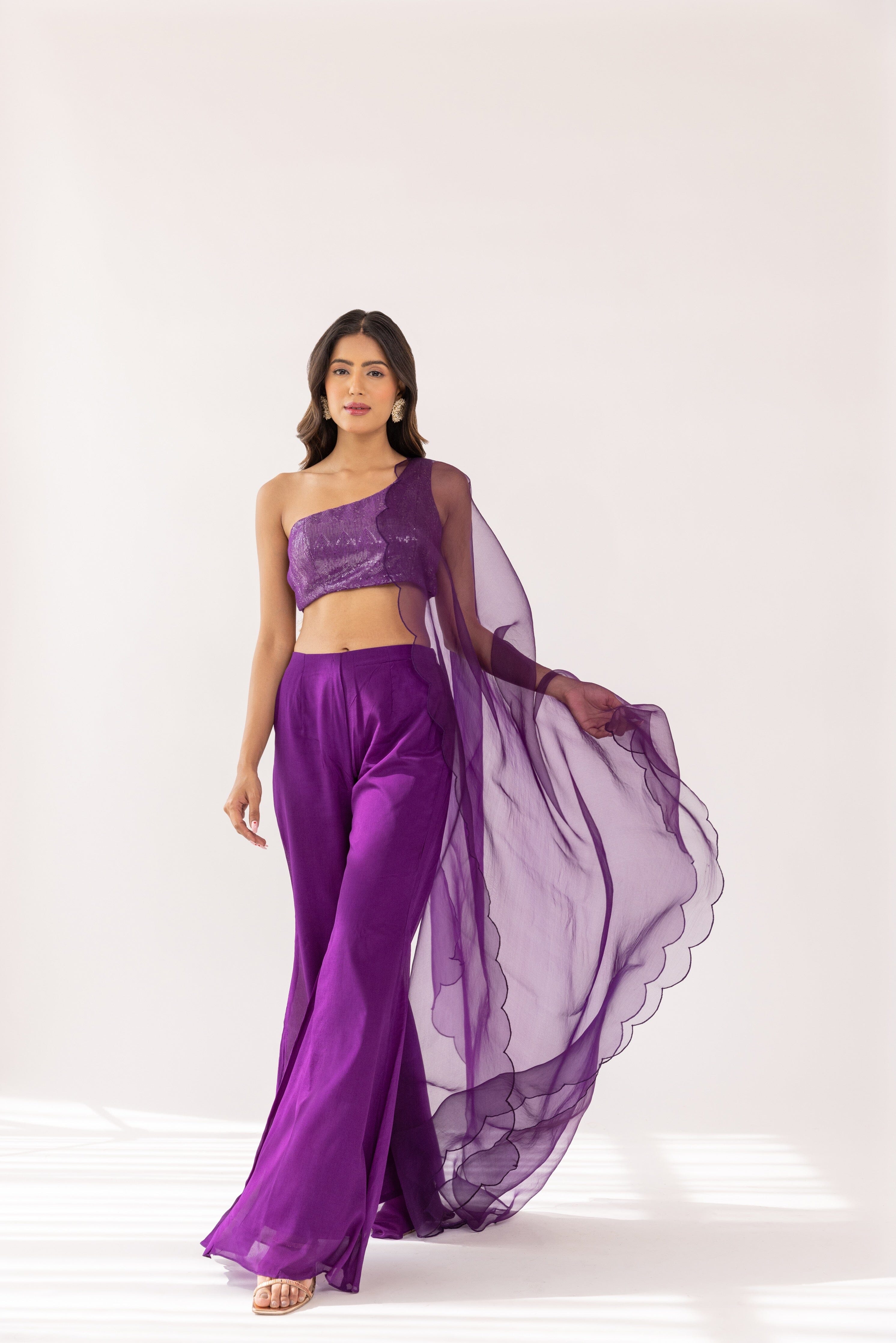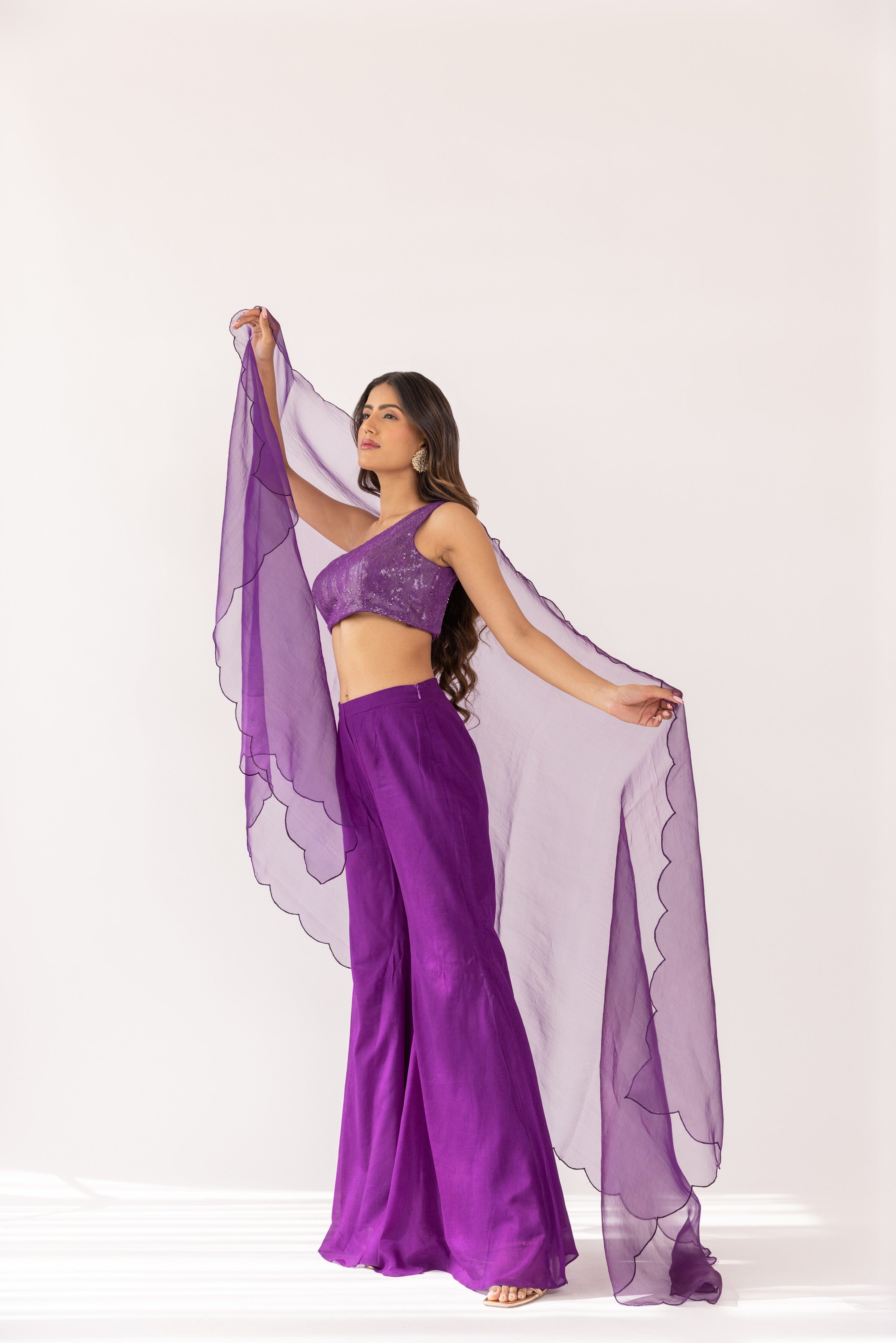 Featuring a one shoulder sequin blouse paired with a solid crepe flared sharara pants and organza dupatta detailed with scalloped edges.