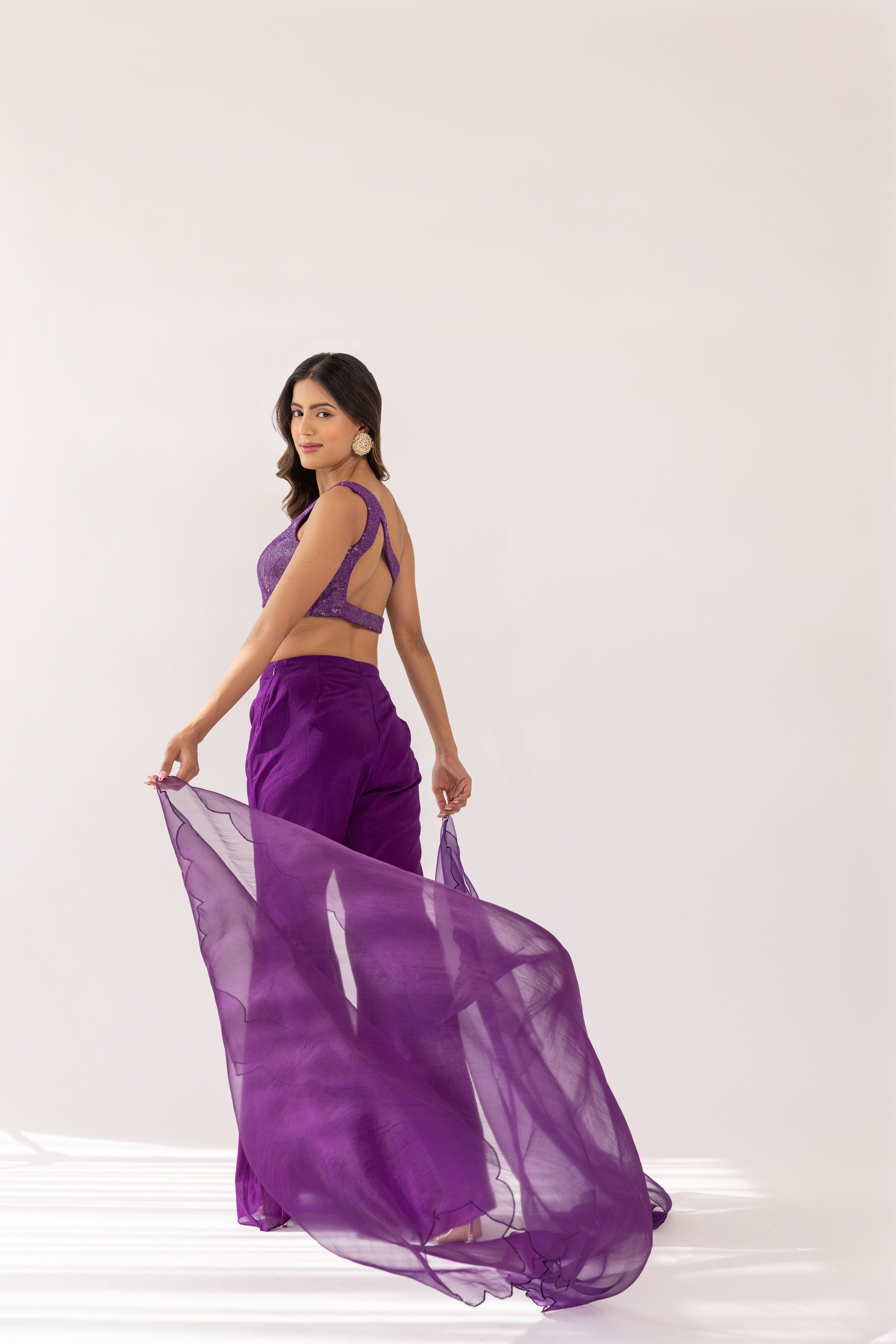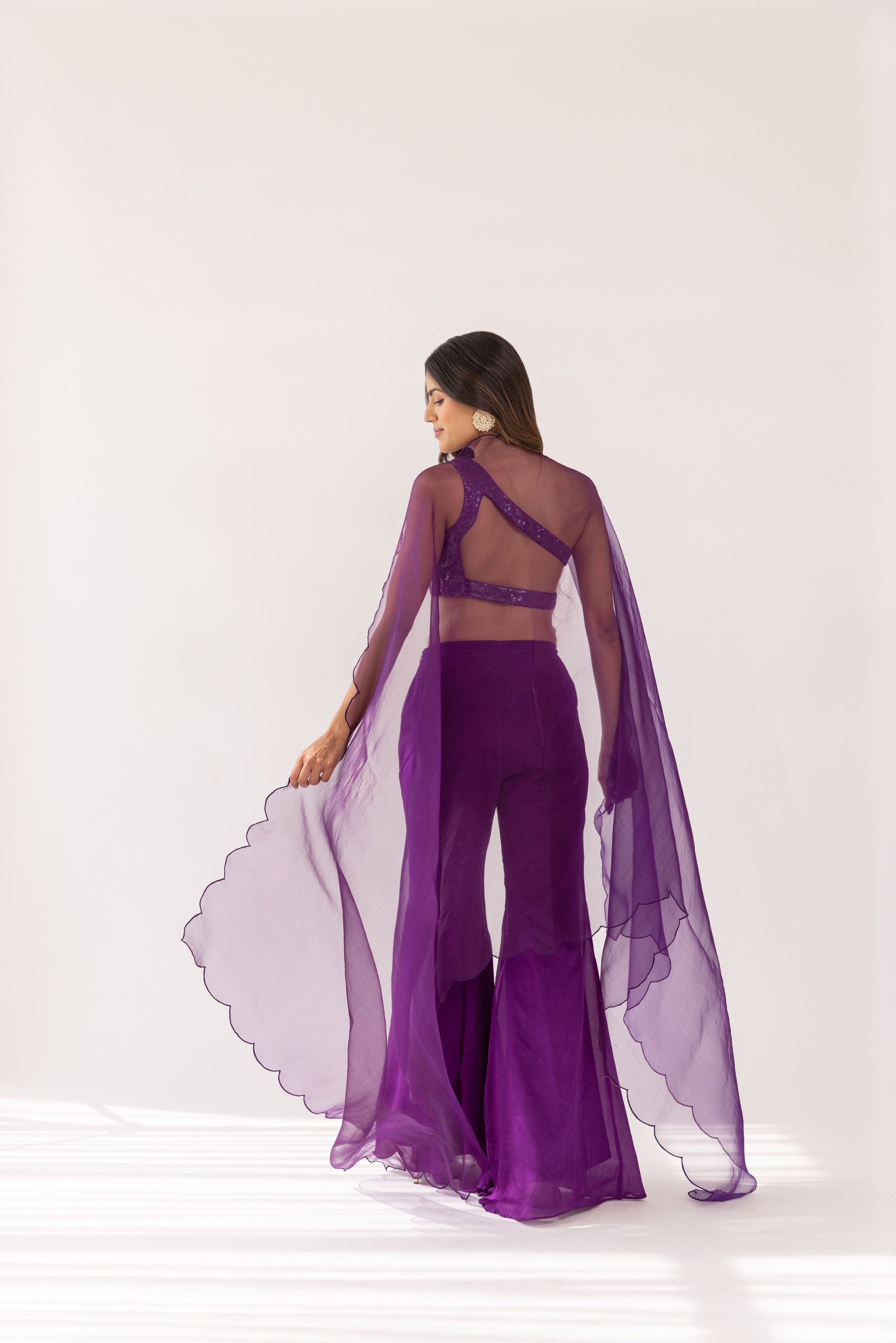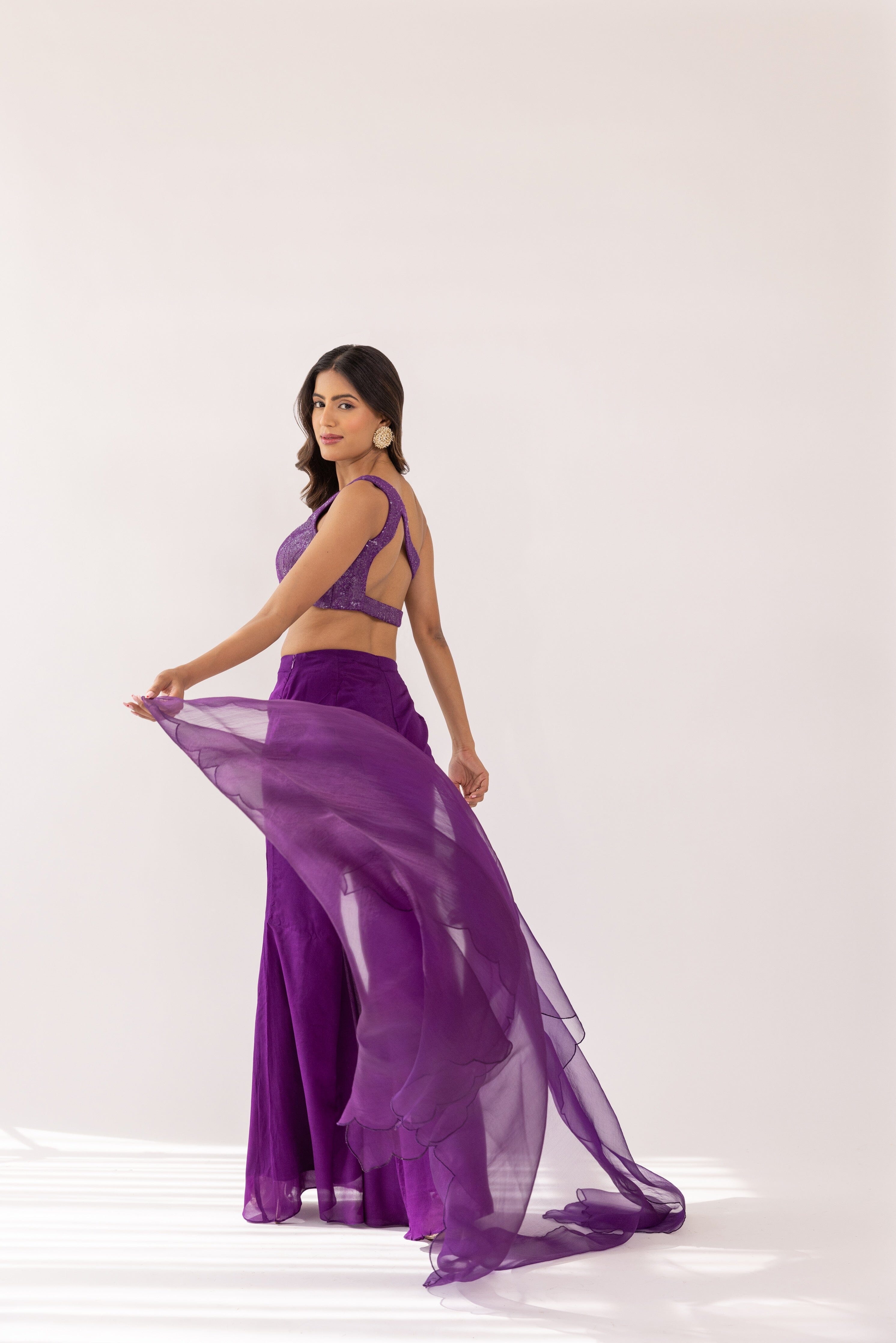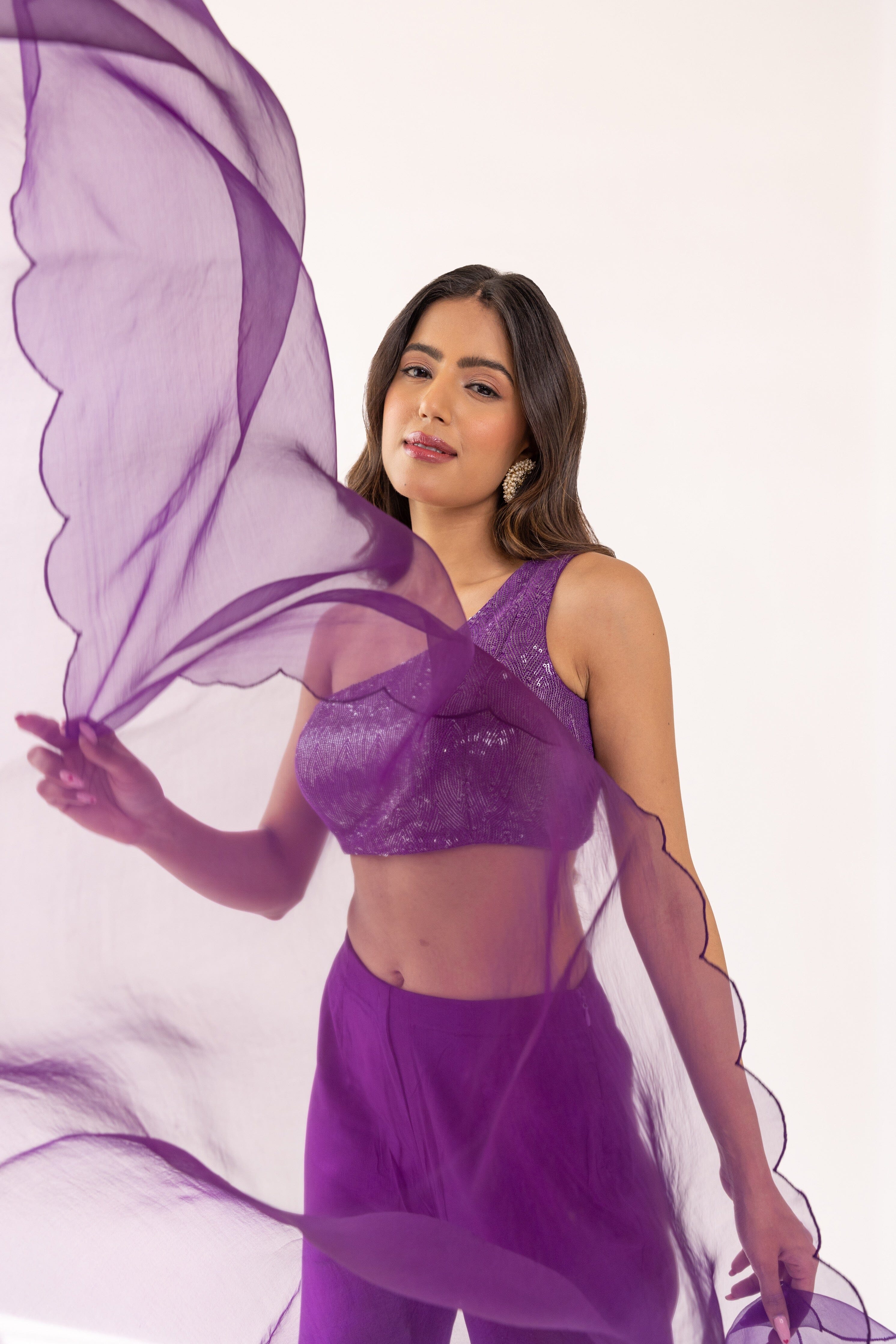 Featuring a one shoulder sequin blouse paired with a solid crepe flared sharara pants and organza dupatta detailed with scalloped edges.