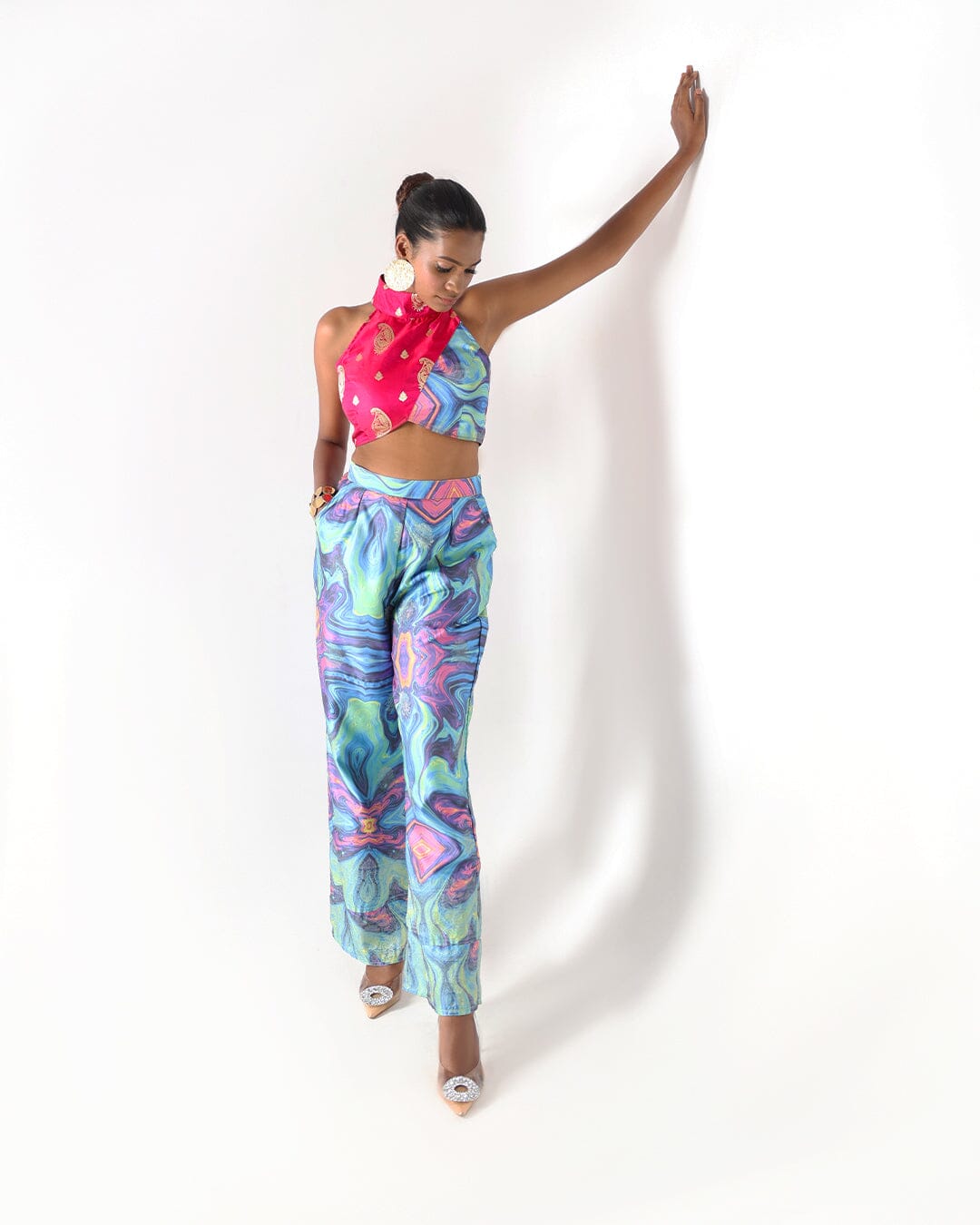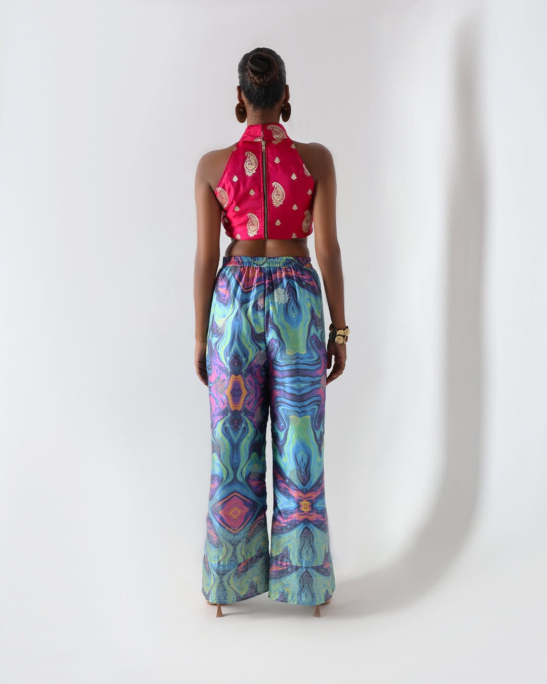 Make a fashion statement with our Holographic and Pink Coord Set. Crafted from exquisite banarasi silk fabric, this set combines the futuristic appeal of holographic print with a soft pink hue, creating a mesmerizing and coordinated ensemble that radiates elegance and charm. The Pant comes with back elastic for that added comfort.