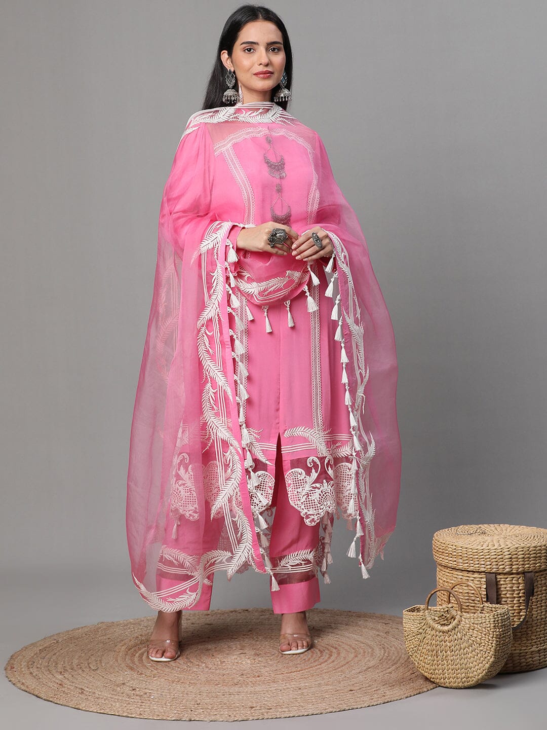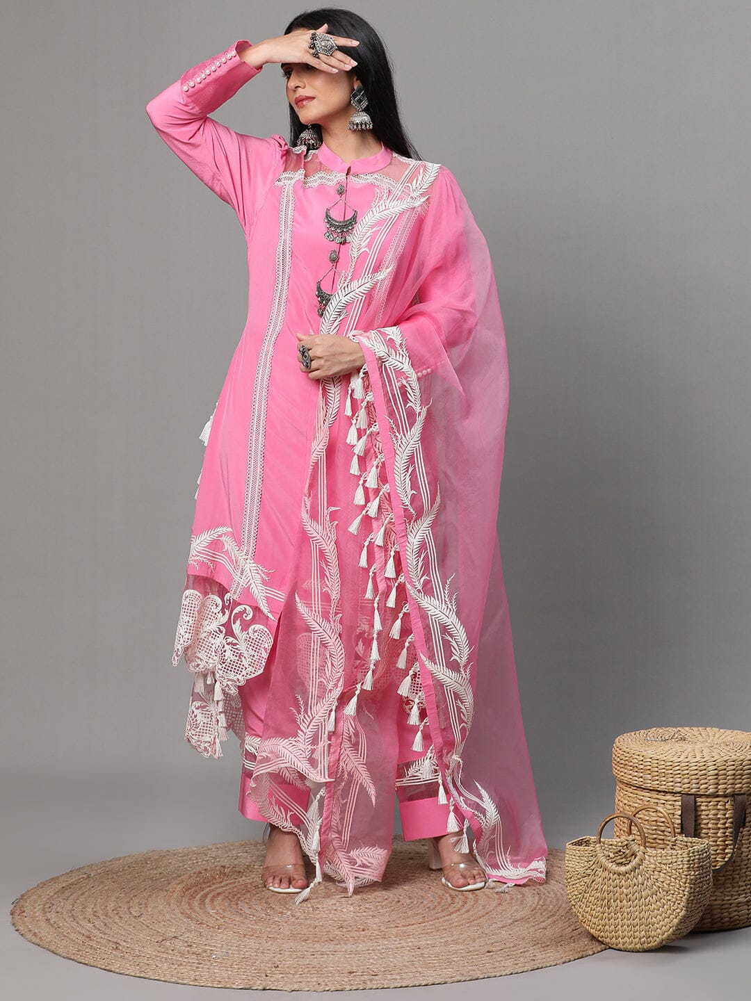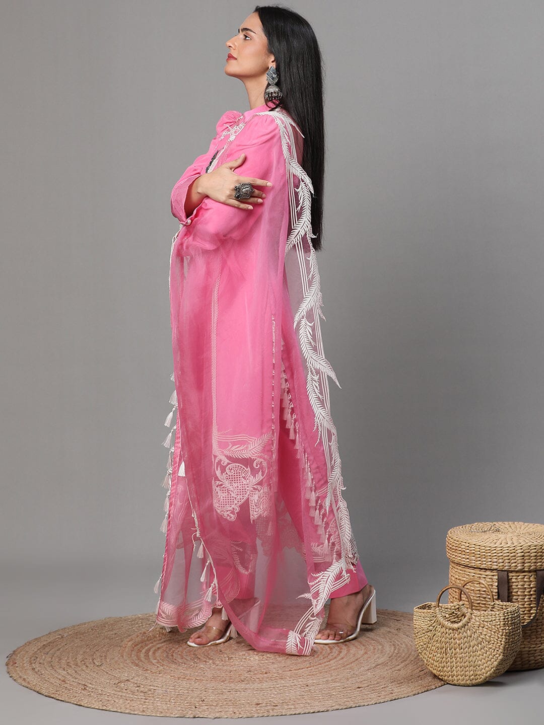 Pink Colour Suit With Organza Dupatta, Pants, White Cutwork