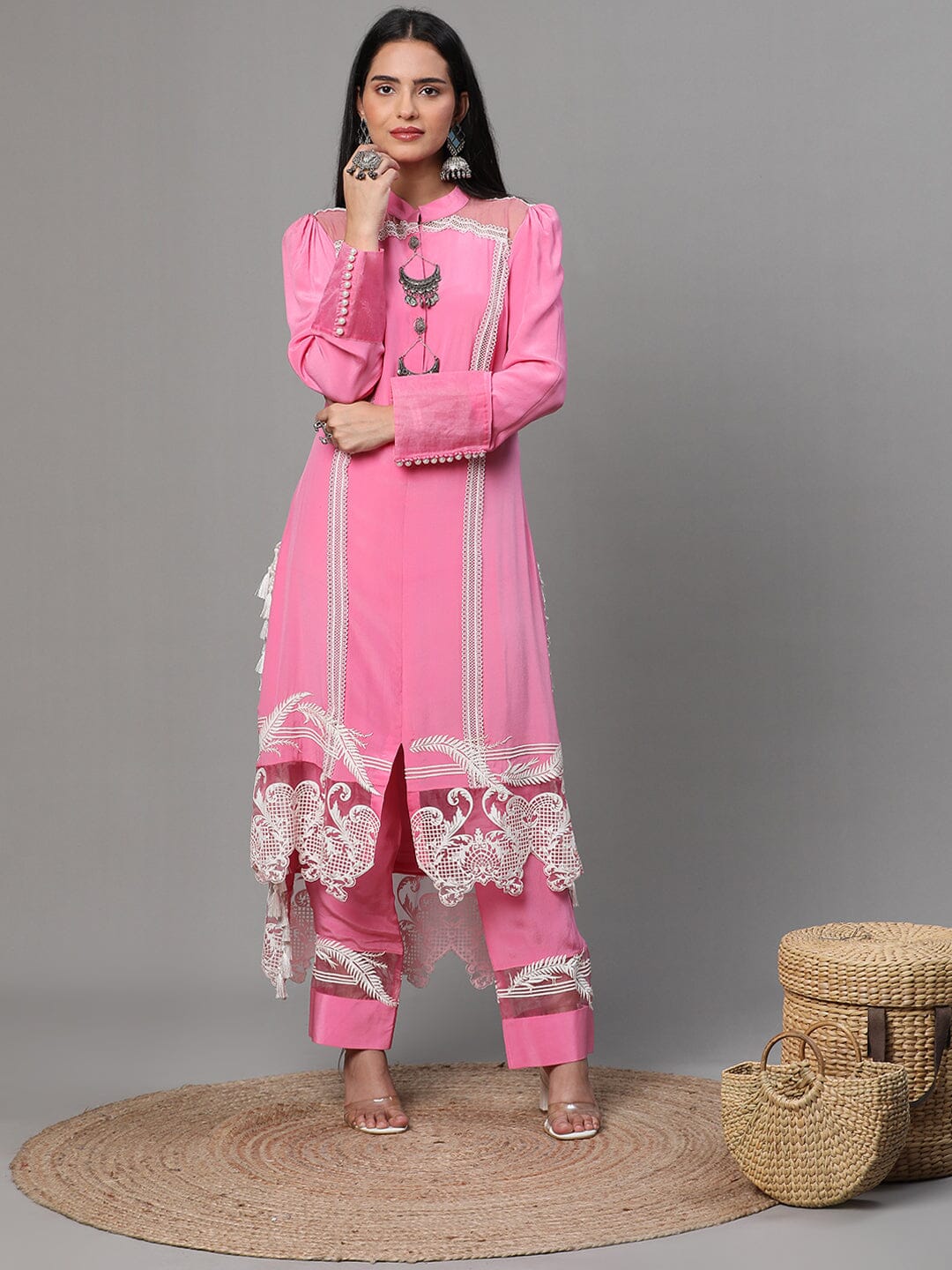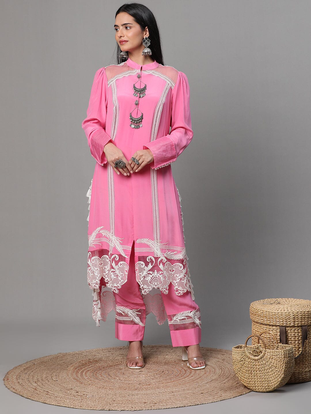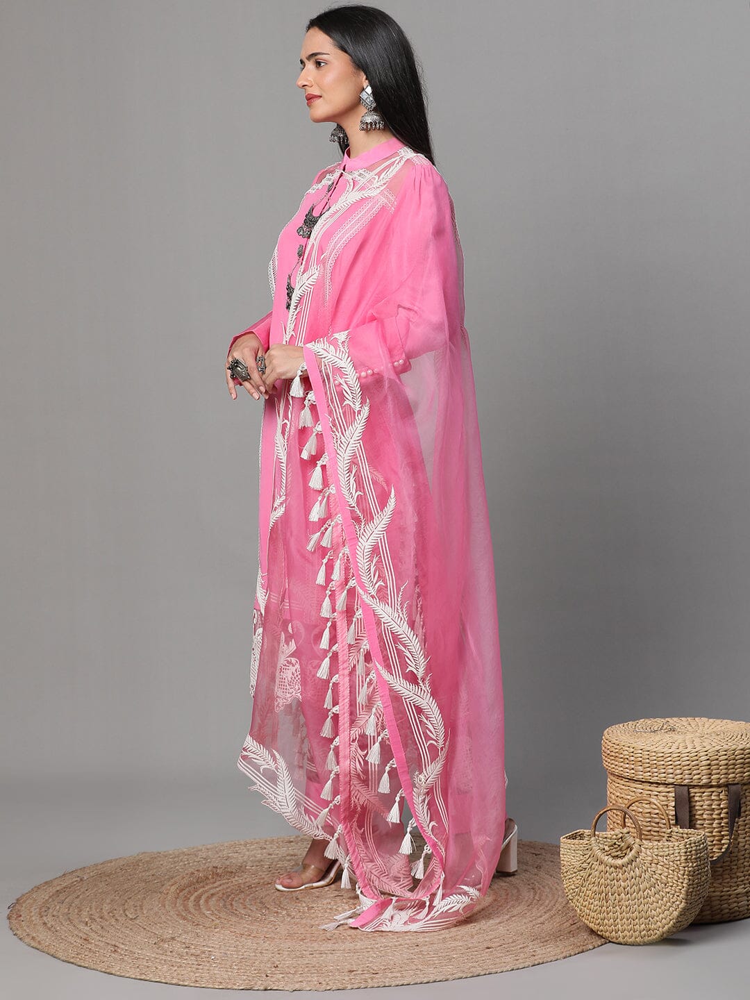 Pink Colour Suit With Organza Dupatta, Pants, White Cutwork