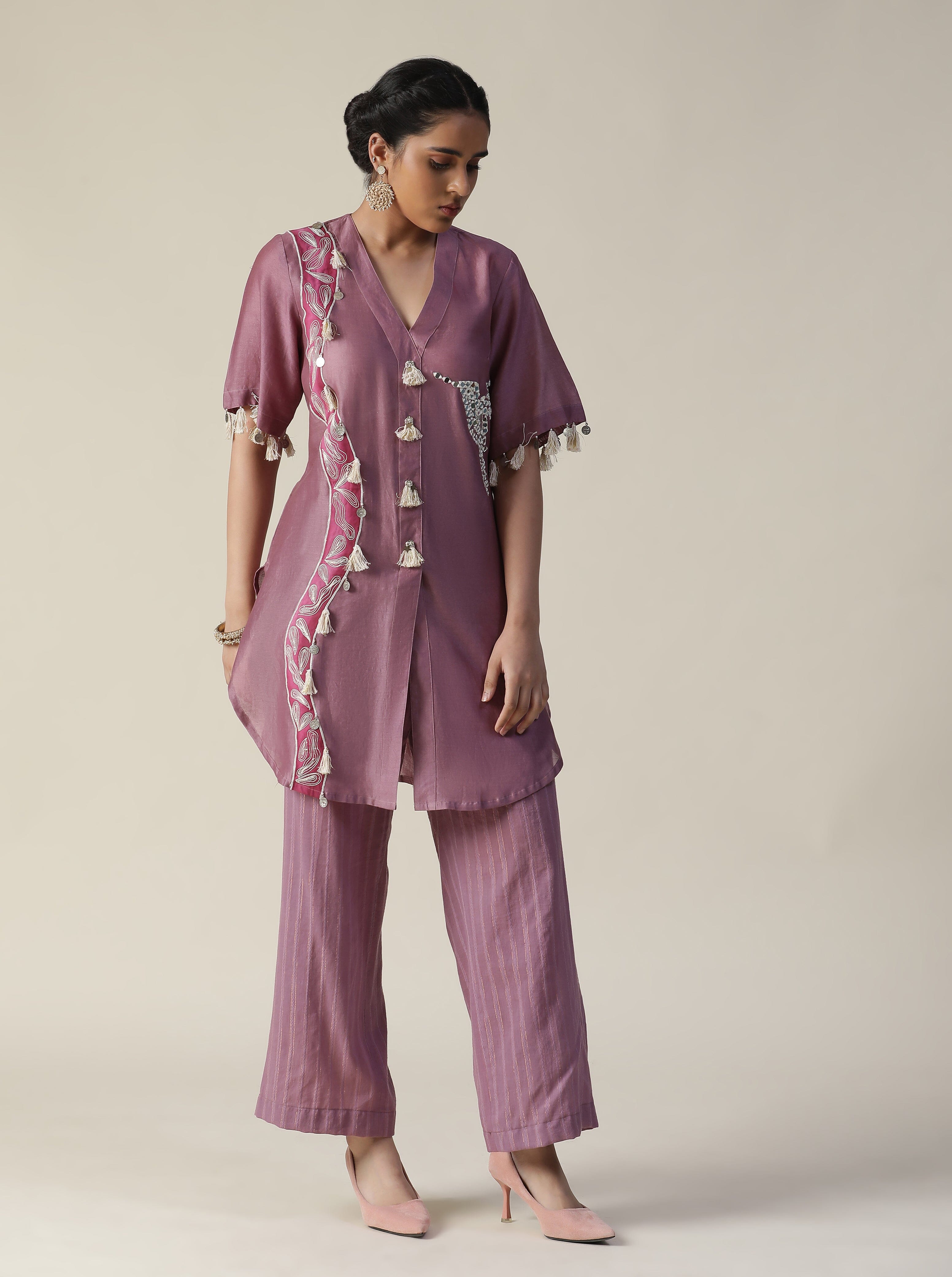 Featuring our rosy mauve hand painted cord set. comes with a v-neck & half sleeve straight thigh length kurti with one side thread, tassel work on handpainted patch & other side a single bird motif using resham & mirror. Along with tassels & silver coins work at sleeve and center front. And a lurex straight pant.