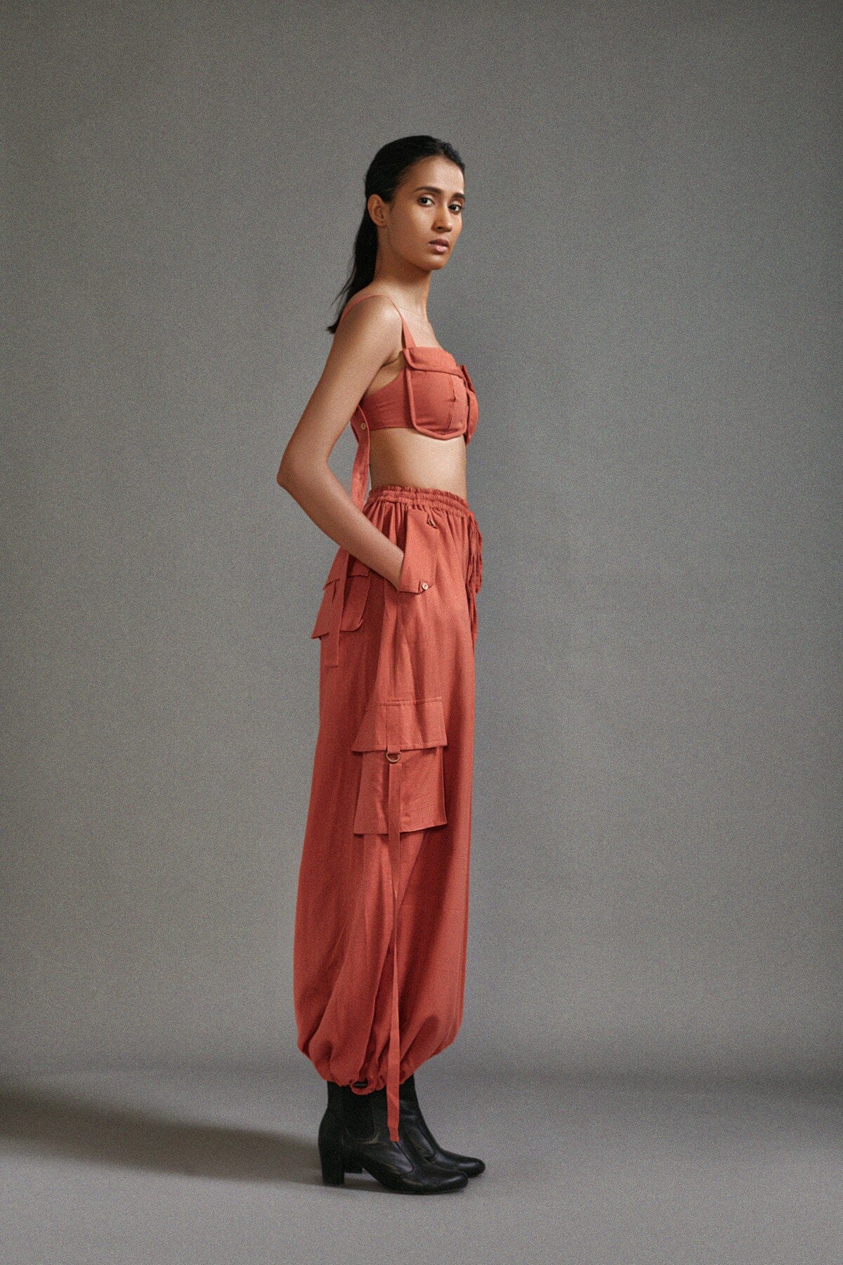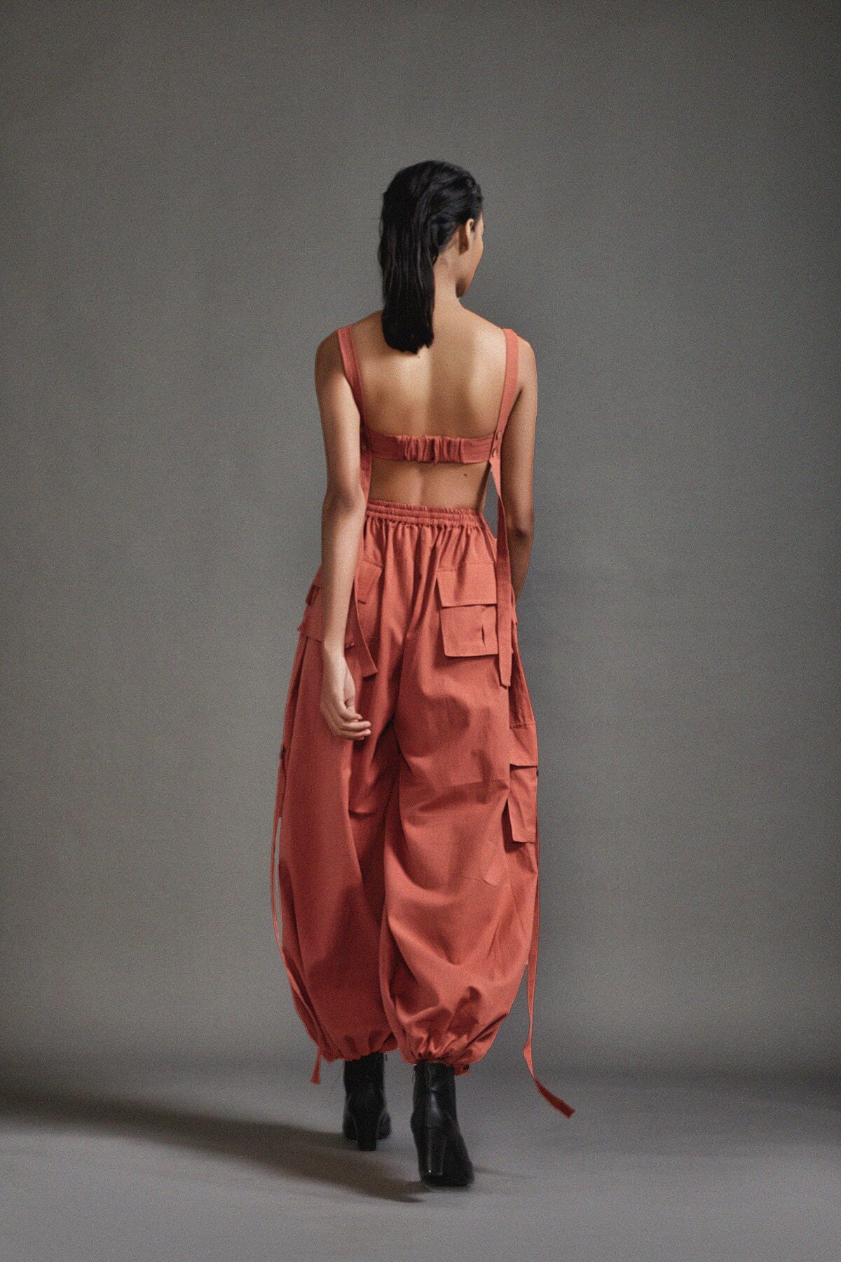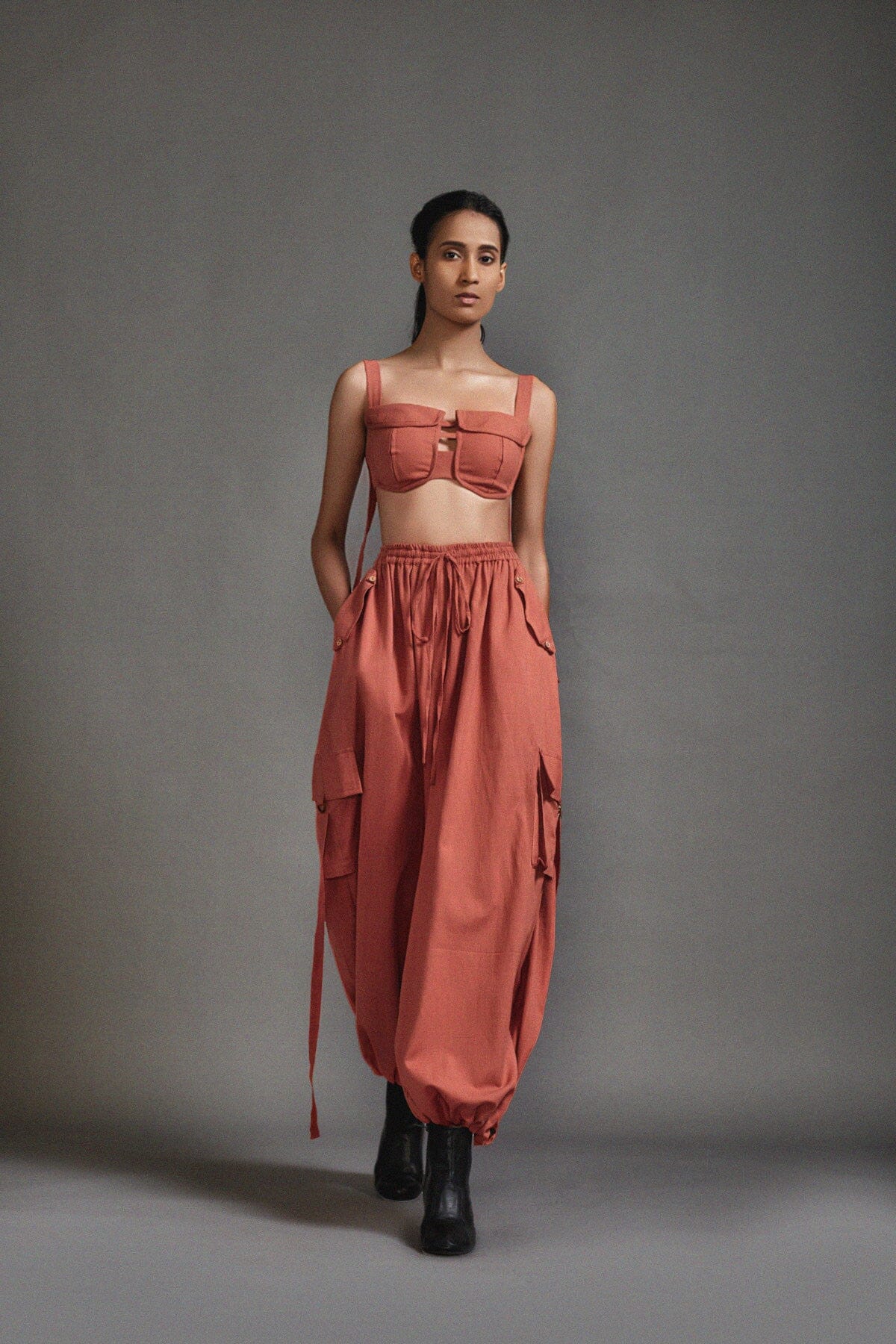 A set of well-fitted pocket corsets with adjustable straps and elastic back with Baggy-fit cargo pants with side pockets and elastic back.