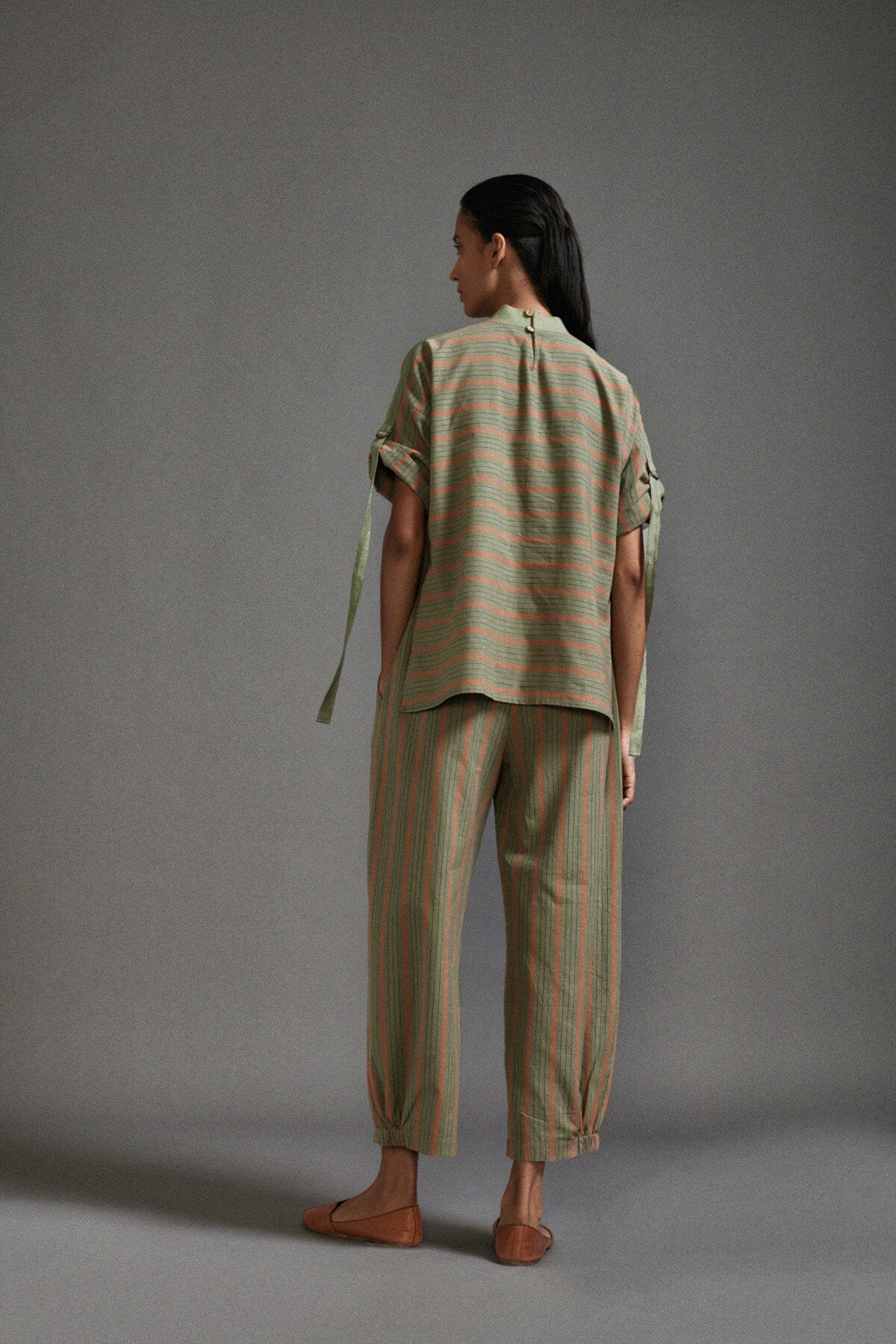 A set of Striped hig-low top with Ribber Collar and Strap with Smart casual striped pants with fully elastic waist, gathered botton and pockets