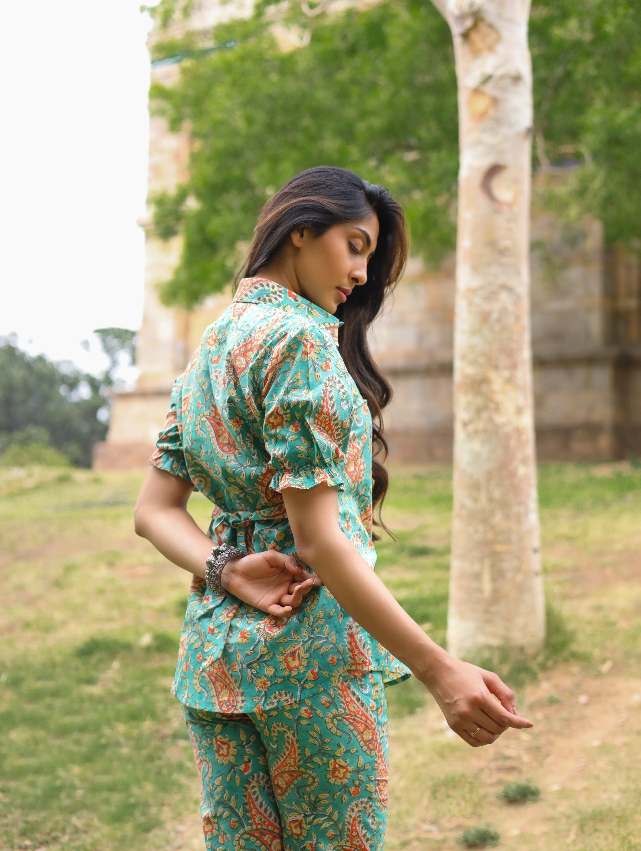 A beautiful 2 pc set with Pants in Green Block Printed fabric!The sleeves are short length with puff detailing. The pants are cropped. The Pant have a fixed waistband and back elastic.