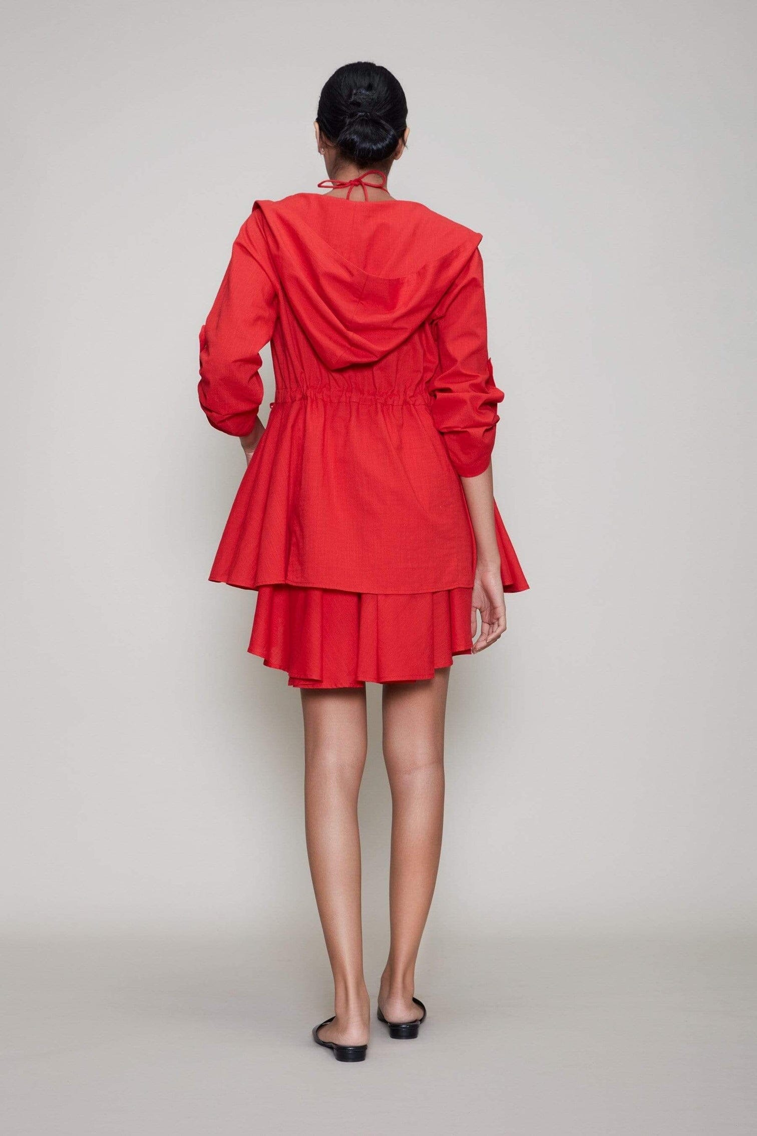 A smart hooded jacket with a circular cut and drawstring at the waist. Wear it with our halter veza dress and complete the look